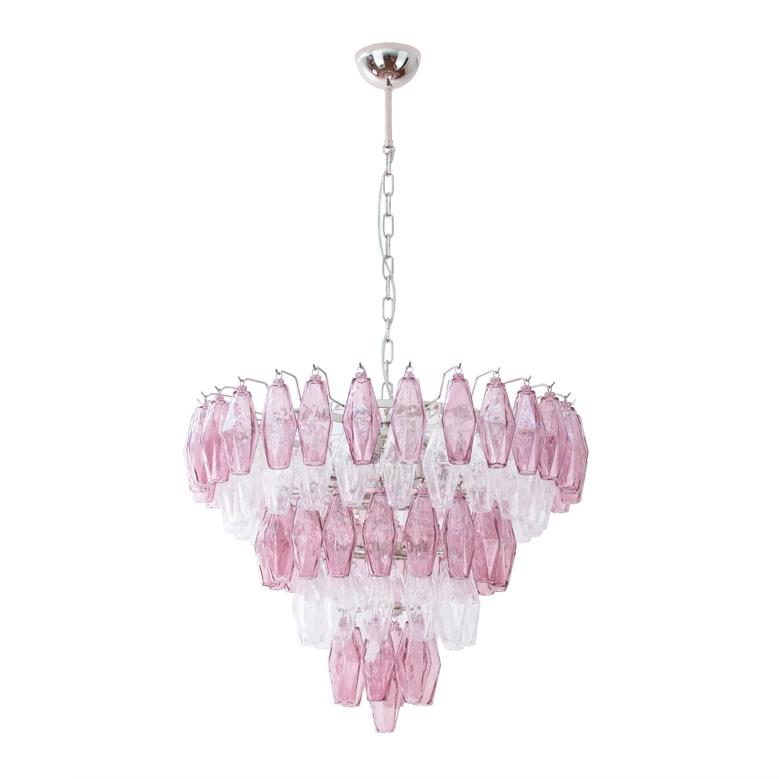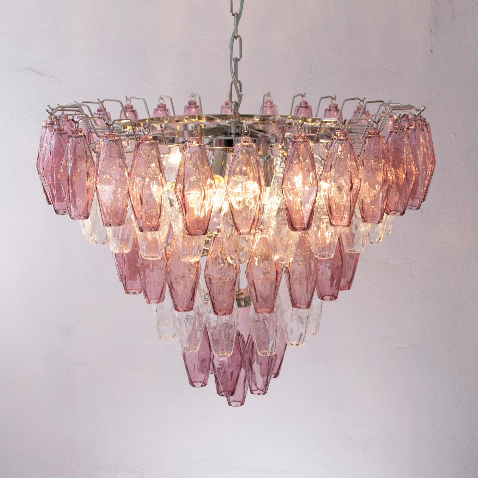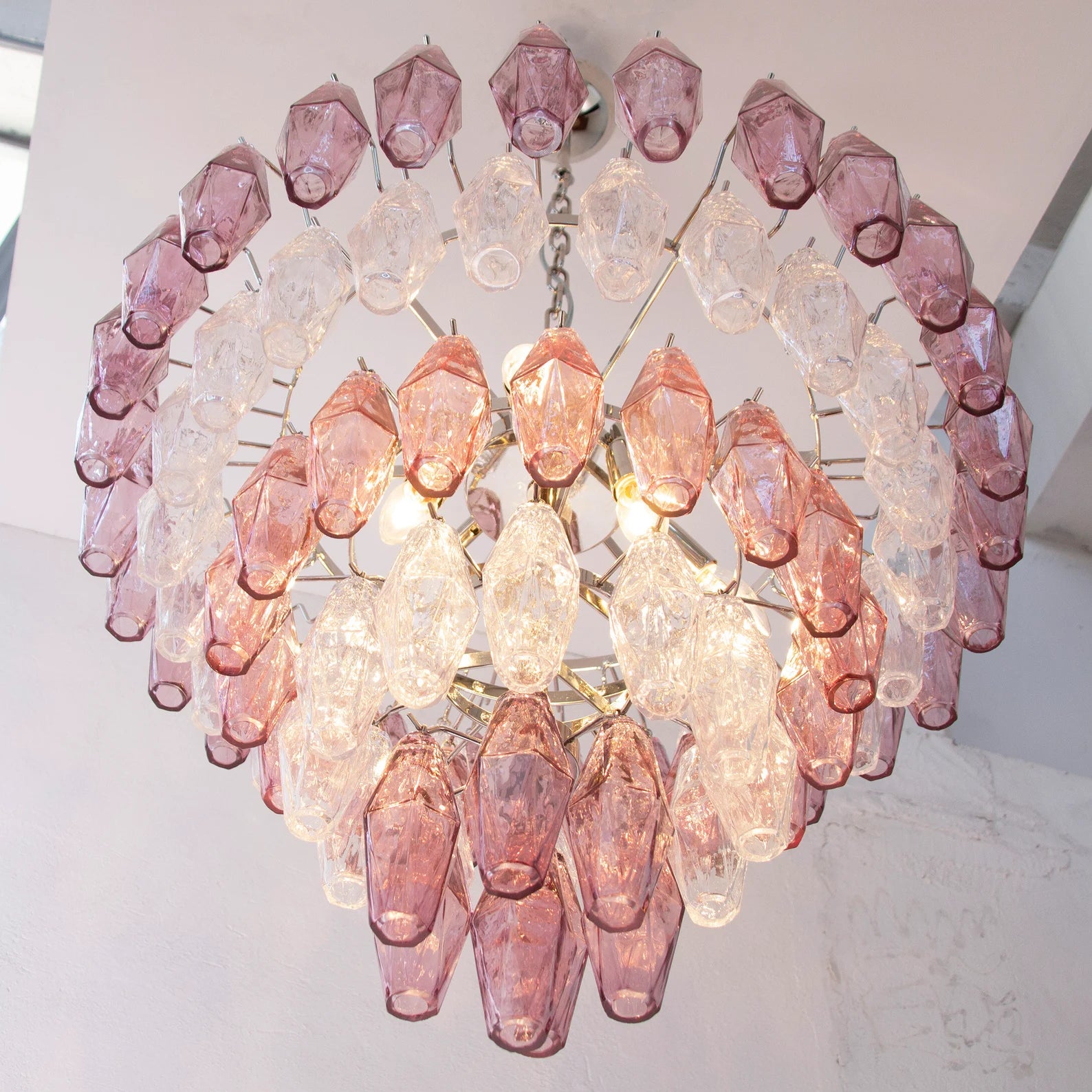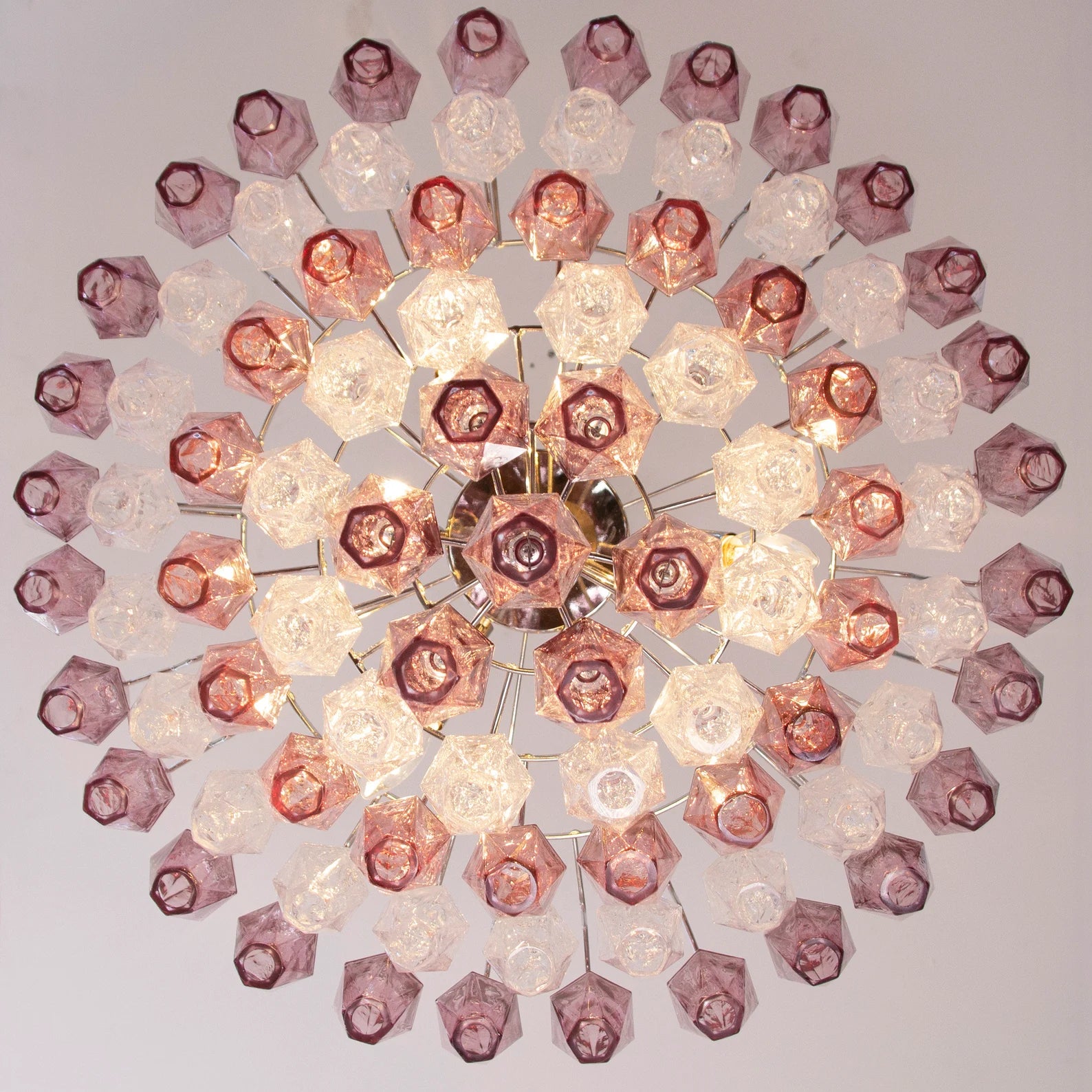 Spesifikasjoner: • Håndlaget i Murano, Italia • 100+ polyeder-glass + reservedel inkludert • Farge: Amethyst og Clear (andre farger på forespørsel) • Størrelse: Ø75 × H65 cm + justerbar kjetting (opptil 50 cm) • Vekt: ca. 25 kg • Materialer: Blåst glass, messing/stål • Ramme: Nikkel eller messing (valgbar finish) • Lyskilder: 6 × E12/E14 (ikke inkludert) • Rammen leveres ferdig montert – glasspendler henges på ved mottak • Kjetting og takrosett inkludert