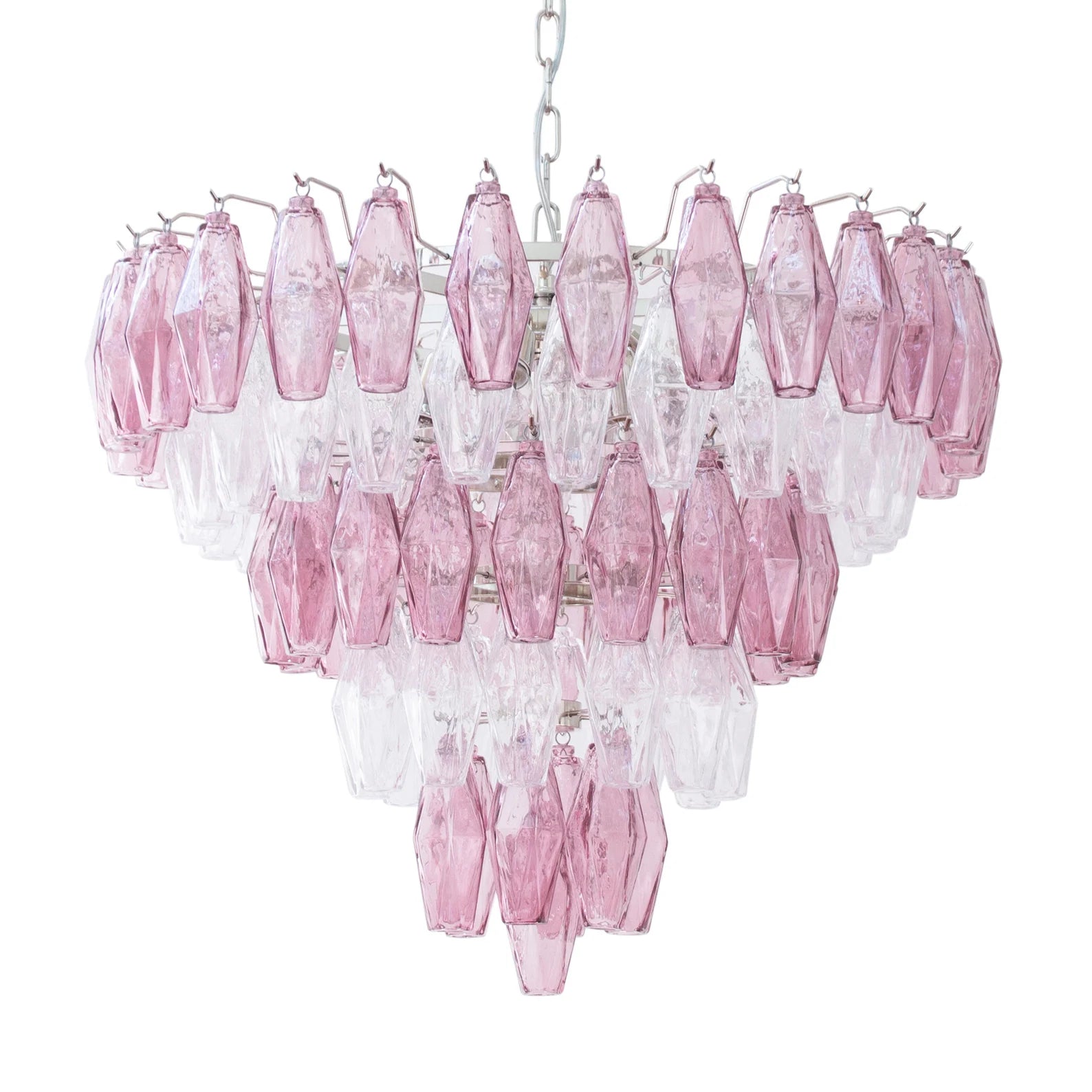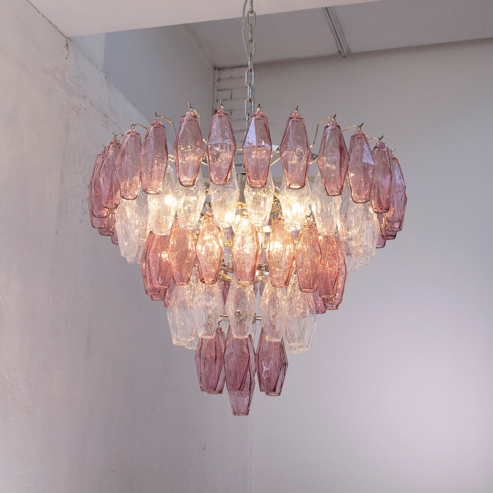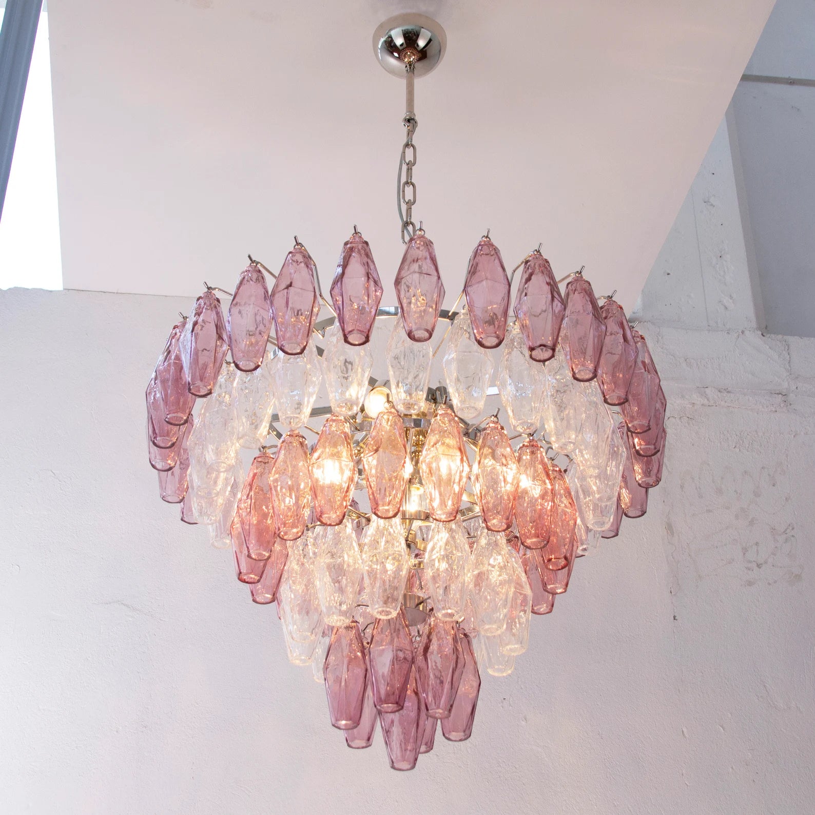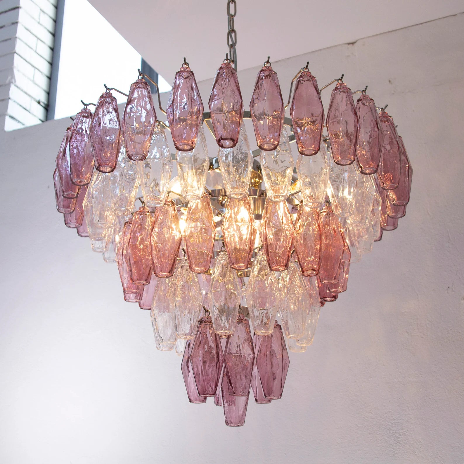 Spesifikasjoner: • Håndlaget i Murano, Italia • 100+ polyeder-glass + reservedel inkludert • Farge: Amethyst og Clear (andre farger på forespørsel) • Størrelse: Ø75 × H65 cm + justerbar kjetting (opptil 50 cm) • Vekt: ca. 25 kg • Materialer: Blåst glass, messing/stål • Ramme: Nikkel eller messing (valgbar finish) • Lyskilder: 6 × E12/E14 (ikke inkludert) • Rammen leveres ferdig montert – glasspendler henges på ved mottak • Kjetting og takrosett inkludert