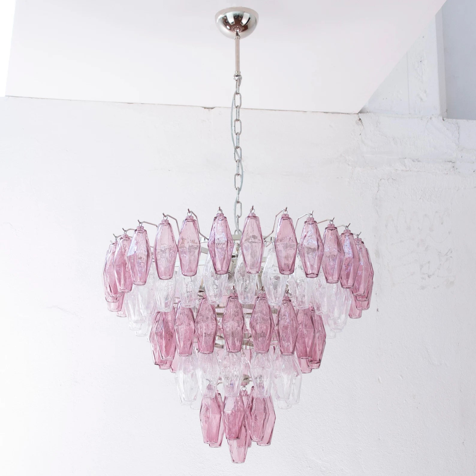 Murano Poliedri Chandelier Ø75 kombinerer historisk 60-tallsdesign med moderne eleganse. Lysekronen består av munnblåste polyederformede glass i en dyp ametystfarget tone, arrangert i en harmonisk rund form som sprer lyset med myk glød og subtil fargedybde.