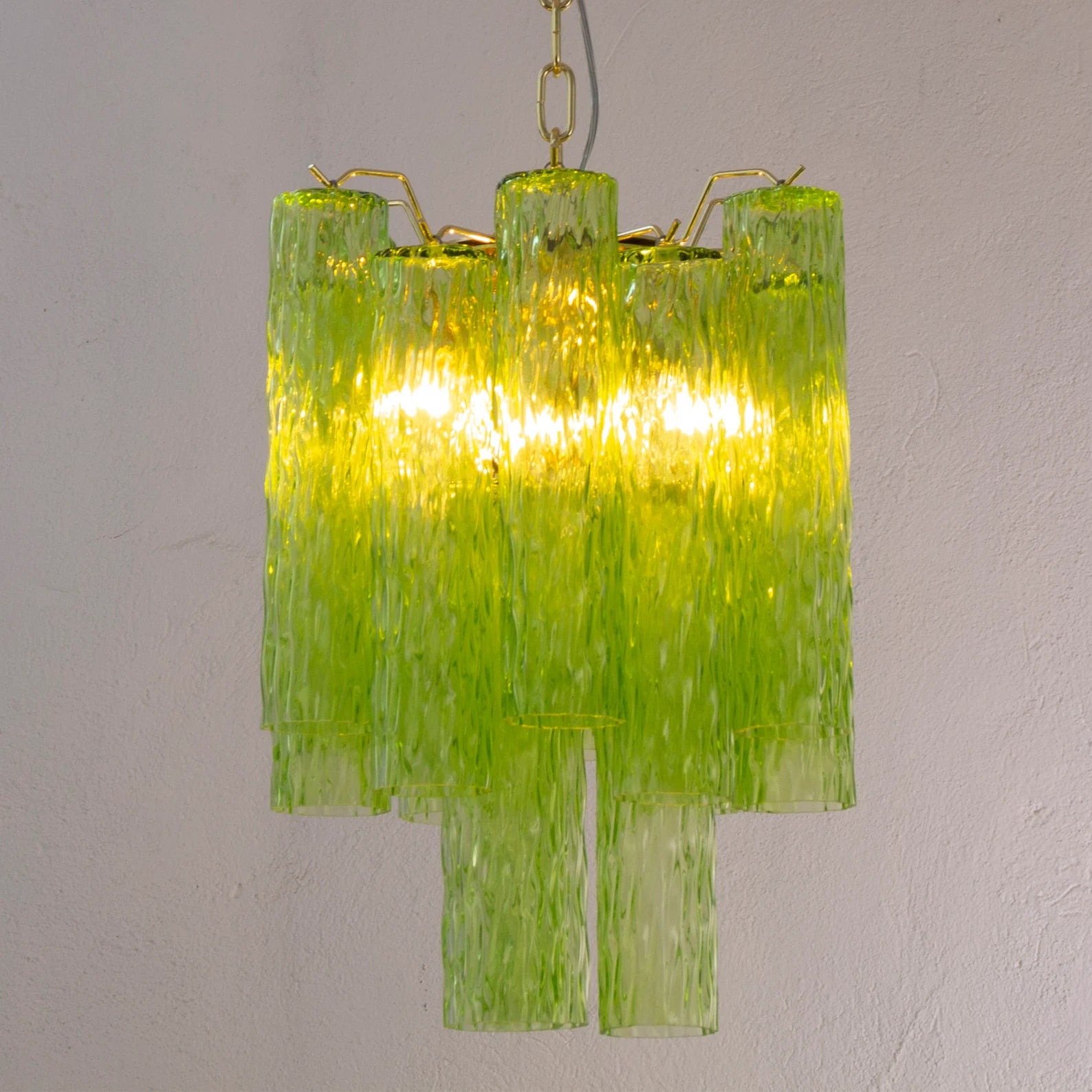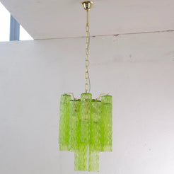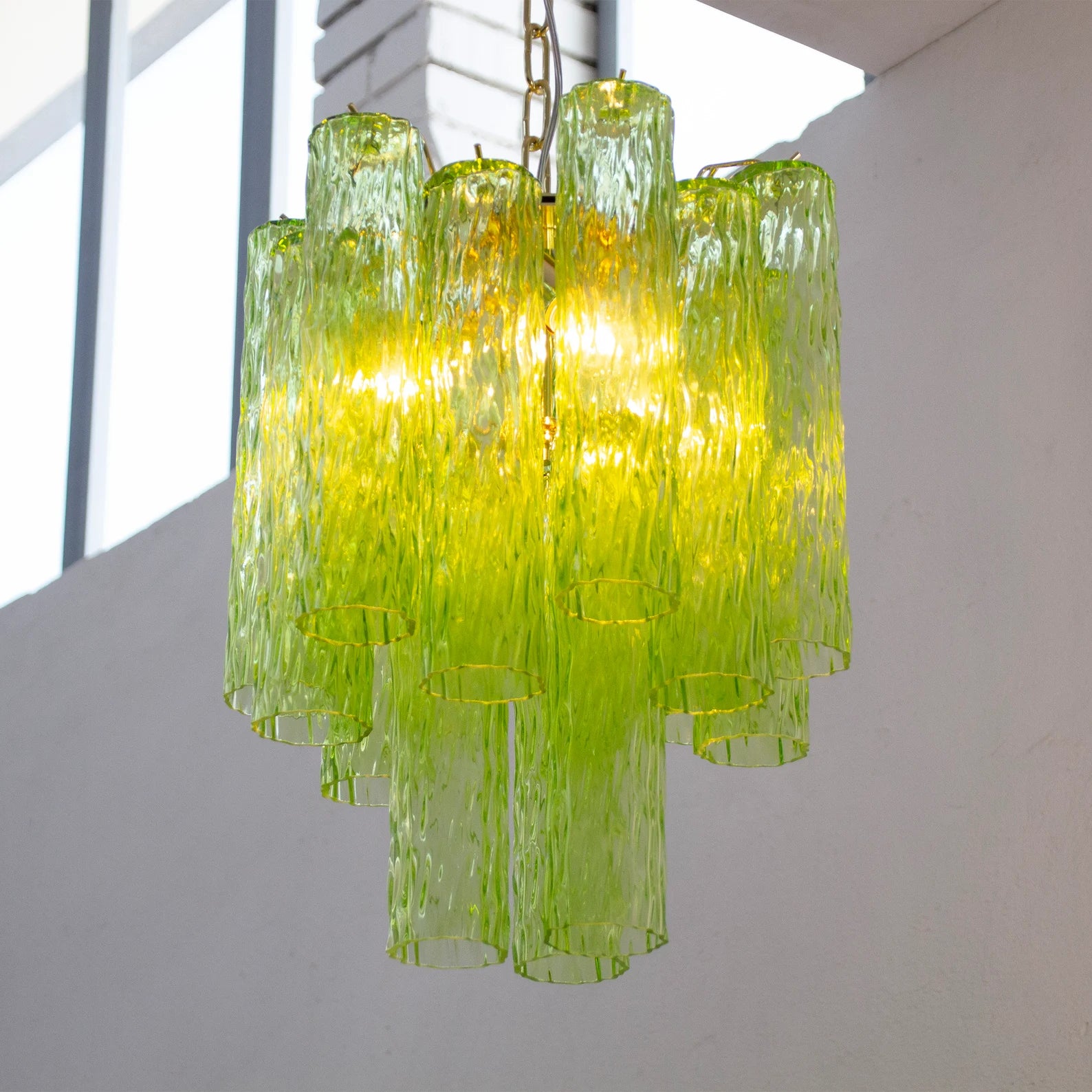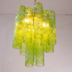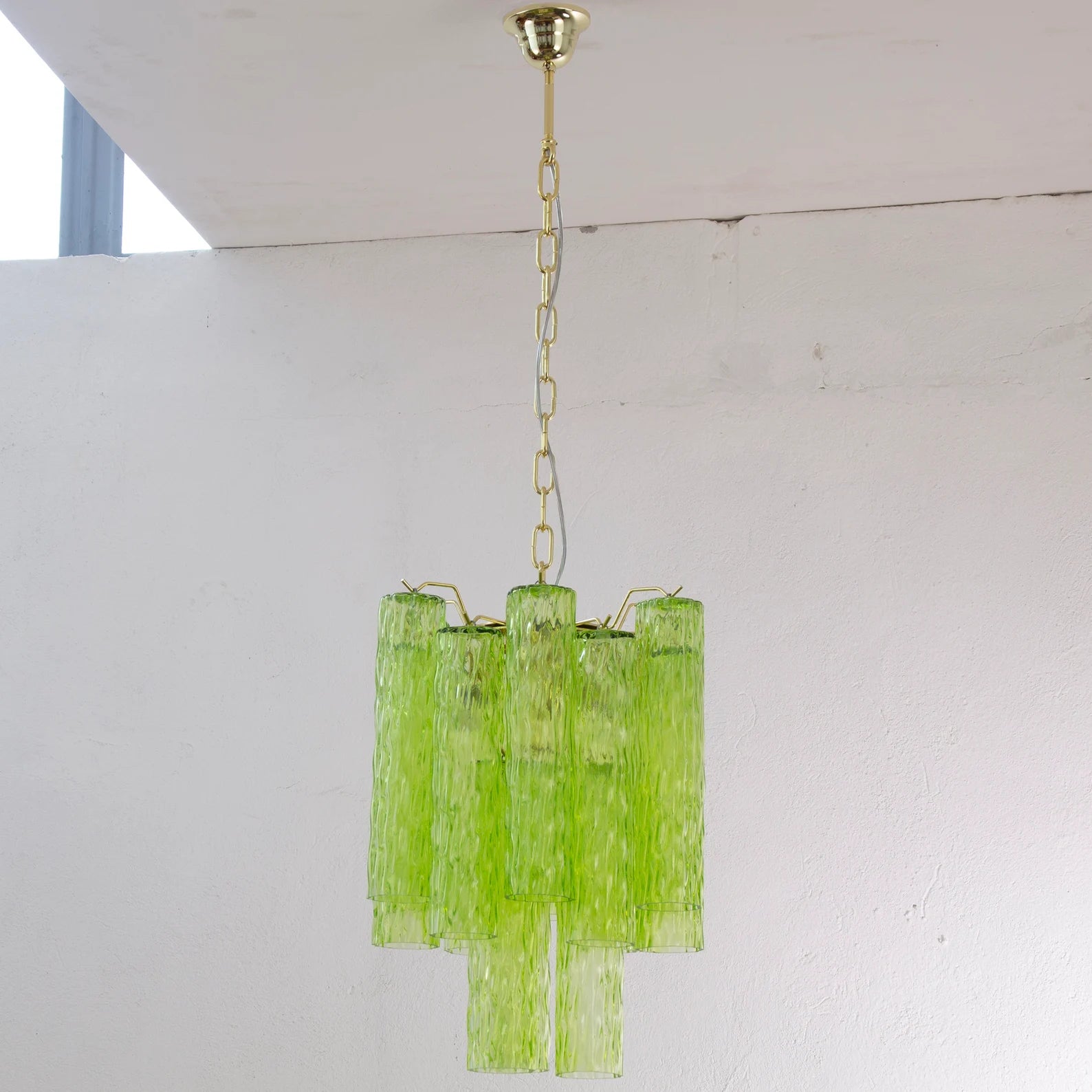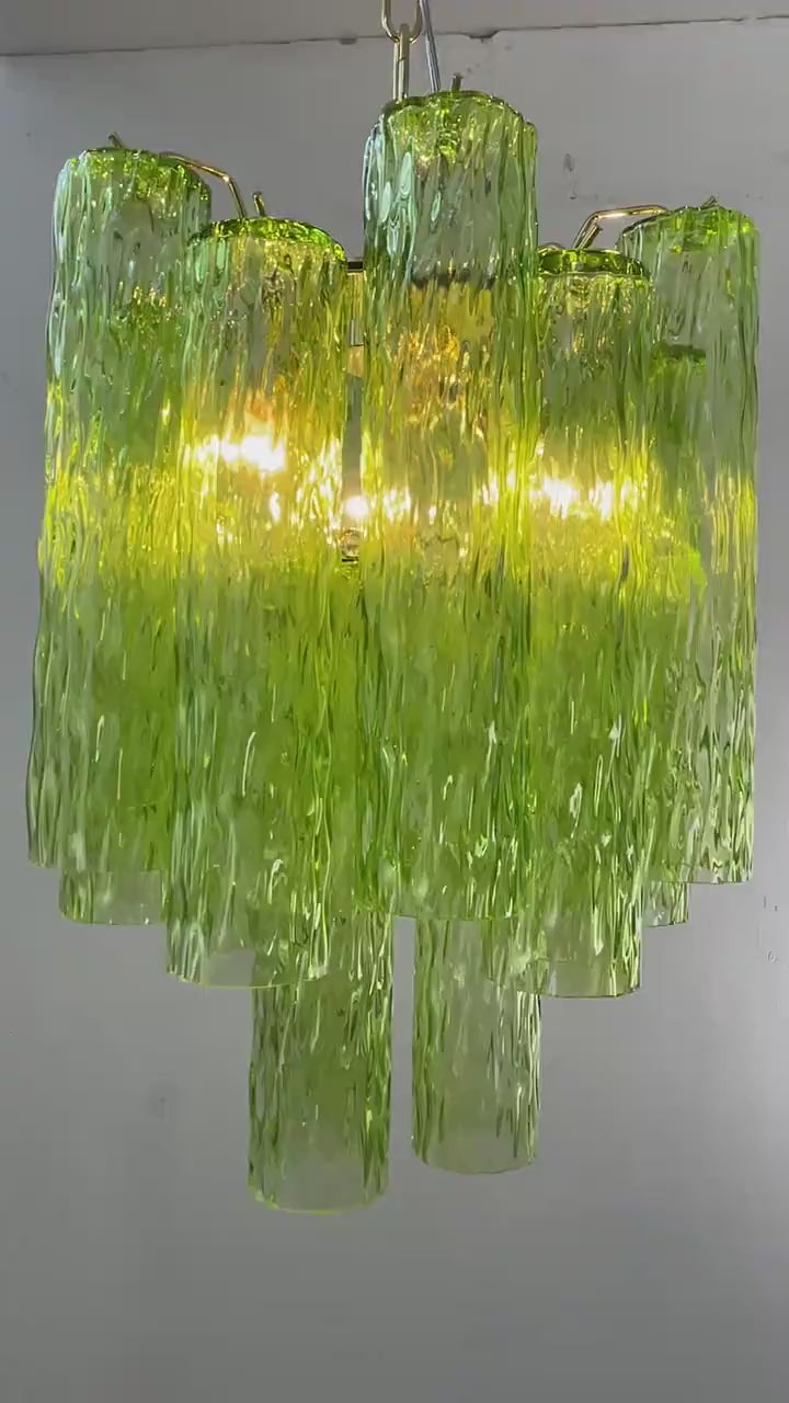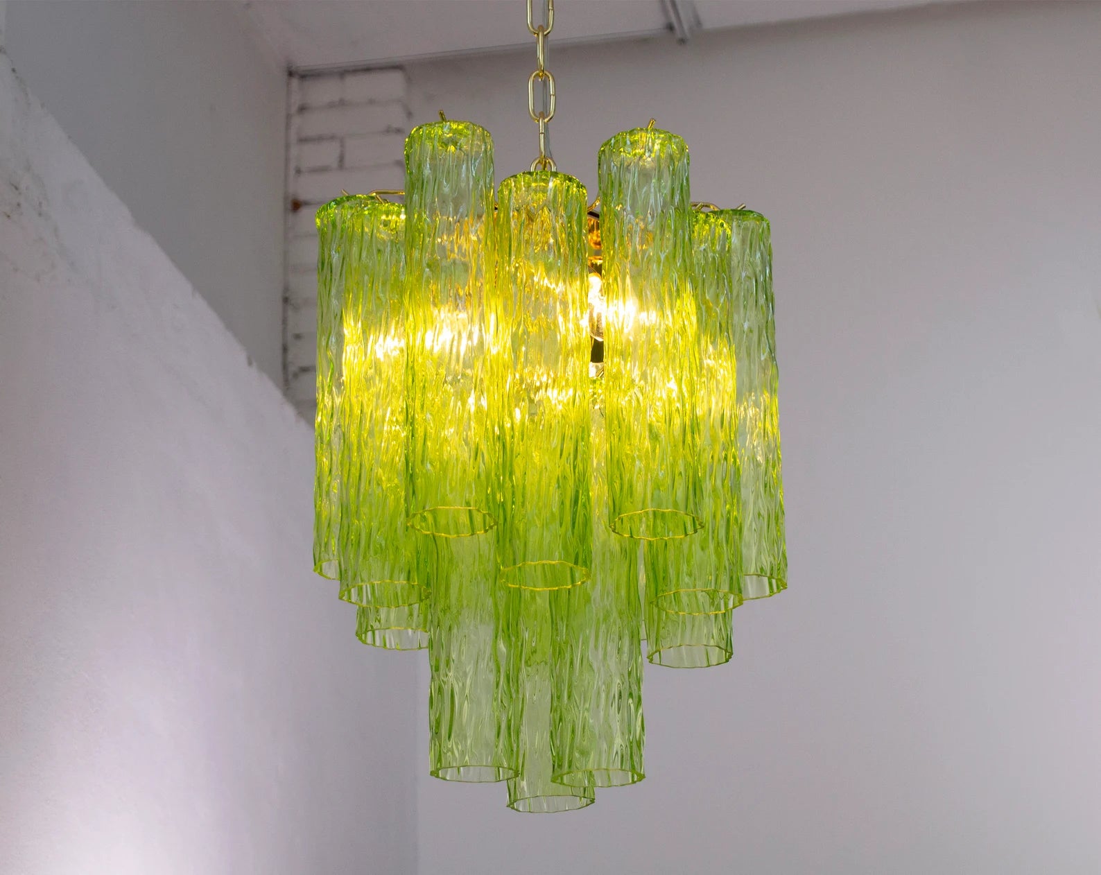 Spesifikasjoner: • Håndlaget i Murano, Italia • Farge: Apple Green (andre farger på forespørsel) • Dimensjoner: Ø40 × H45 cm + justerbar kjetting (opptil 50 cm) • Dekorative elementer: 15 glassrør + reservedel inkludert • Ramme: Nikkel eller messing • Lyskilder: 3 × E12/E14 (ikke inkludert)