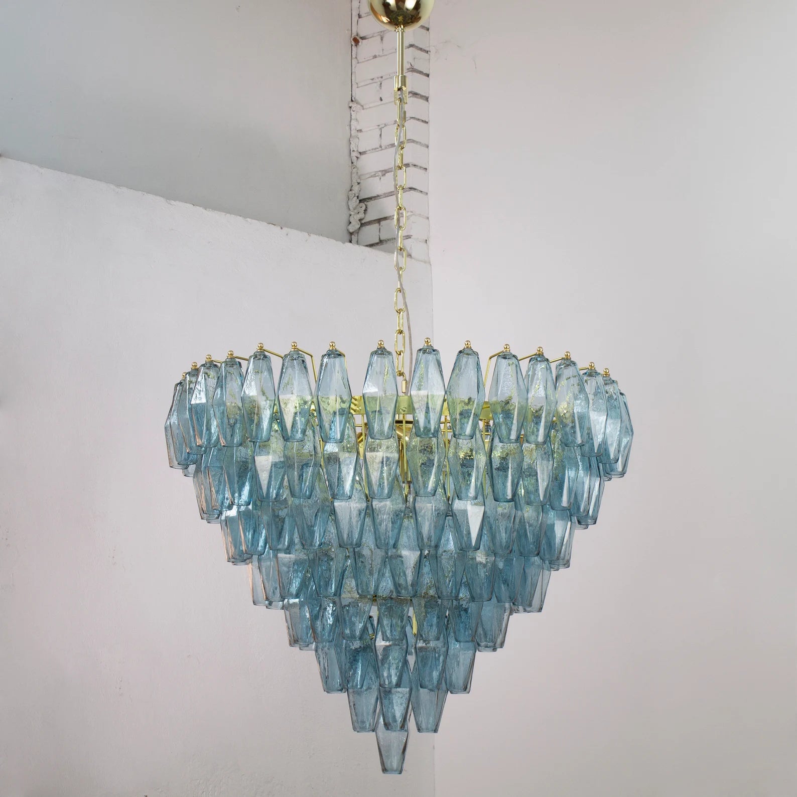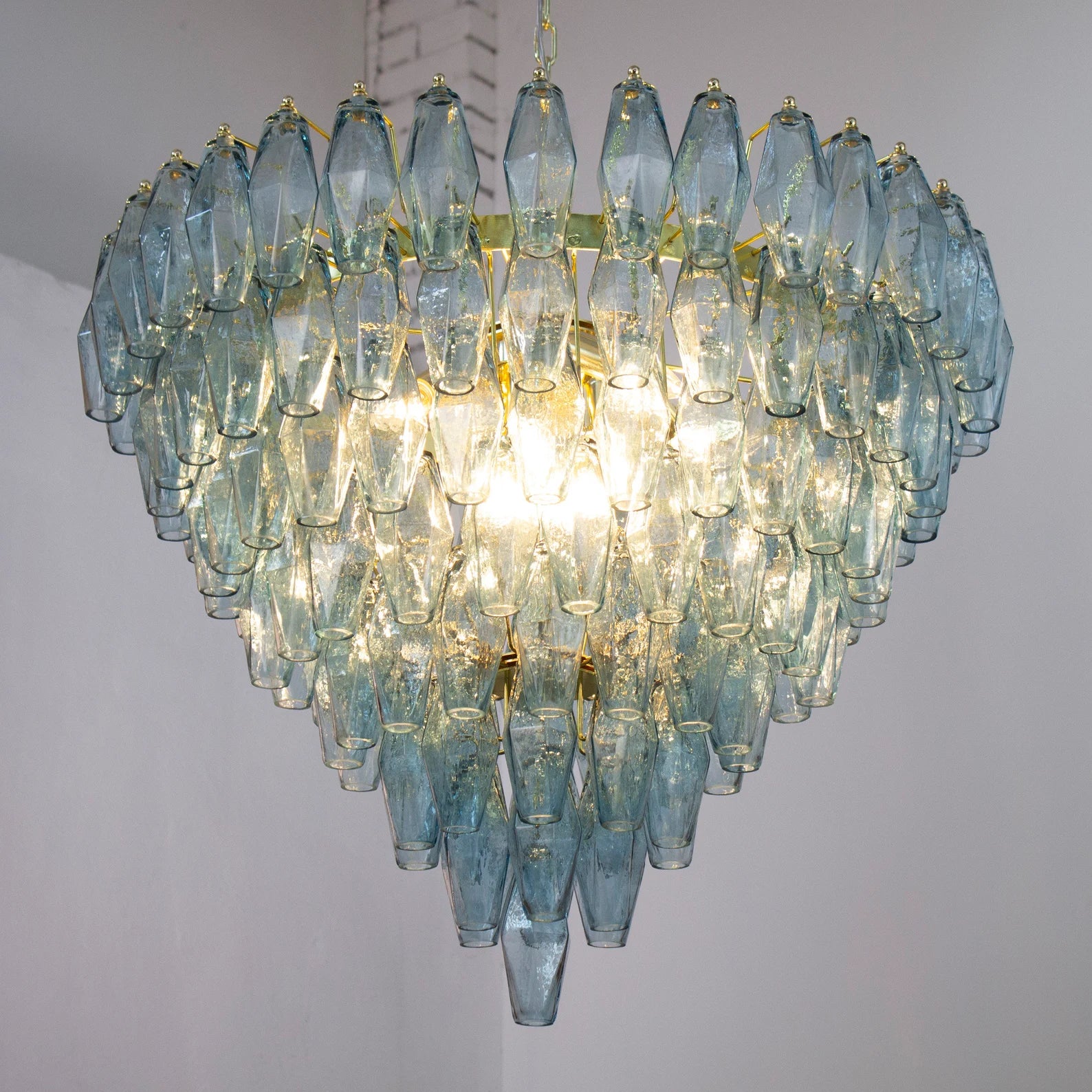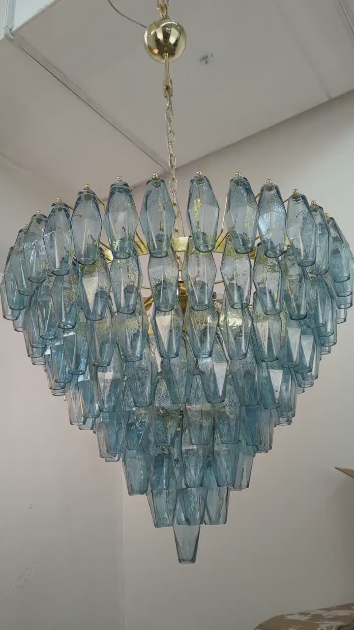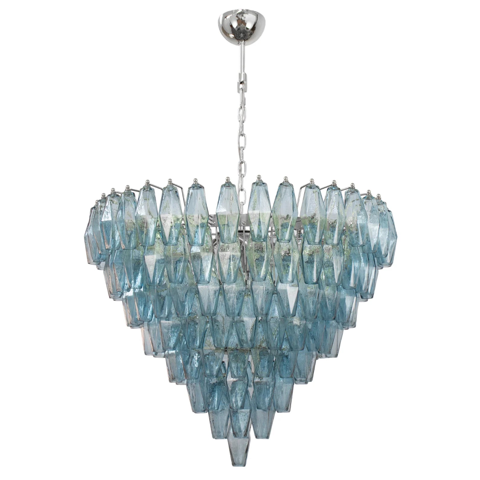 Spesifikasjoner: • Håndlaget i Murano, Italia • 143 glasspolyedre + reservedel inkludert • Farge: Avio Blue (andre farger på forespørsel) • Størrelse: Ø75 × H75 cm • Vekt: ca. 35 kg • Materialer: Blåst glass, messing/stål • Ramme: Nikkel eller messing (valgbar finish) • Lyskilder: 8 × E12/E14 (ikke inkludert) • Rammen leveres ferdig montert – glass pendler henges på ved mottak