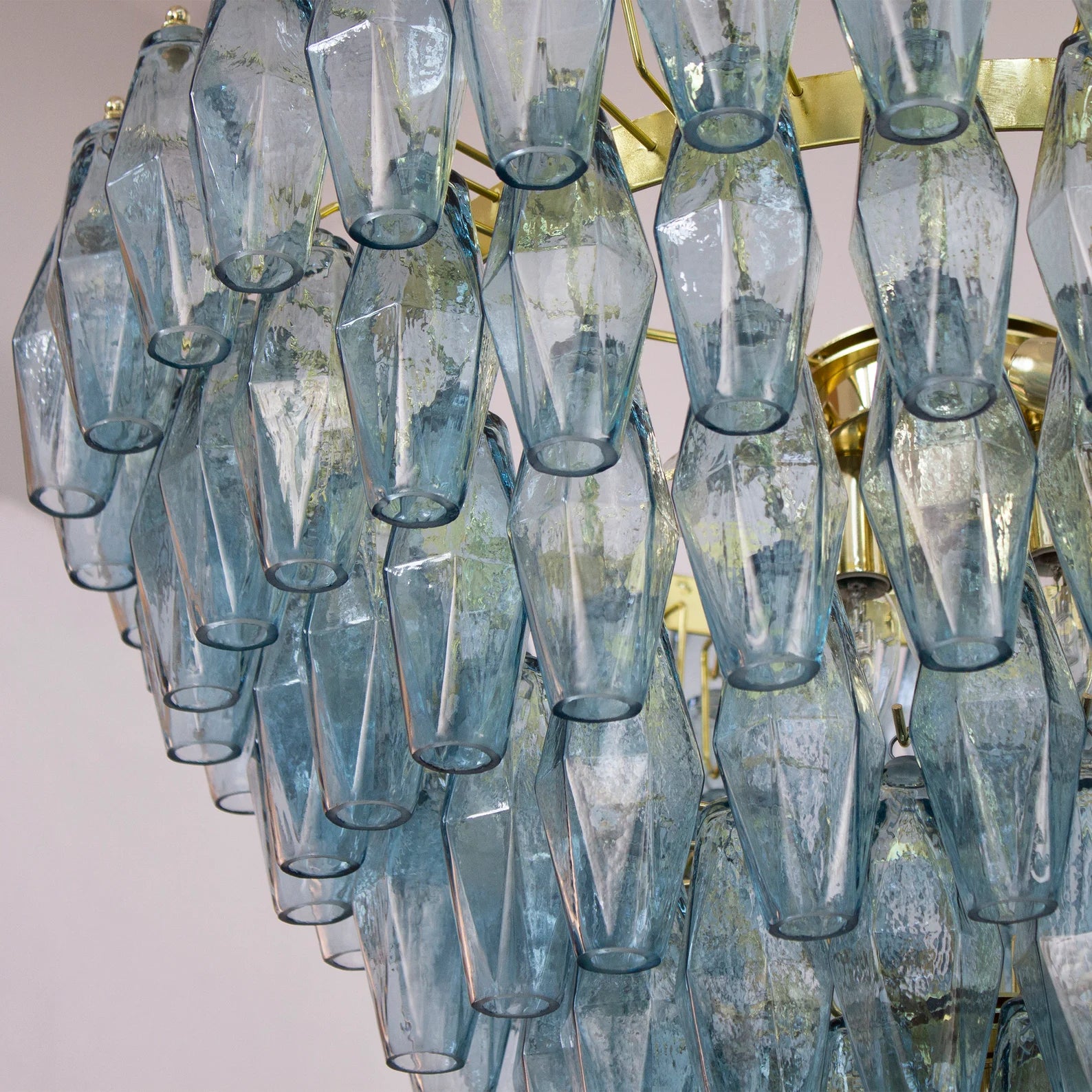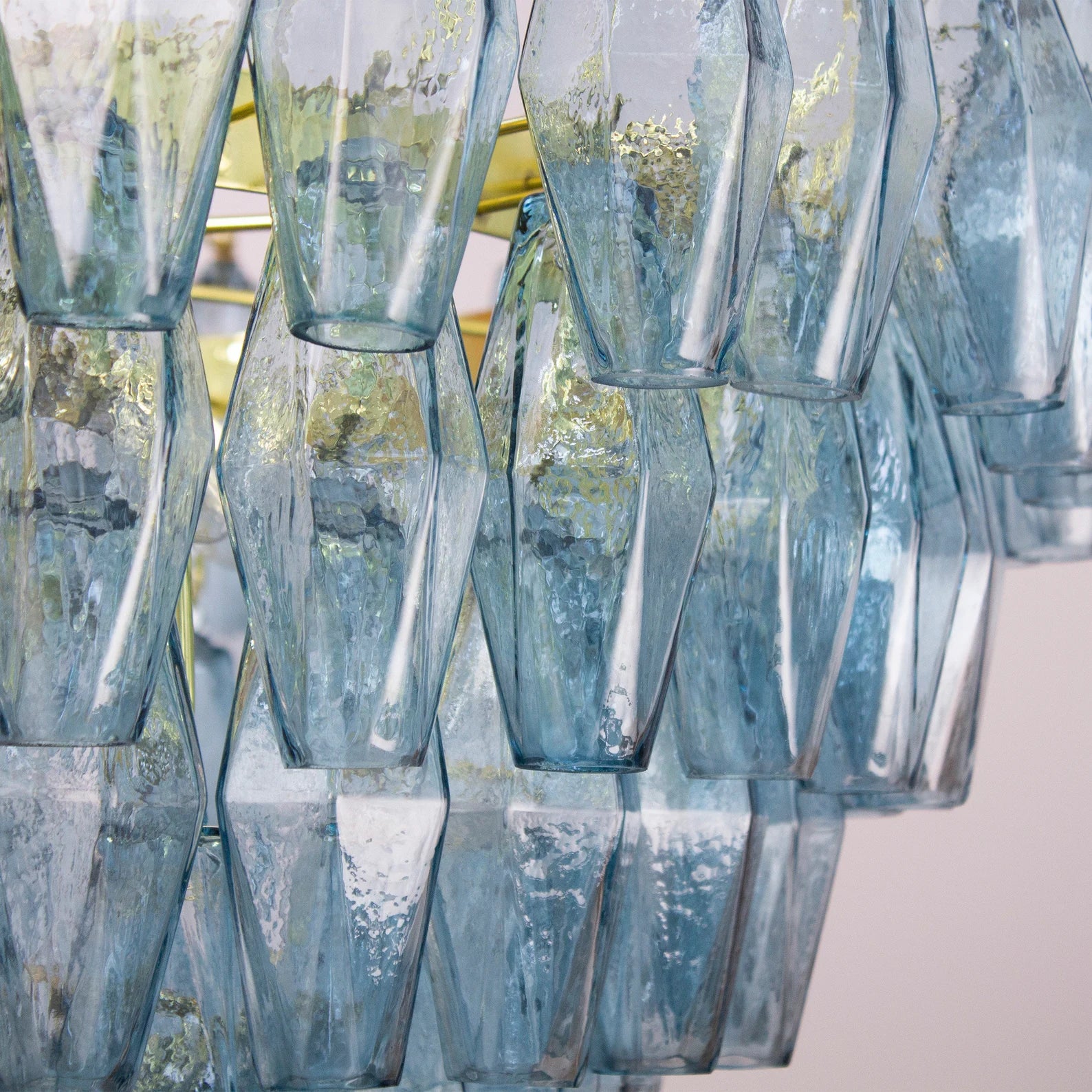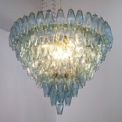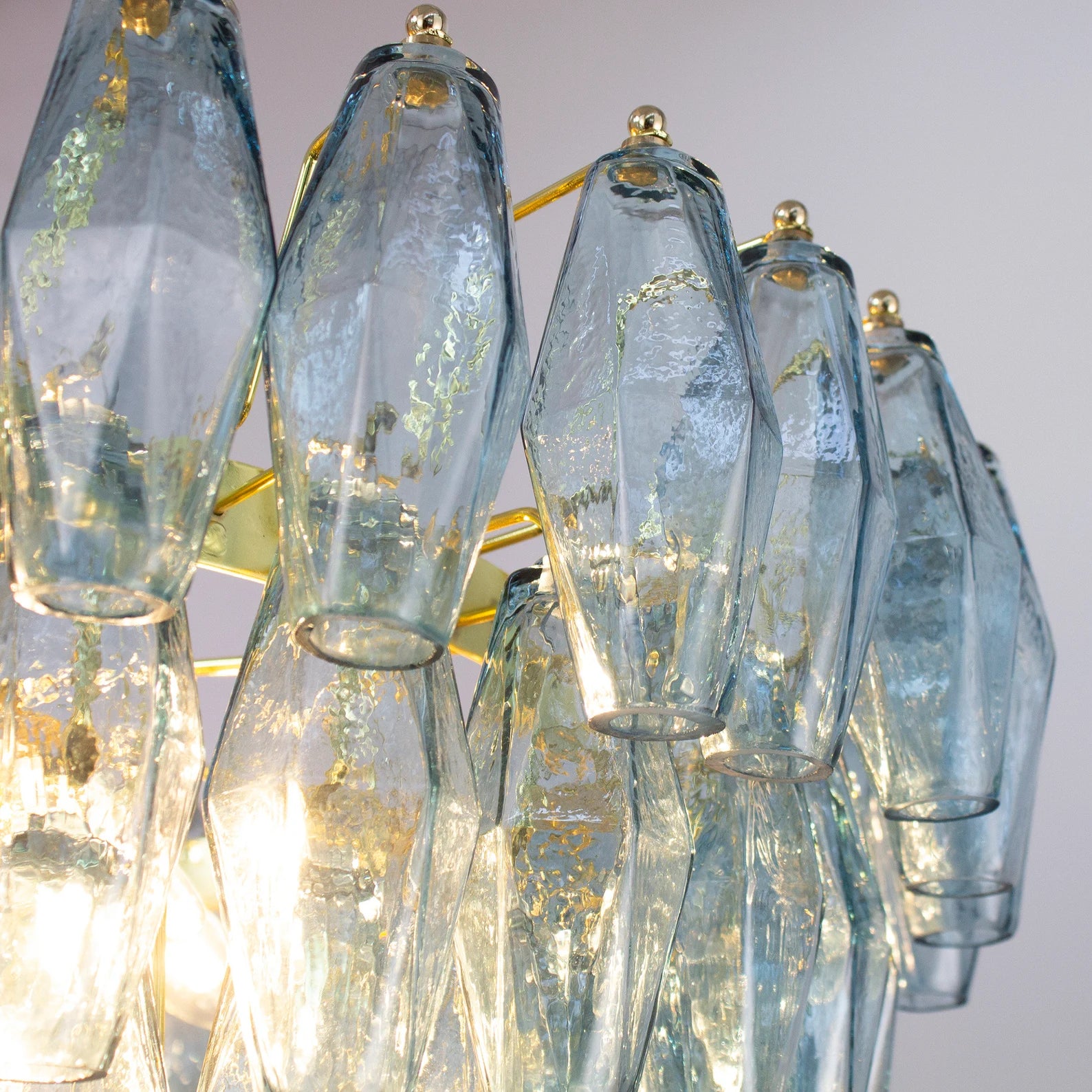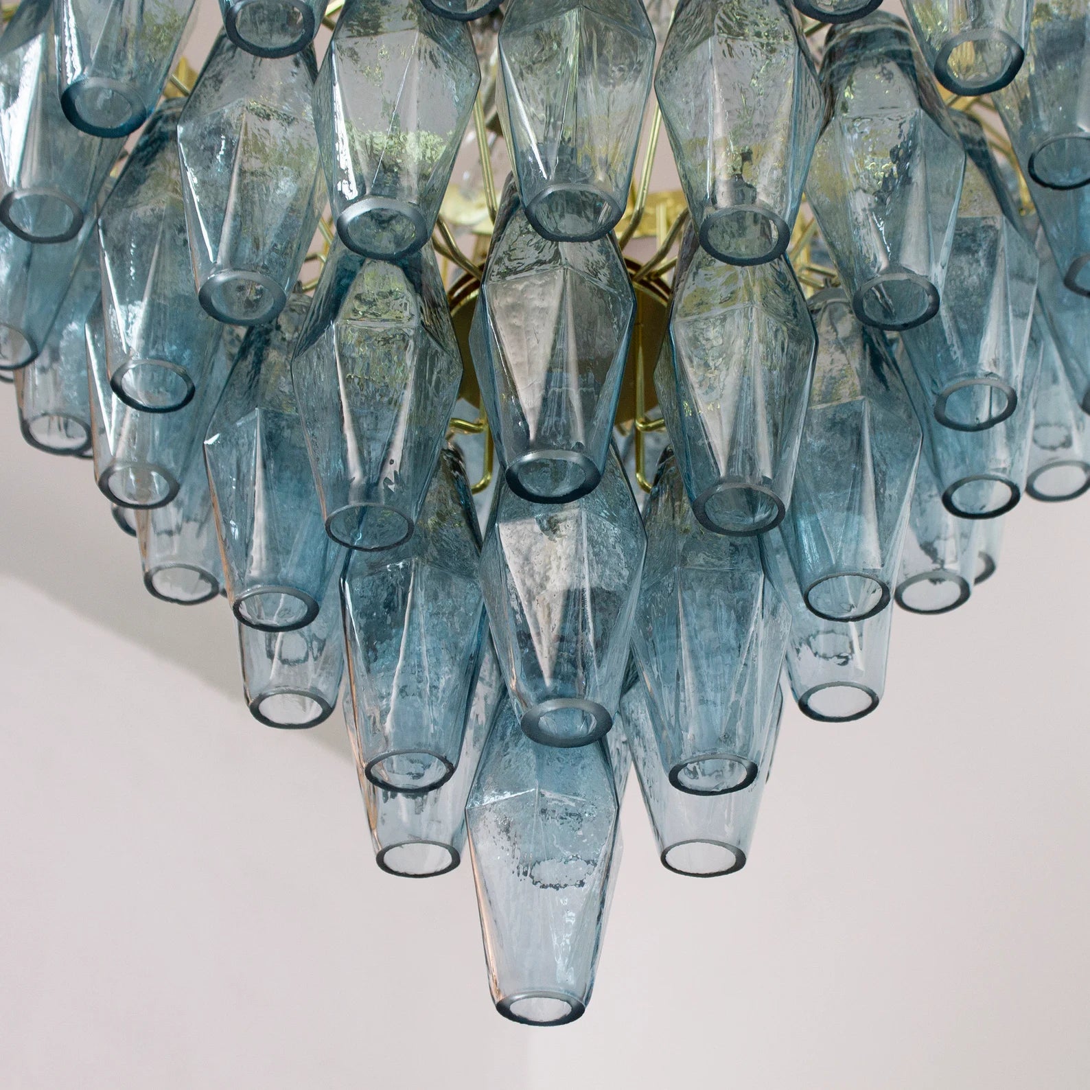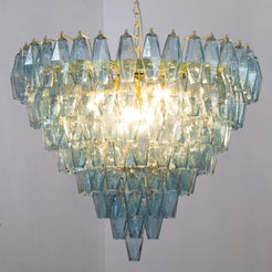 Murano Poliedri Chandelier Ø75 består av 143 munnblåste glassmoduler i den elegante nyansen Avio Blue. Hver glassdel er formet som et polyeder, en signaturdesign kjent fra Venini-epoken på 1960-tallet. Lyset reflekteres gjennom de fasetterte flatene og skaper et skulpturelt og luksuriøst uttrykk.