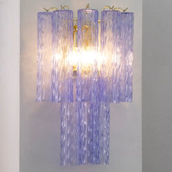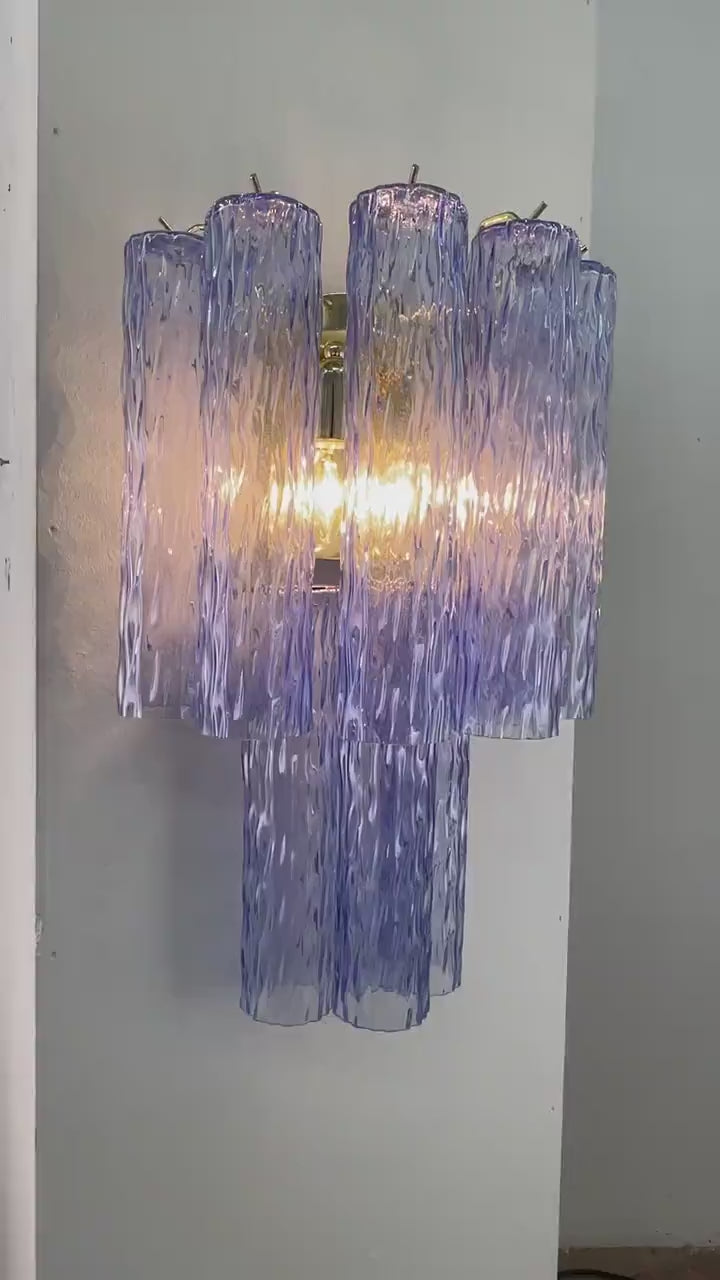 Murano Blue Tronchi Wall Sconce består av ni munnblåste glassrør i dyp blå Murano-glass, formet i den ikoniske Tronchi-strukturen som minner om bark. Lyset filtreres mykt gjennom glasset og gir en levende, men raffinert glød.