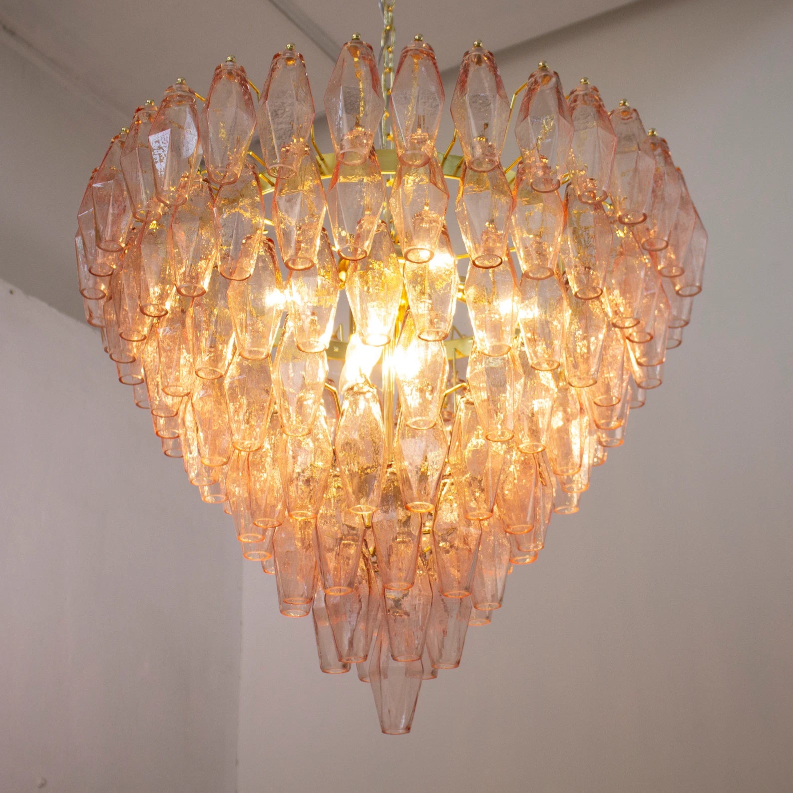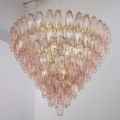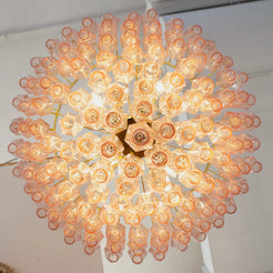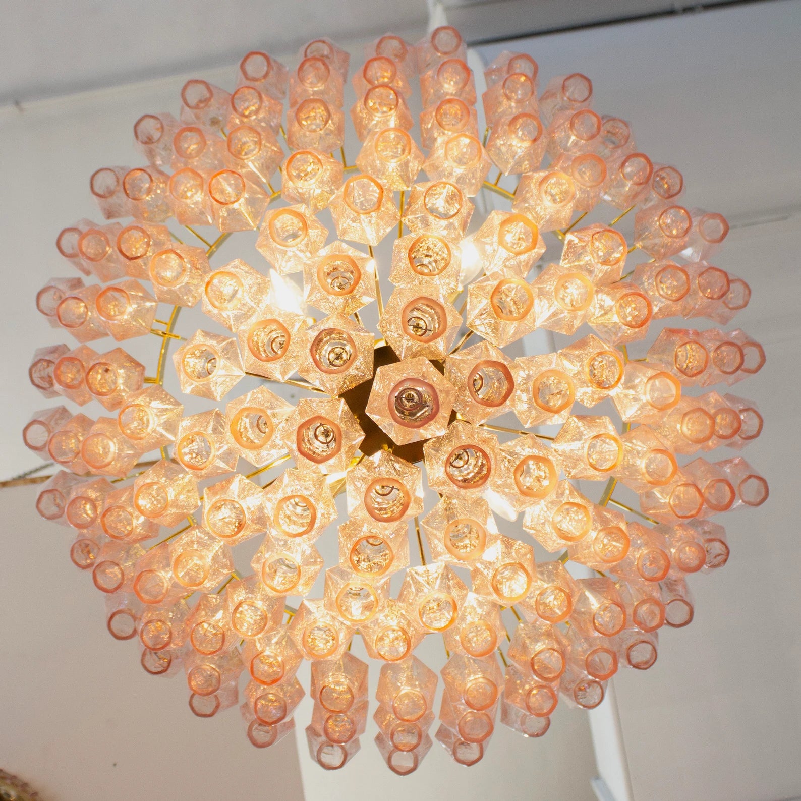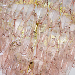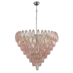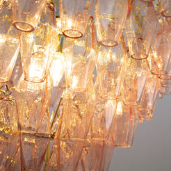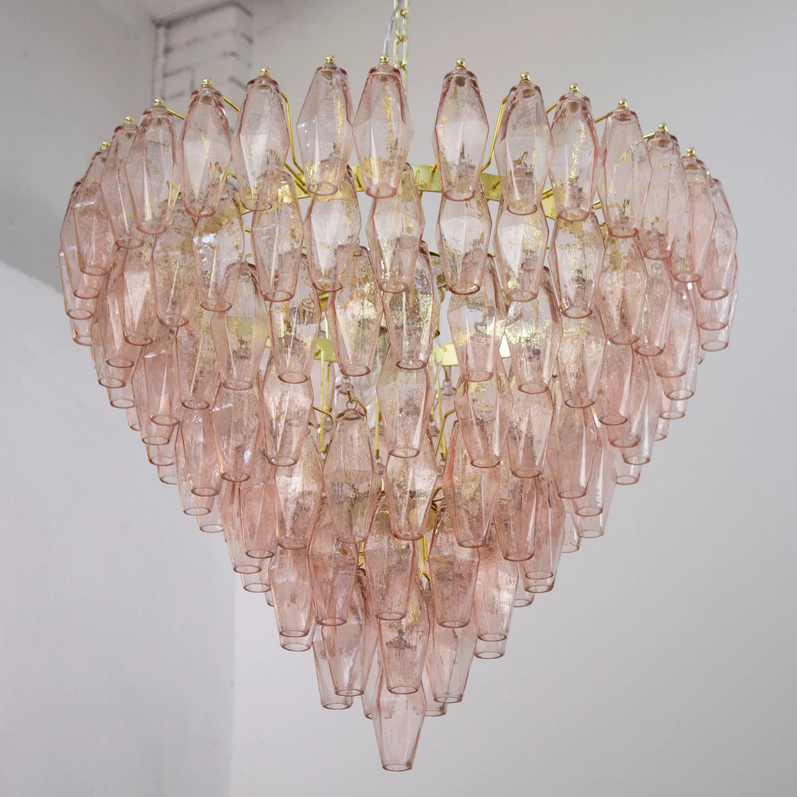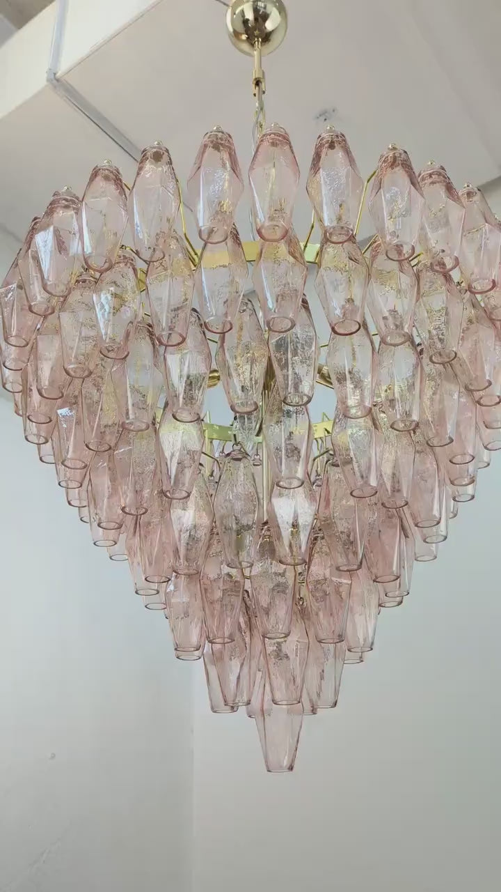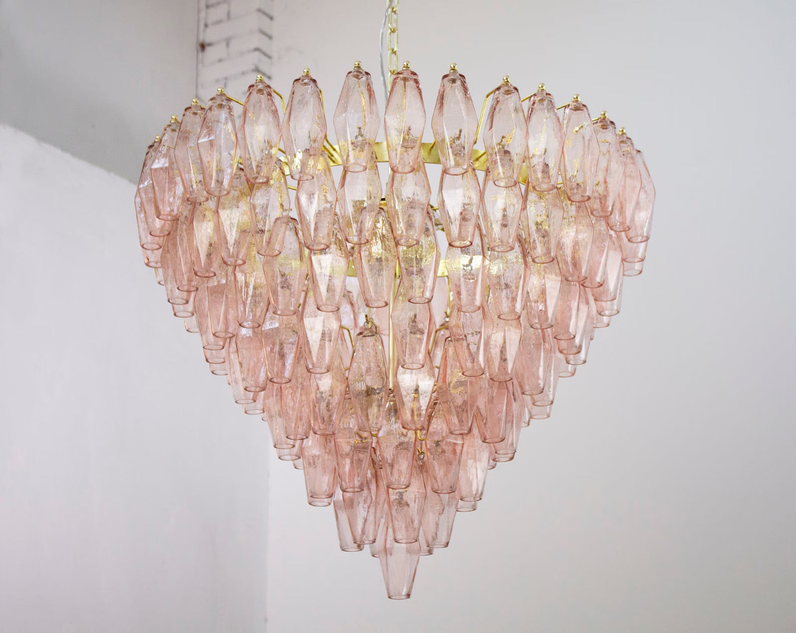 Spesifikasjoner: • Håndlaget i Murano, Italia • 143 glasspolyedre + reservedel inkludert • Farge: Cipria Pink (andre farger på forespørsel) • Størrelse: Ø75 × H75 cm • Vekt: ca. 35 kg • Materialer: Blåst glass, messing/stål • Ramme: Nikkel eller messing (valgbar finish) • Lyskilder: 8 × E12/E14 (ikke inkludert) • Rammen leveres ferdig montert – glass henges på ved mottak • Kjetting og takrosett inkludert