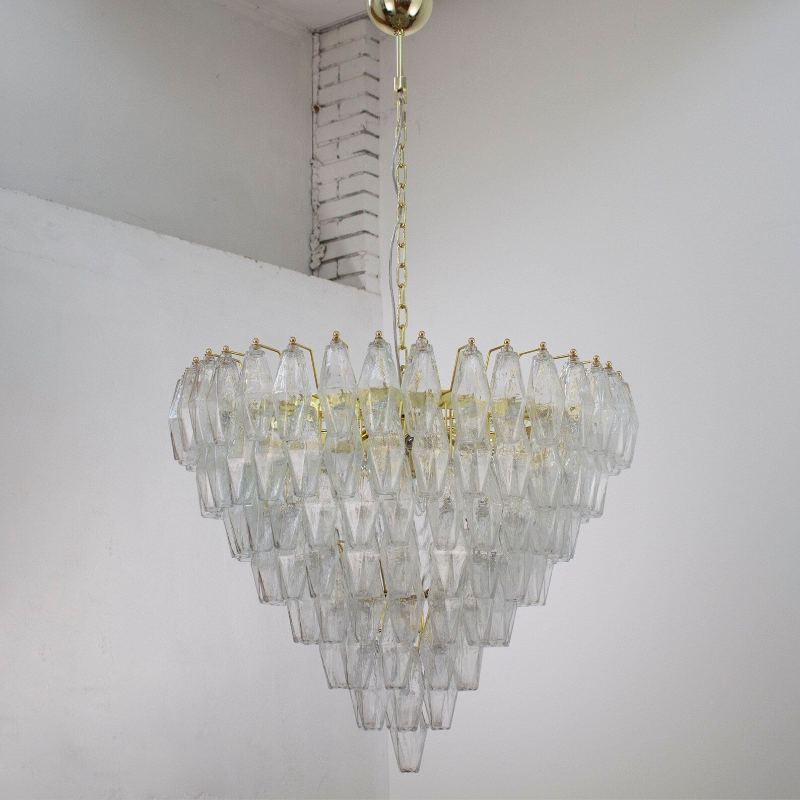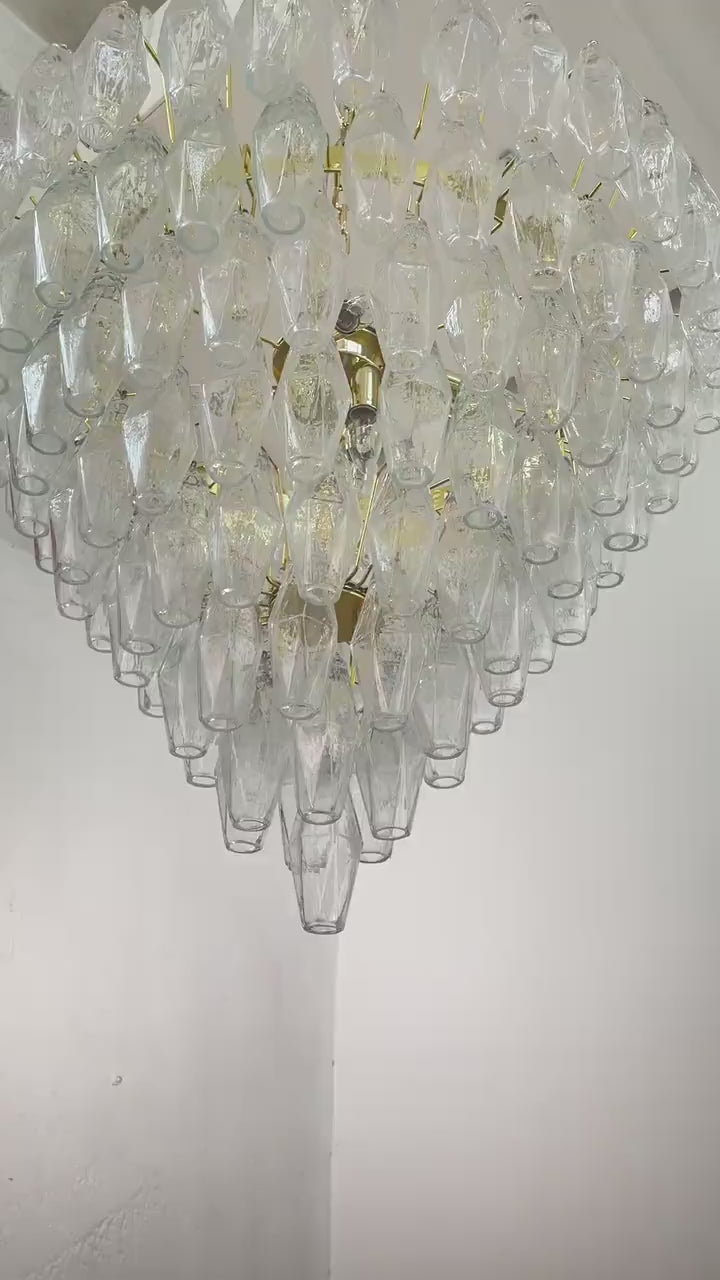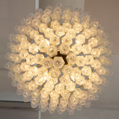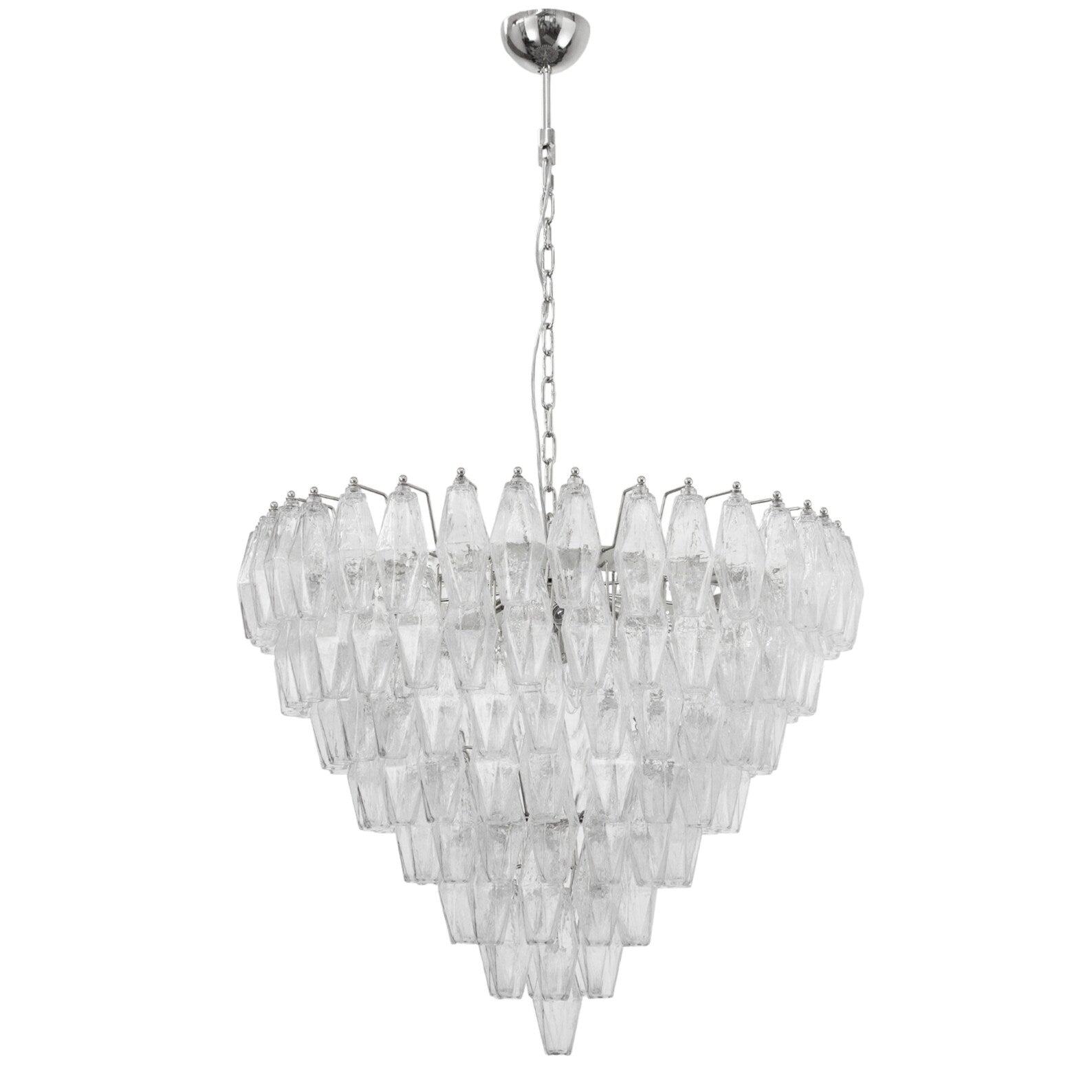 Spesifikasjoner: • Håndlaget i Murano, Italia • 143 glasspolyedre + reservedel inkludert • Farge: Clear (andre farger på forespørsel) • Størrelse: Ø75 × H75 cm • Vekt: ca. 35 kg • Materialer: Blåst glass, messing/stål • Ramme: Nikkel eller messing (valgbar finish) • Lyskilder: 8 × E12/E14 (ikke inkludert) • Rammen leveres ferdig montert – glass henges på ved mottak • Kjetting og takrosett inkludert