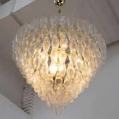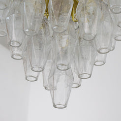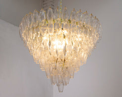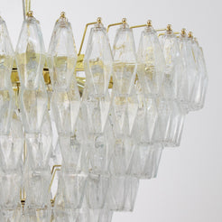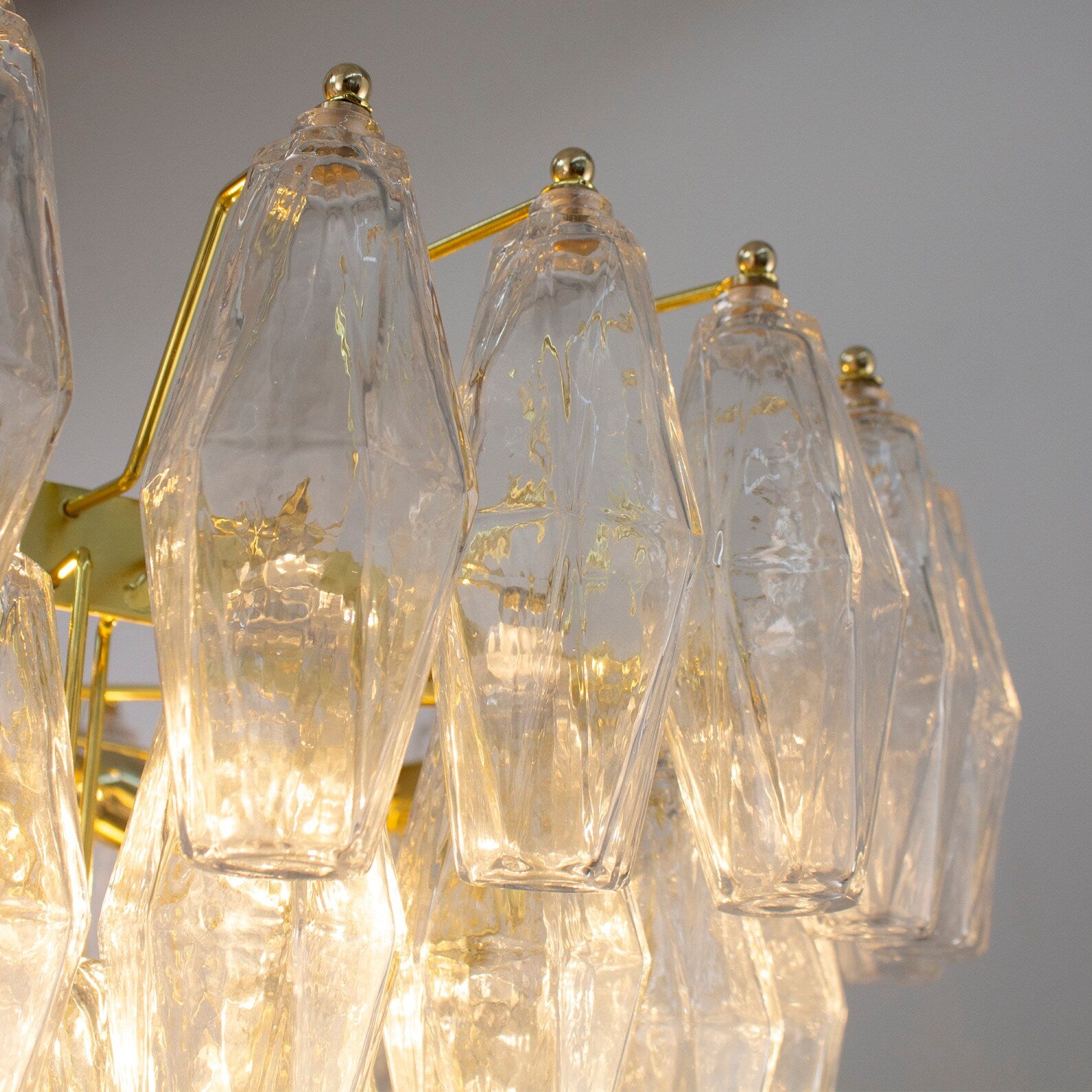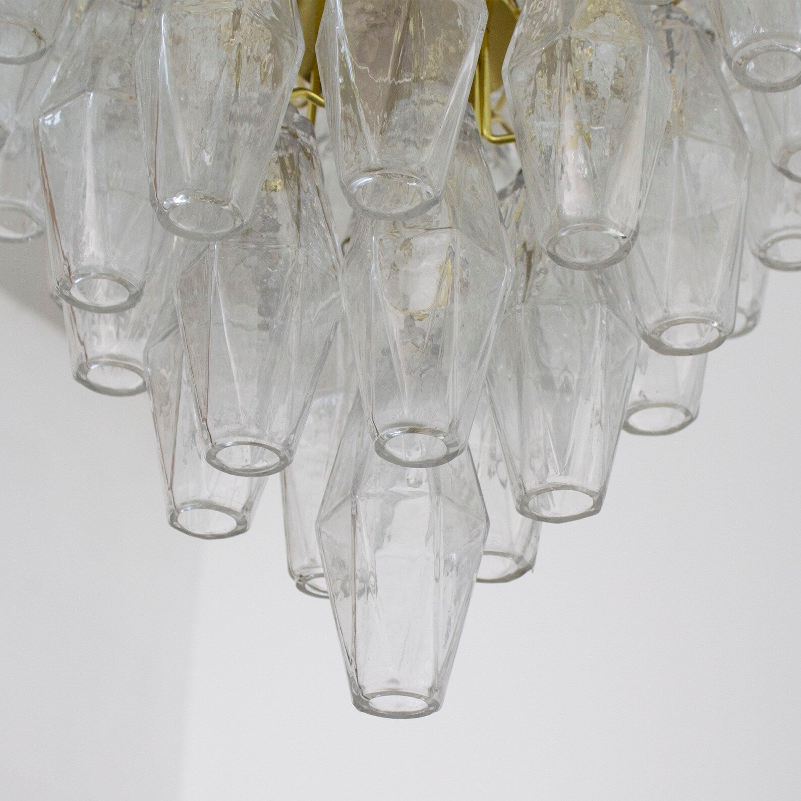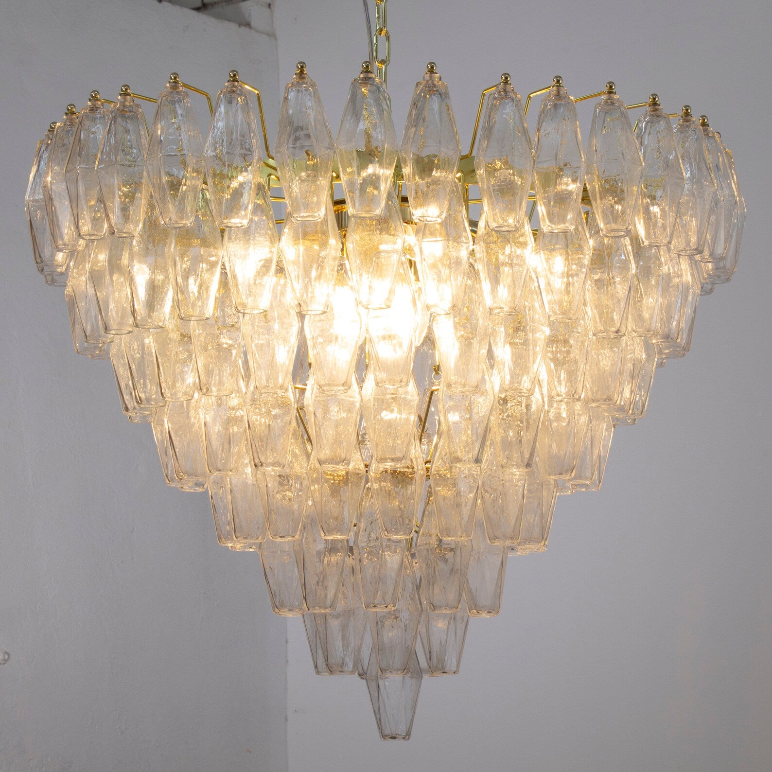 Spesifikasjoner: • Håndlaget i Murano, Italia • 143 glasspolyedre + reservedel inkludert • Farge: Clear (andre farger på forespørsel) • Størrelse: Ø75 × H75 cm • Vekt: ca. 35 kg • Materialer: Blåst glass, messing/stål • Ramme: Nikkel eller messing (valgbar finish) • Lyskilder: 8 × E12/E14 (ikke inkludert) • Rammen leveres ferdig montert – glass henges på ved mottak • Kjetting og takrosett inkludert