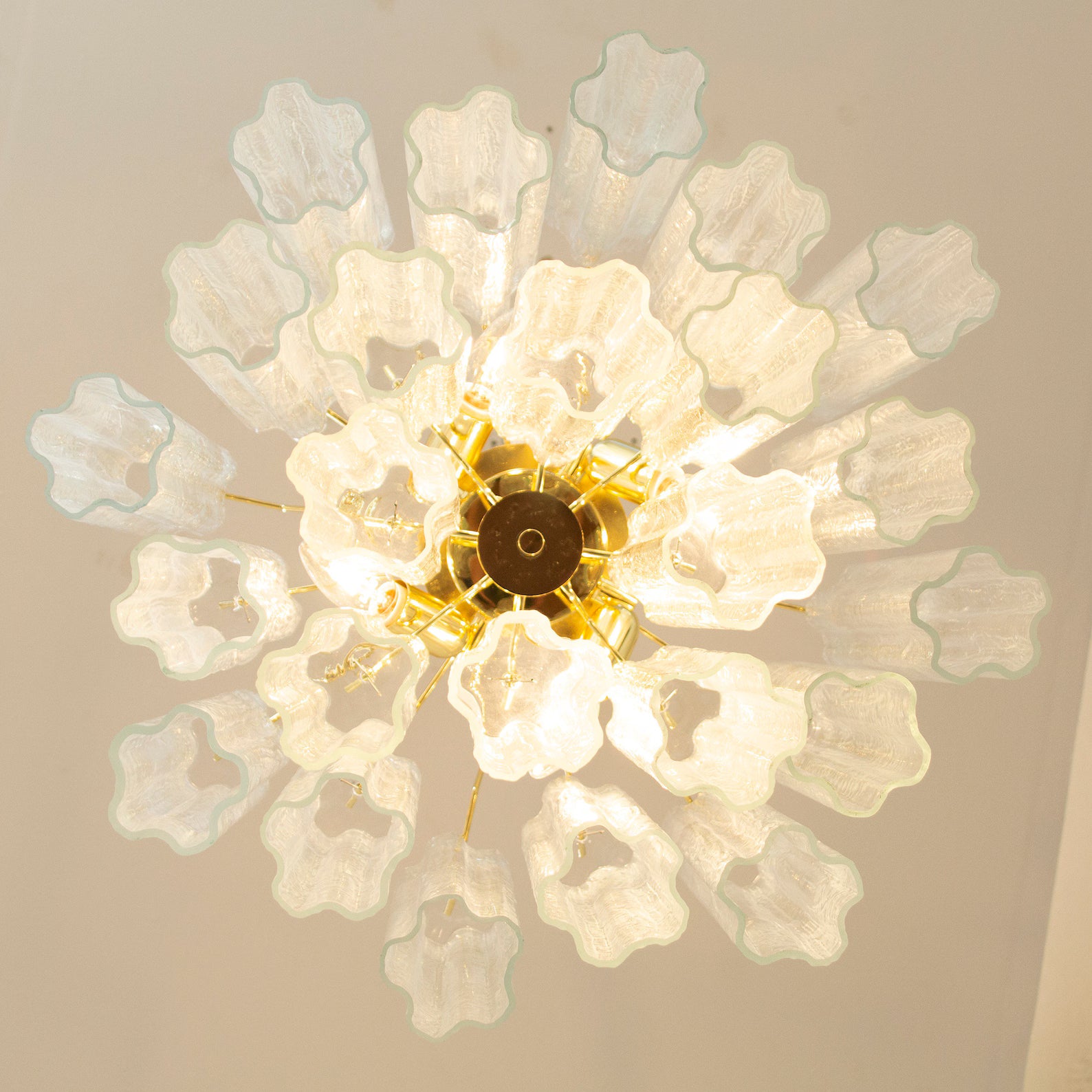 Spesifikasjoner: • Håndlaget i Murano, Italia • 24 rør i Clear Murano-glass (ca. 30 cm lange) • Ekstra glass inkludert • Størrelse: Ø53 × H45 cm • Justerbar kjetting: opptil ca. 50 cm (inkl. takrosett) • Vekt: ca. 23 kg • Materialer: Blåst glass, messing/stål • Ramme: Nikkel eller messing (valgbar finish) • Lyskilder: 4 × E12/E14 (ikke inkludert) • Rammen er ferdig montert – glasspendlene henges opp ved mottak • Kjetting og takrosett inkludert