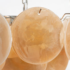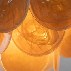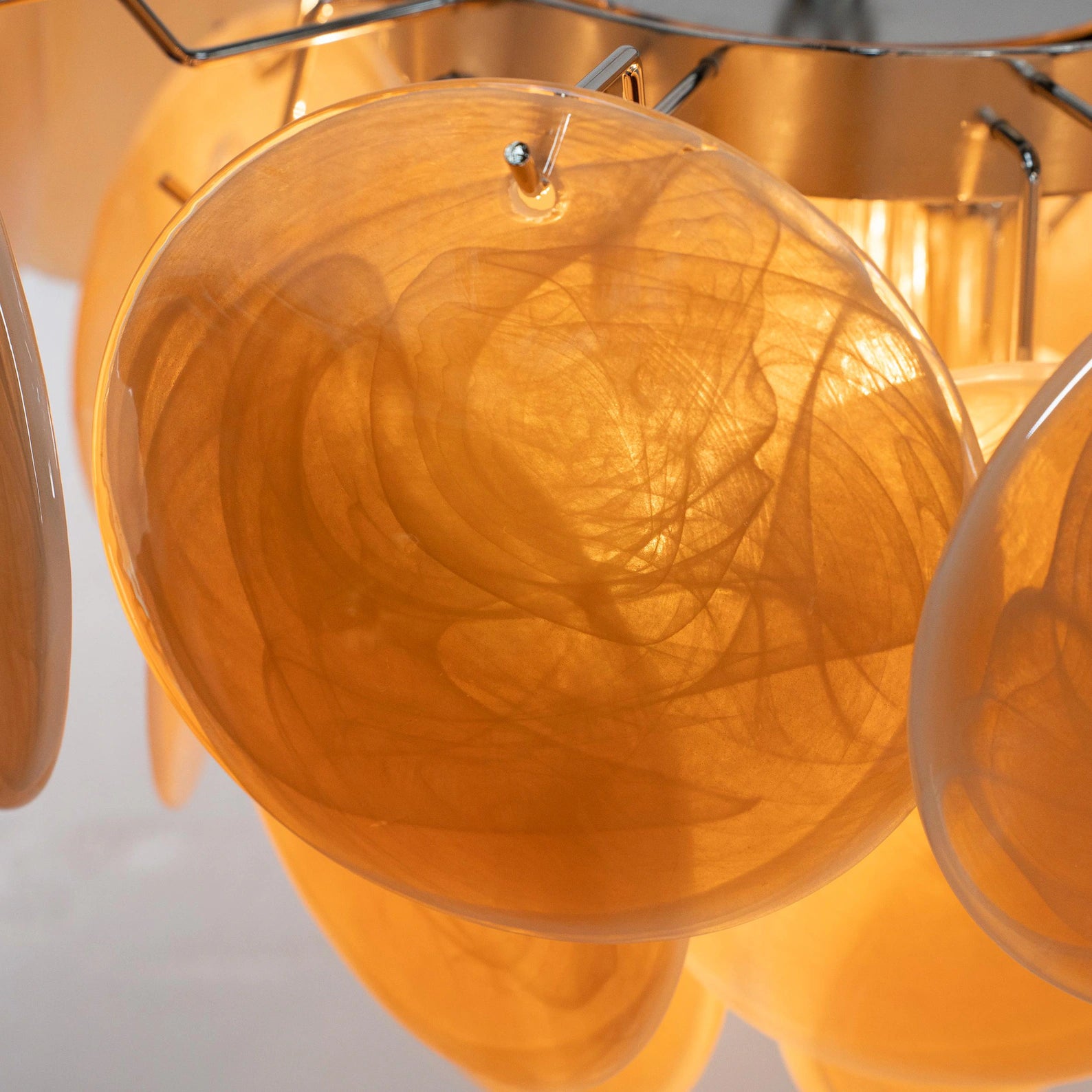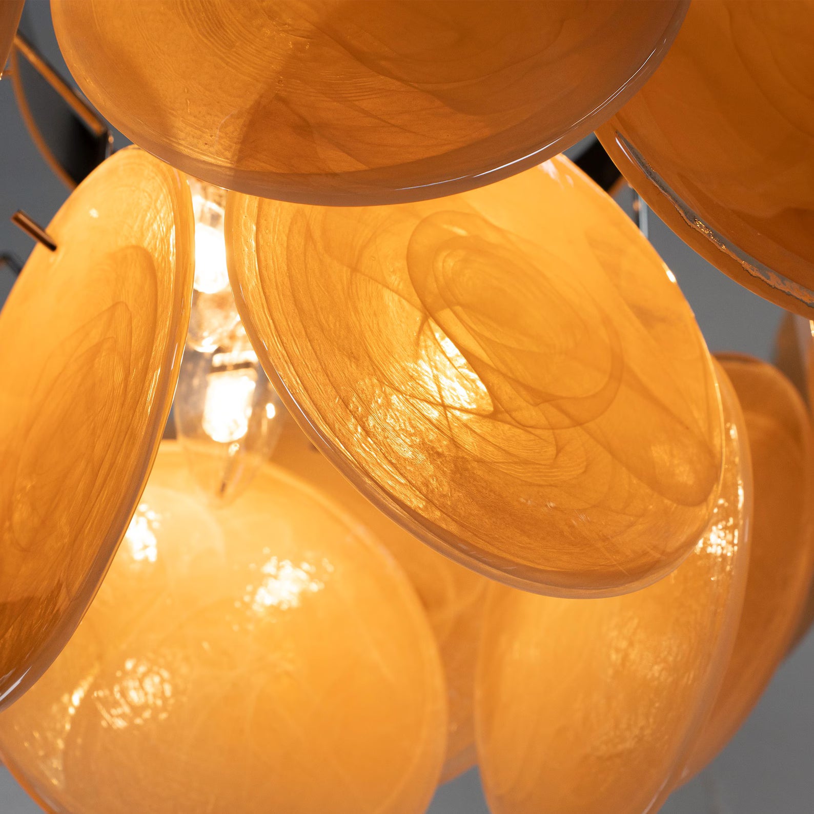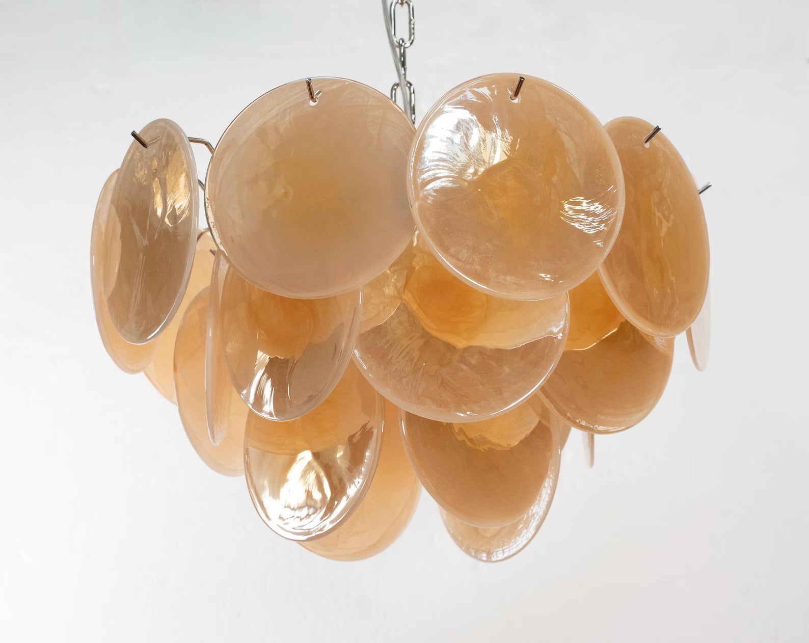 Murano Discs Chandelier Ø45 består av 22 munnblåste glasskiver i Alabaster Amber Murano-glass, arrangert i en harmonisk rund form. Hver glasskive har et unikt mønster som fanger lyset og gir et mykt, gyllent skinn – et perfekt samspill mellom vintage sjarm og moderne eleganse.