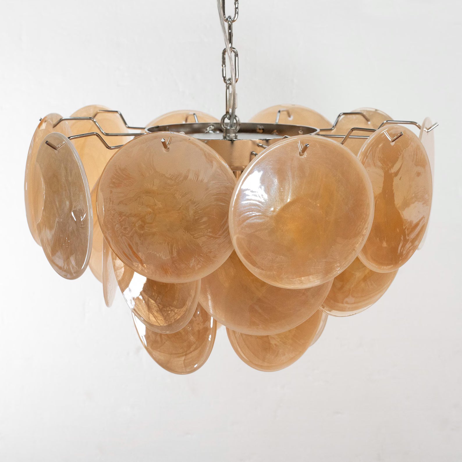Spesifikasjoner: • Håndlaget i Murano, Italia • 22 glasskiver + reservedel inkludert • Farge: Alabaster Amber (andre farger på forespørsel) • Størrelse: Ø45 × H30 cm + justerbar kjetting (opptil 50 cm) • Vekt: ca. 15 kg • Materialer: Blåst glass, messing/stål • Ramme: Nikkel eller messing (valgbar finish) • Lyskilder: 4 × E12/E14 (ikke inkludert) • Rammen leveres ferdig montert – glass henges på ved mottak • Kjetting og takrosett inkludert