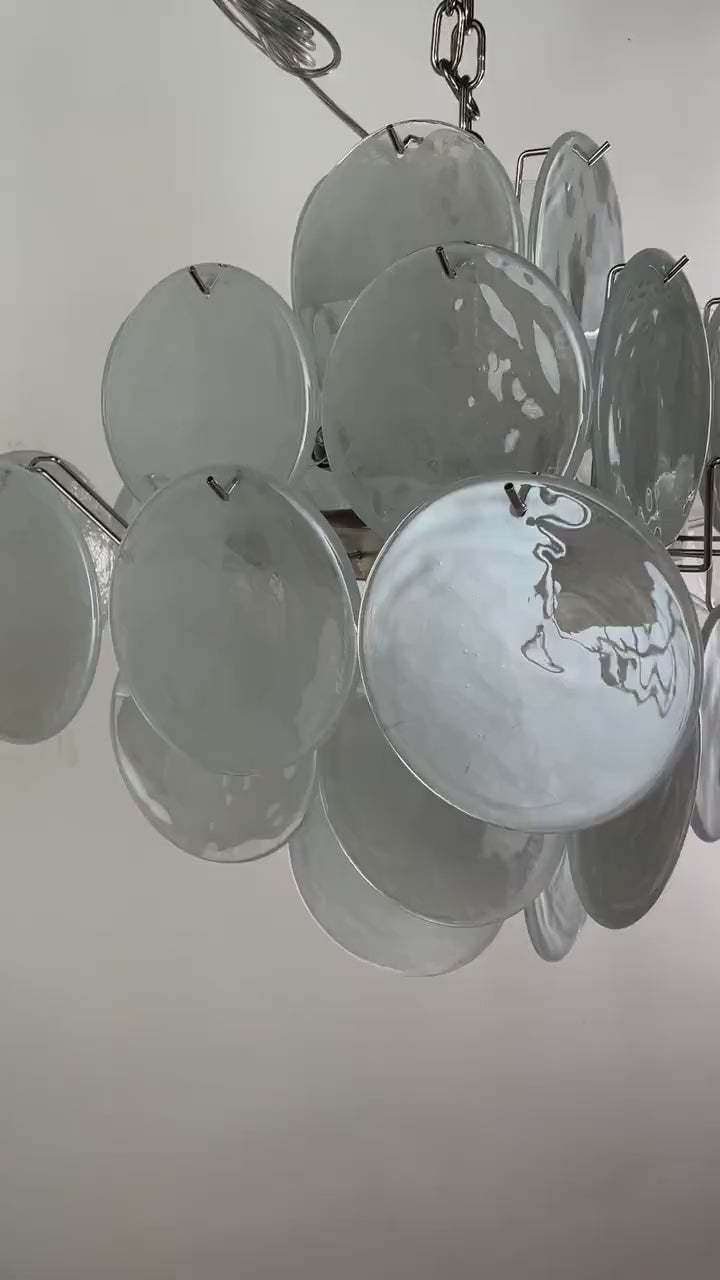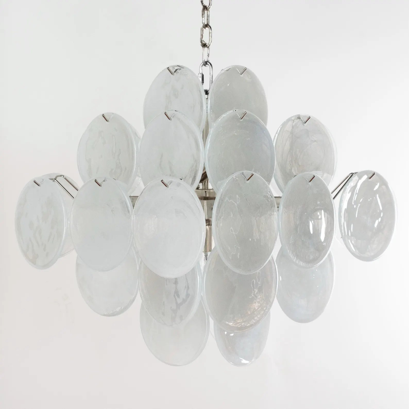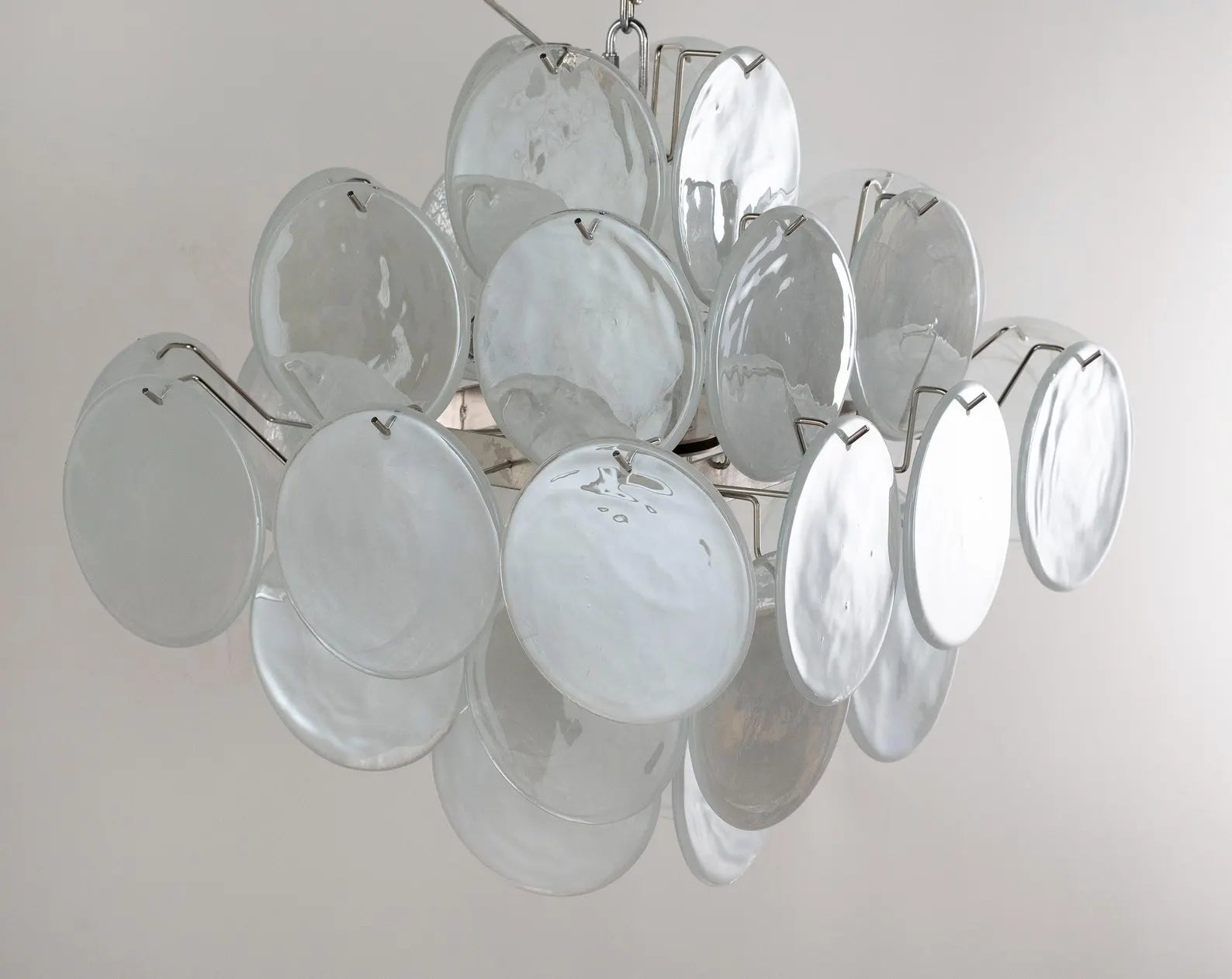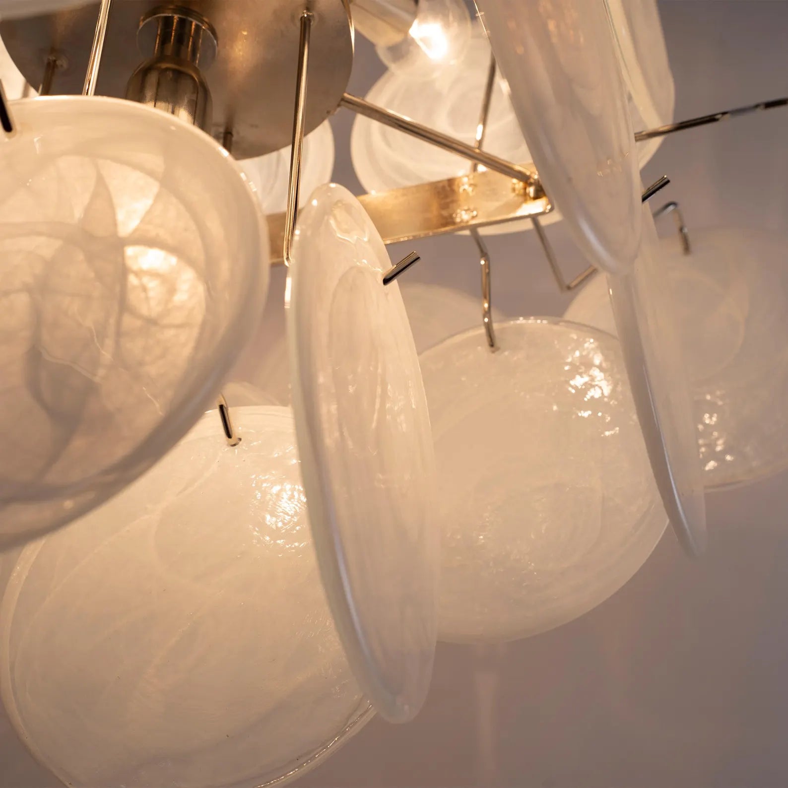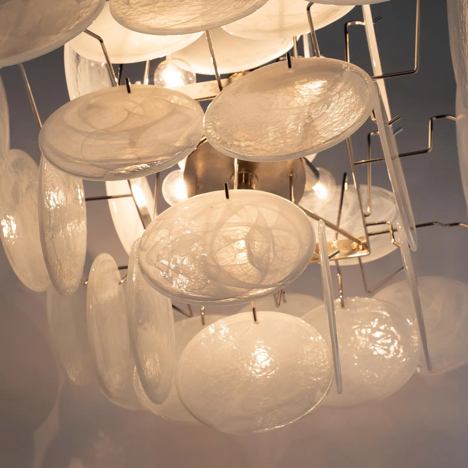 Spesifikasjoner: • Håndlaget i Murano, Italia • 36 glasskiver + reservedel inkludert • Farge: Alabaster White (andre farger på forespørsel) • Størrelse: Ø50 × H50 cm + justerbar kjetting (opptil 50 cm) • Vekt: ca. 15 kg • Materialer: Blåst glass, messing/stål • Ramme: Nikkel eller messing (valgbar finish) • Lyskilder: 5 × E12/E14 (ikke inkludert) • Rammen leveres ferdig montert – glass henges på ved mottak • Kjetting og takrosett inkludert