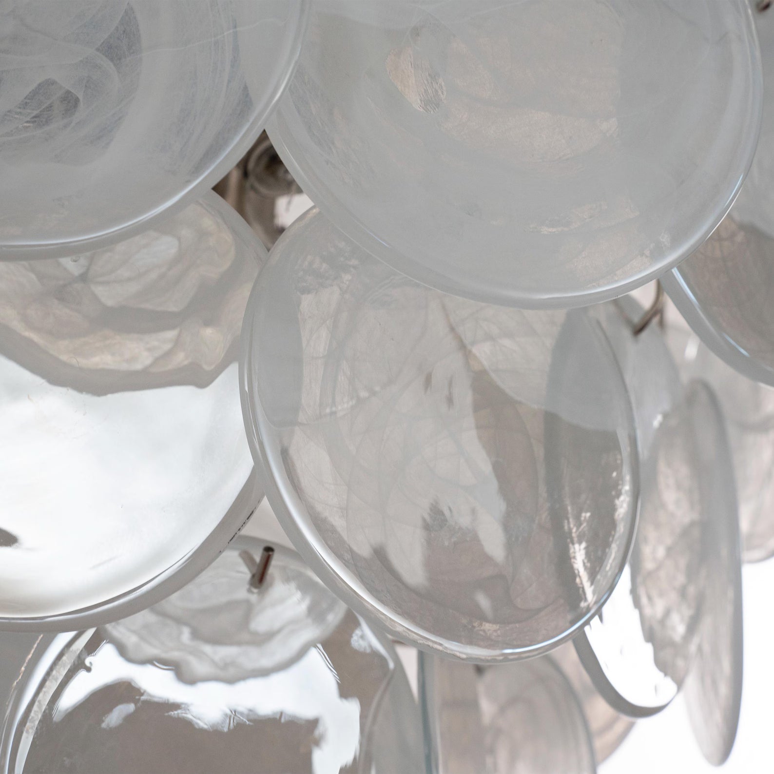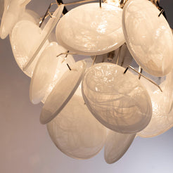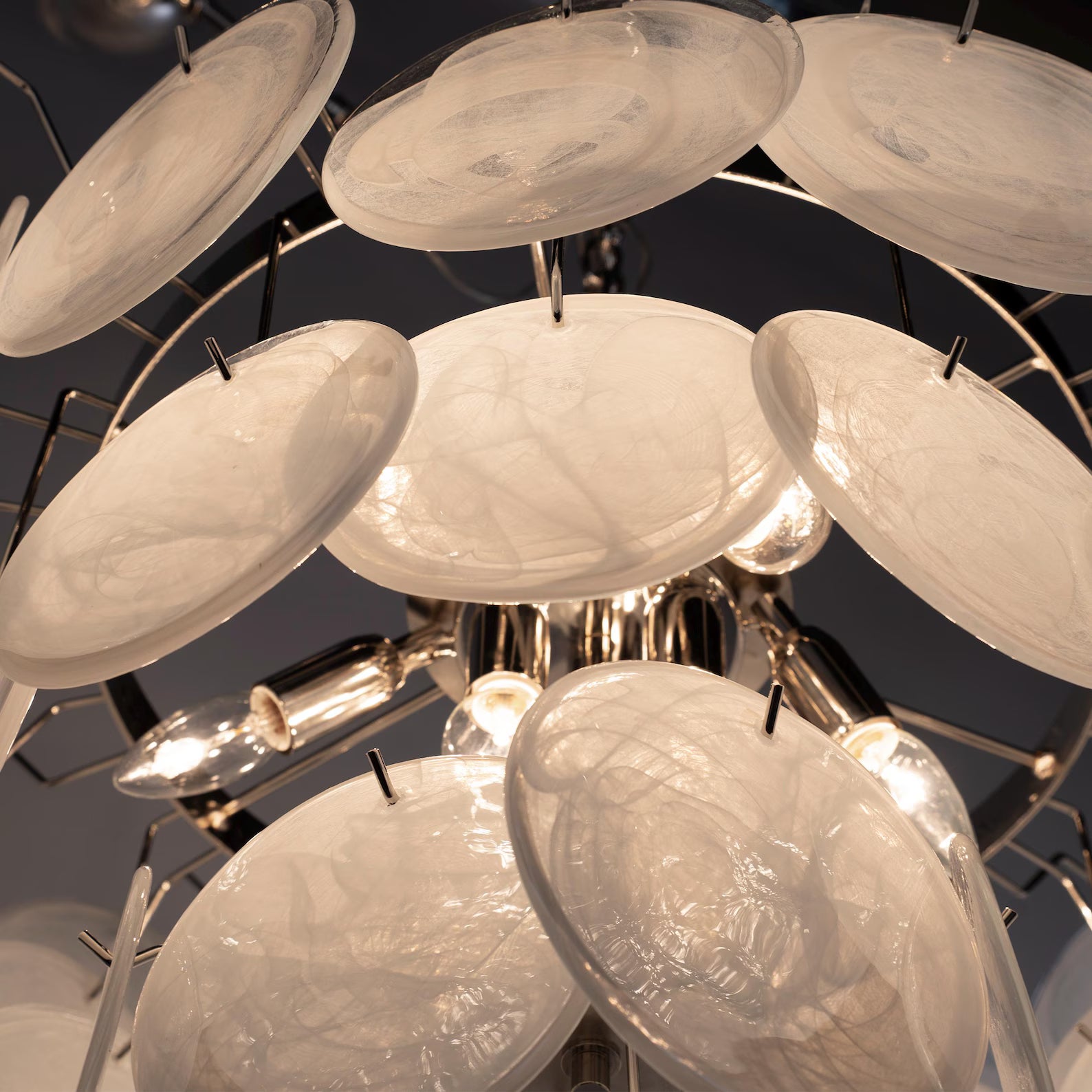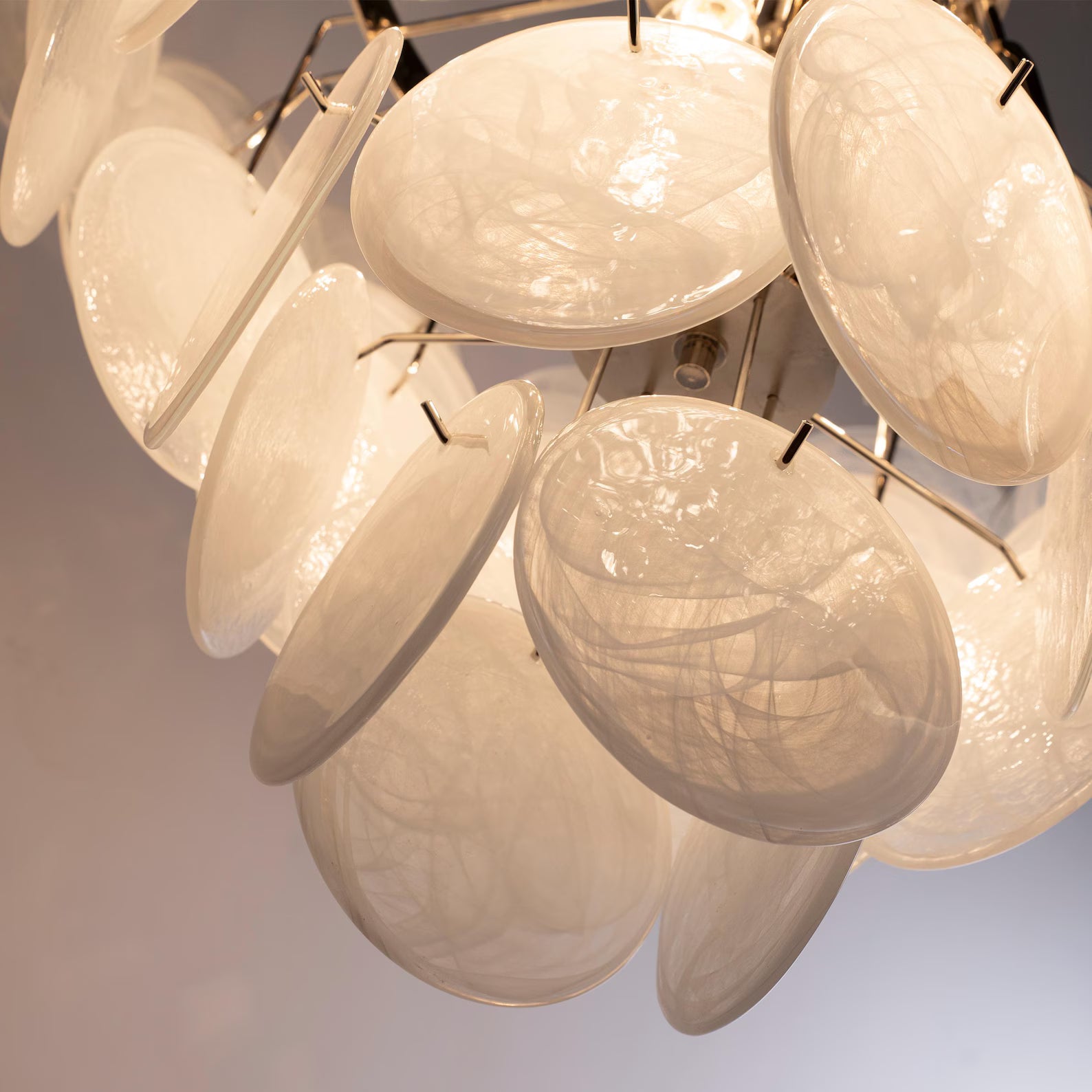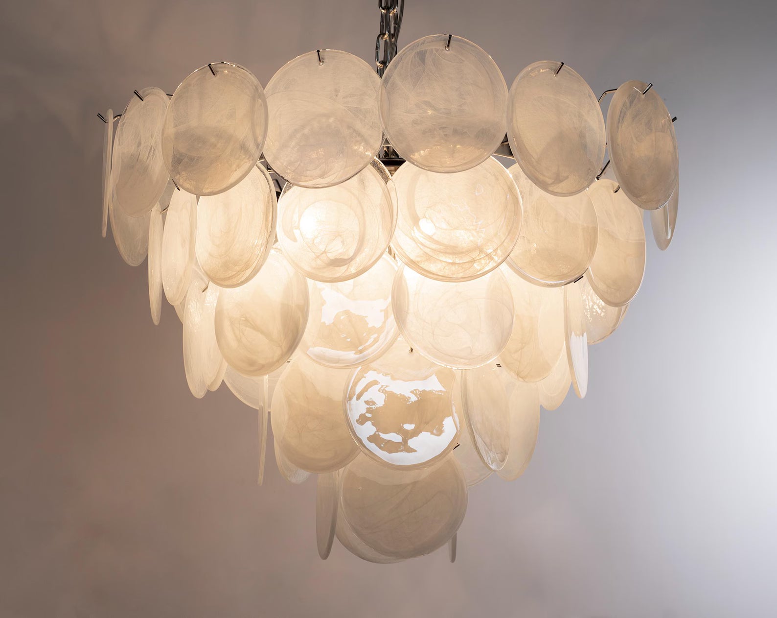Murano Discs Chandelier Ø90 består av 54 munnblåste glasskiver i Alabaster White Murano-glass, arrangert i flere nivåer som danner en balansert og skulpturell form. Det alabastermønstrede glasset filtrerer lyset med en myk glød og skaper en følelse av ro, luksus og tidløshet.
