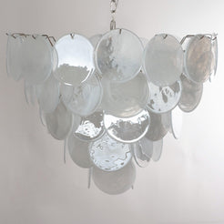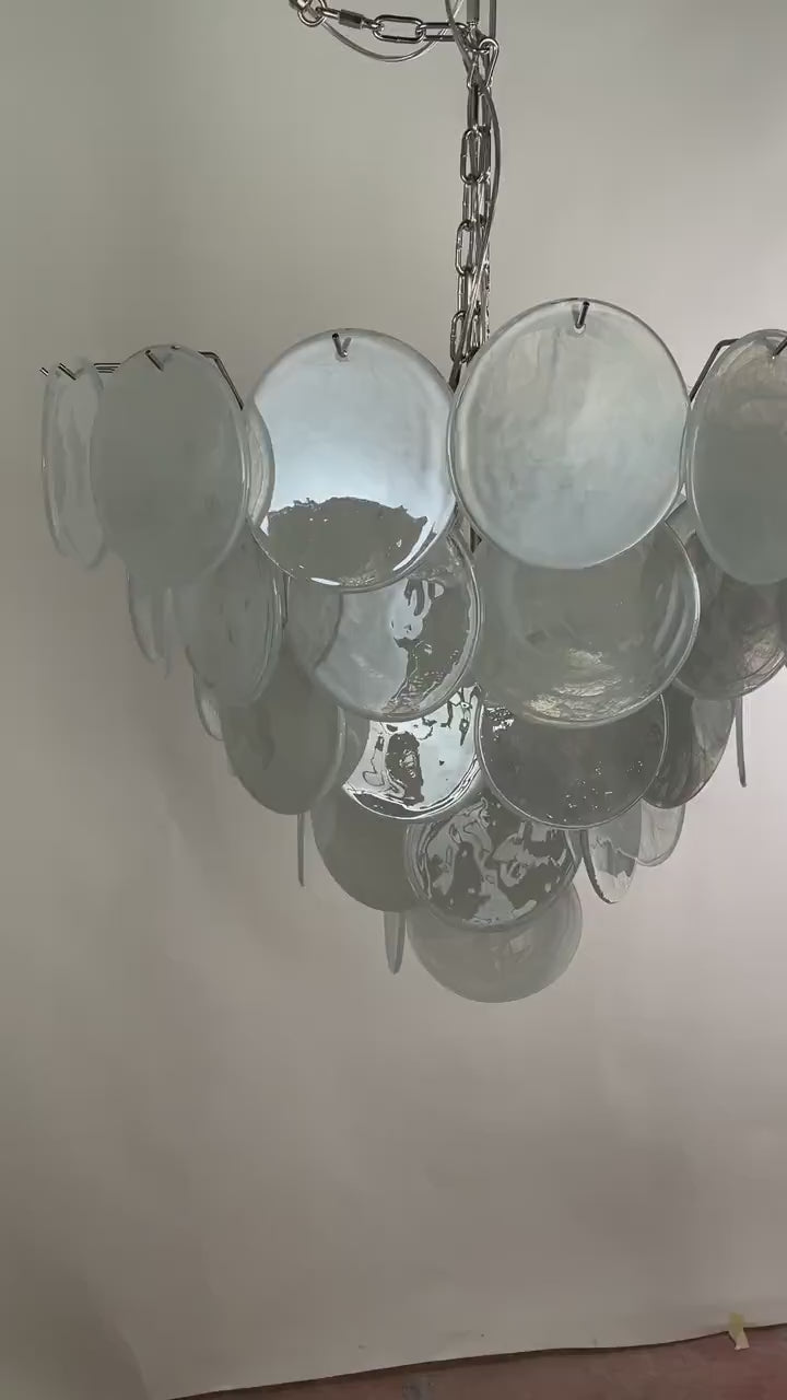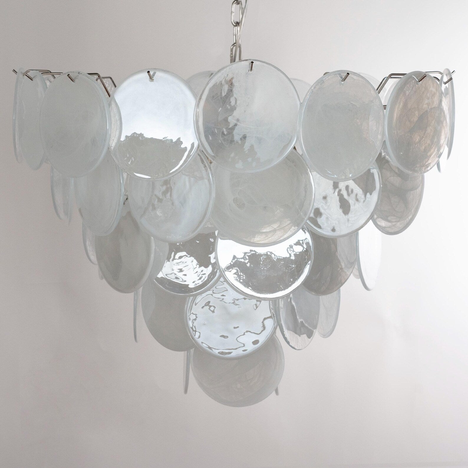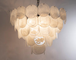 Spesifikasjoner: • Håndlaget i Murano, Italia • 54 glasskiver + reservedel inkludert • Farge: Alabaster White (andre farger på forespørsel) • Størrelse: Ø90 × H65 cm + justerbar kjetting (opptil 50 cm) • Vekt: ca. 30 kg • Materialer: Blåst glass, messing/stål • Ramme: Nikkel eller messing (valgbar finish) • Lyskilder: 9 × E12/E14 (ikke inkludert) • Rammen leveres ferdig montert – glass henges på ved mottak • Kjetting og takrosett inkludert