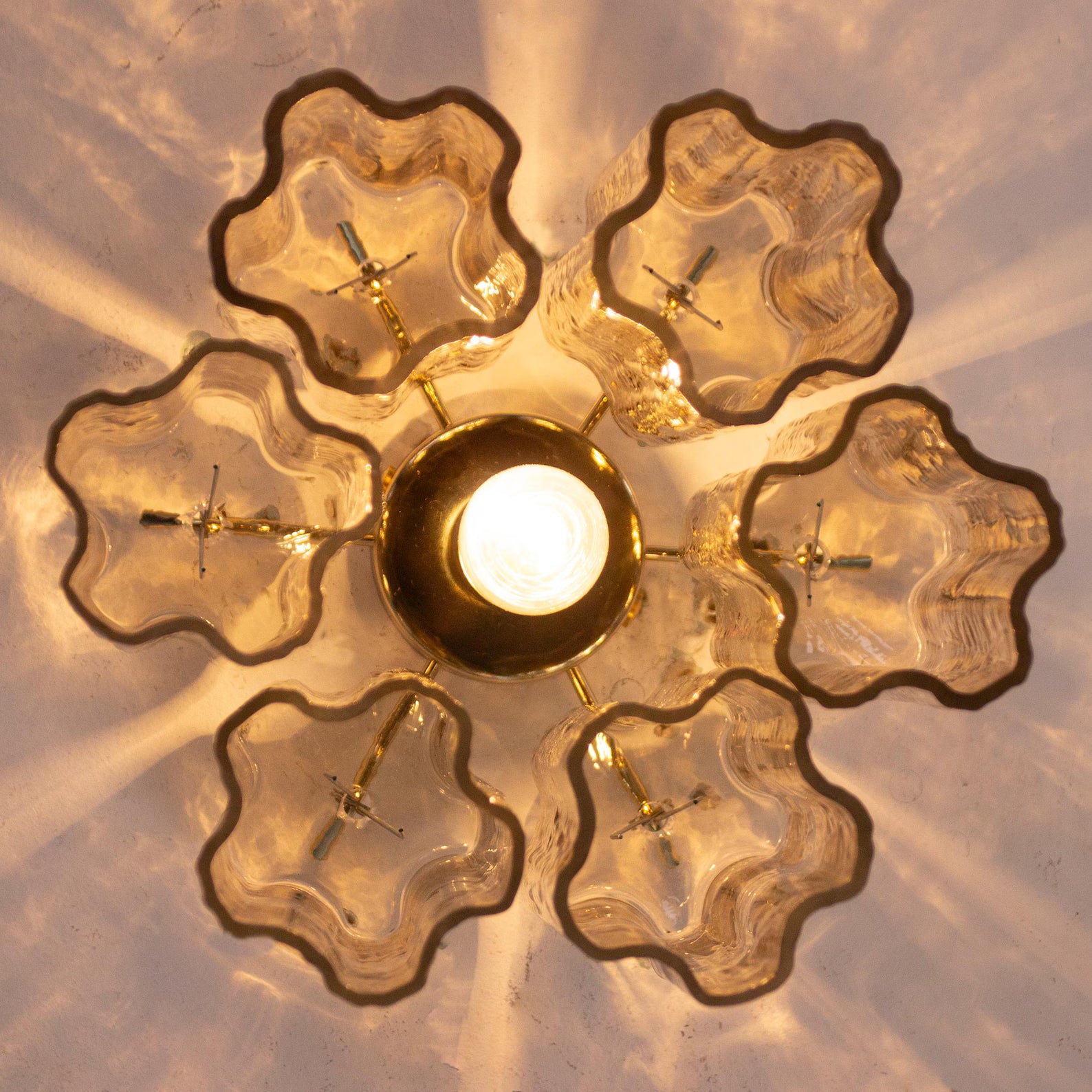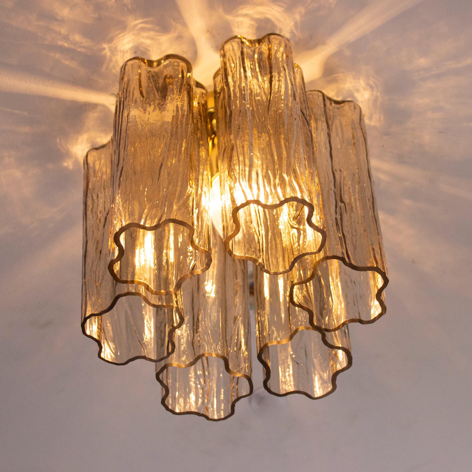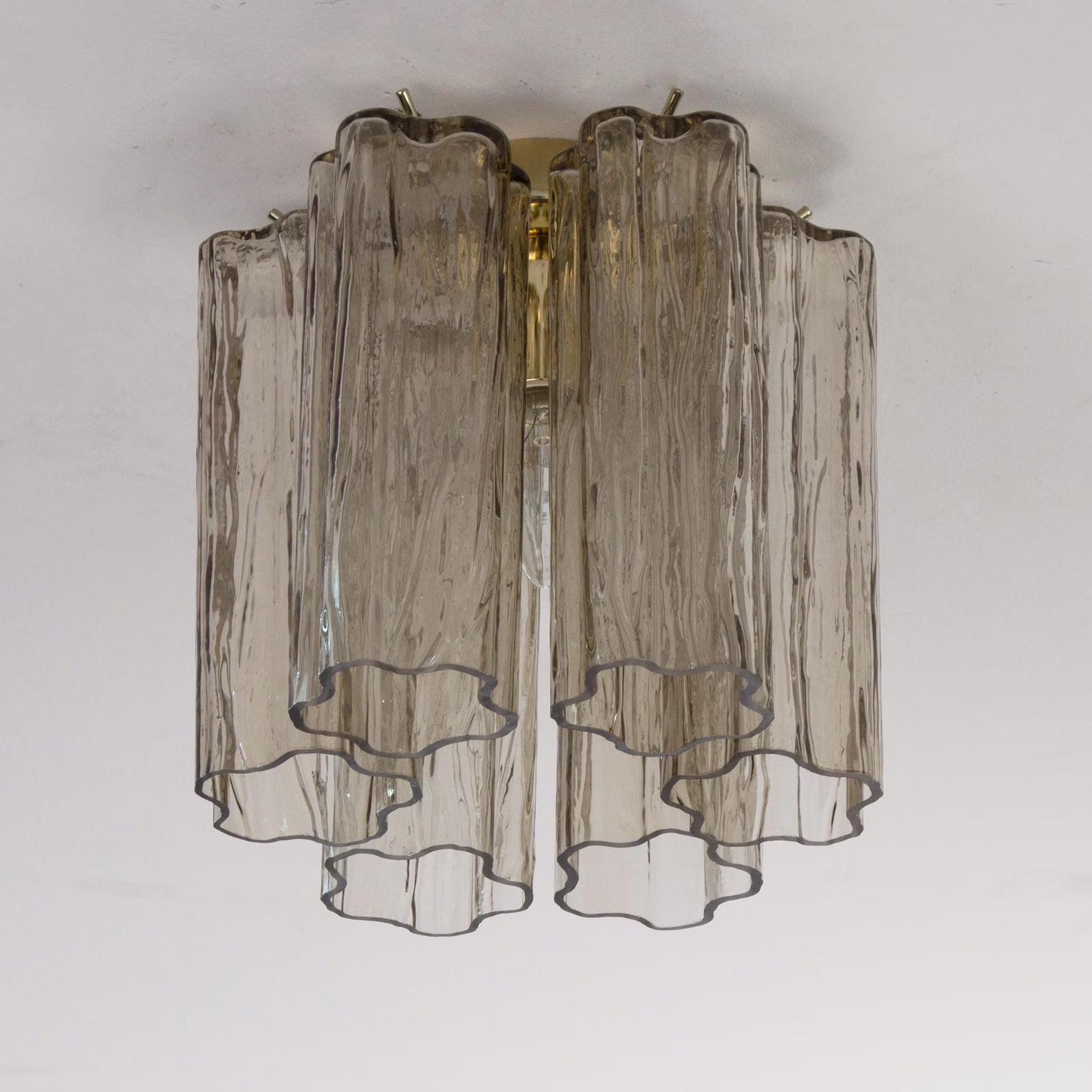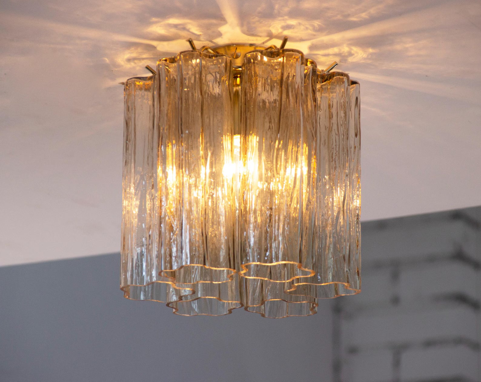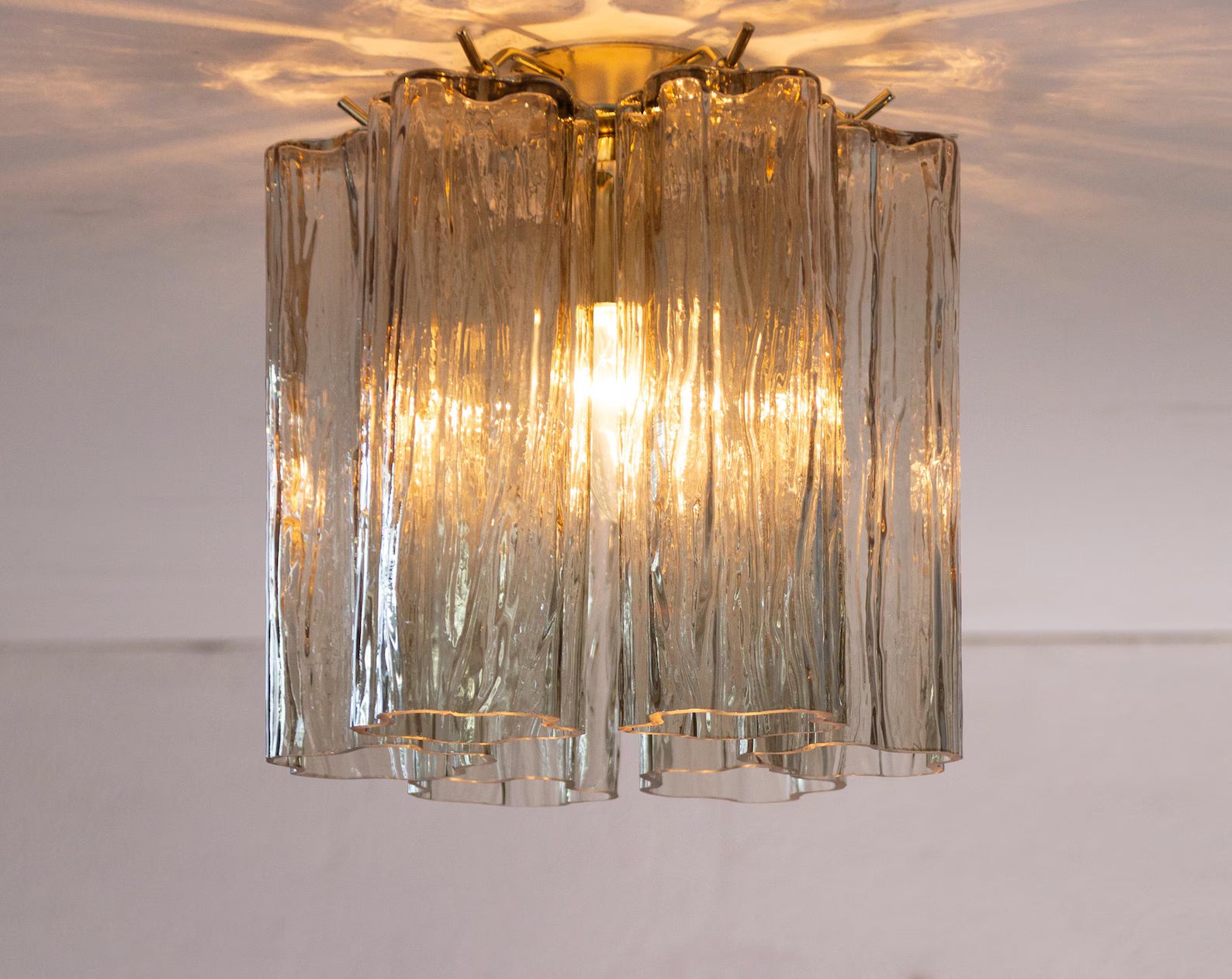 Et lite, men luksuriøst stykke Murano-glasskunst – ideelt for tak med lav høyde eller som del av et elegant belysningsoppsett.