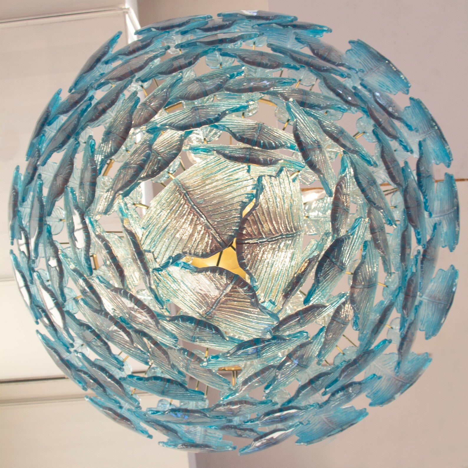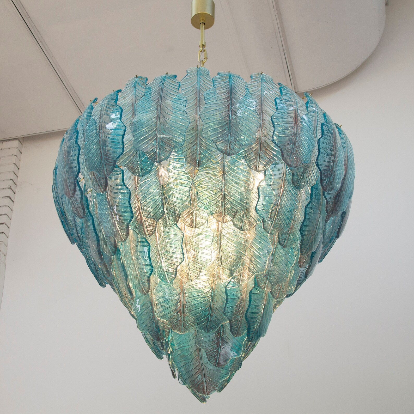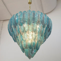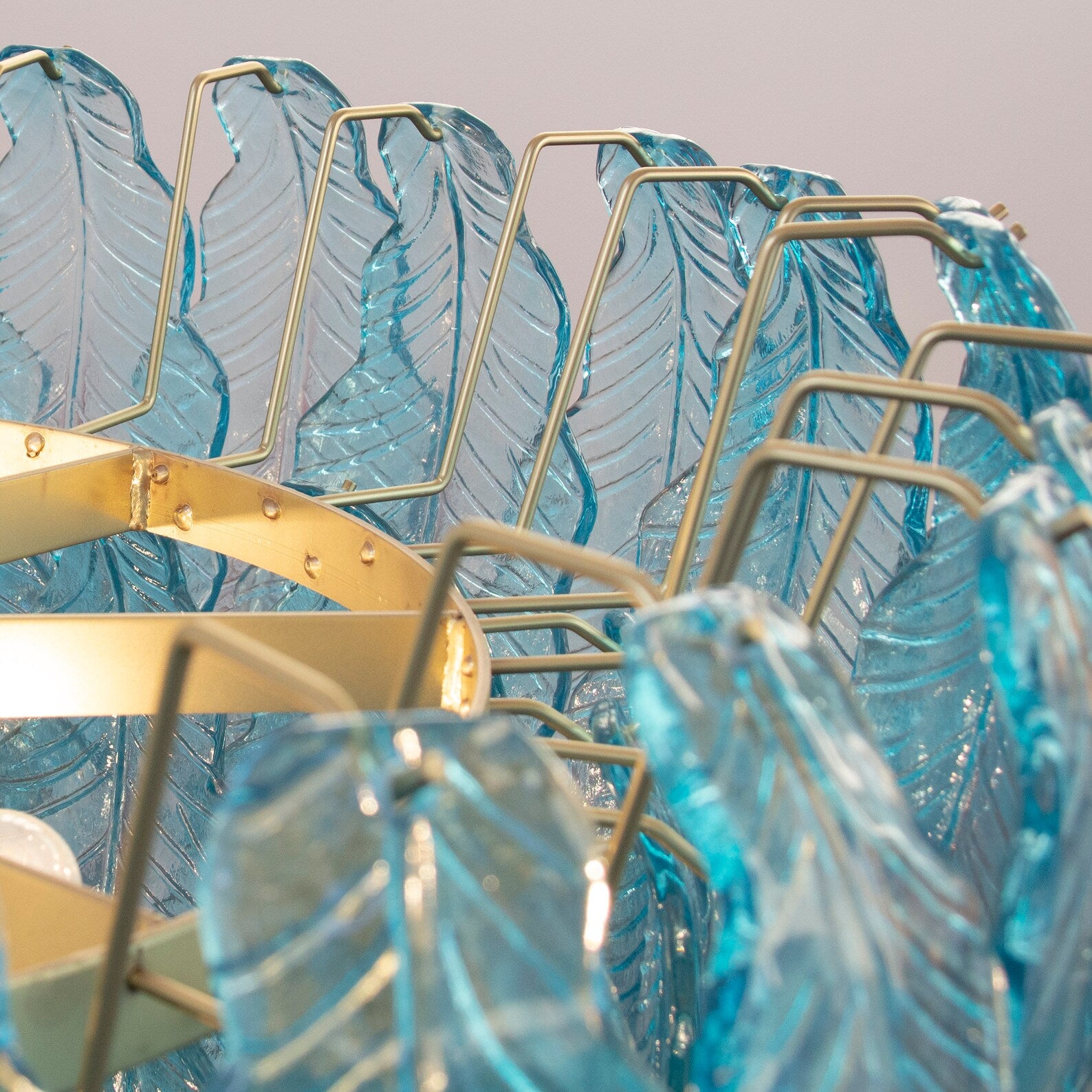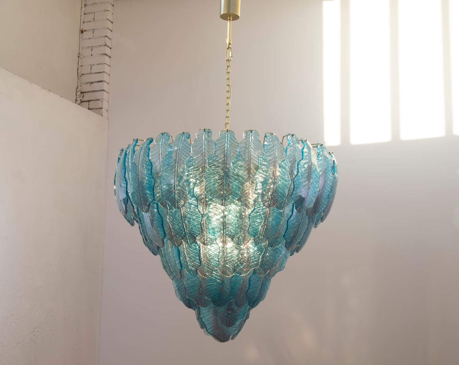 Spesifikasjoner: • Håndlaget i Murano, Italia • 94 glassblader + reservedel inkludert • Farge: Aqua (andre farger på forespørsel) • Størrelse: Ø105 × H95 cm + justerbar kjetting (opptil 50 cm) • Vekt: ca. 85 kg • Materialer: Blåst glass, messing/stål • Ramme: Messing finish • Lyskilder: 12 × E12/E14 (ikke inkludert) • Rammen leveres ferdig montert – glass henges på ved mottak • Kjetting og takrosett inkludert