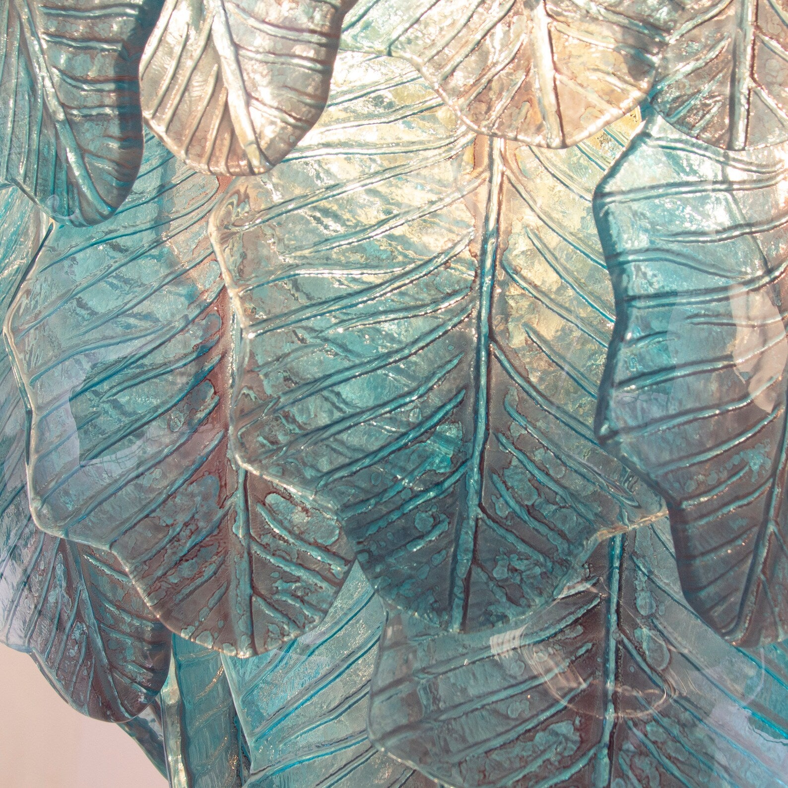 Murano Leaves Chandelier Ø105 består av 94 håndblåste glassblader i myk Aqua Murano-glass, arrangert i fem nivåer som danner en luftig og elegant silhuett. Den transparente blågrønne tonen skaper et vakkert spill av lys og skygge, og gir rommet en følelse av ro, friskhet og raffinert eleganse.