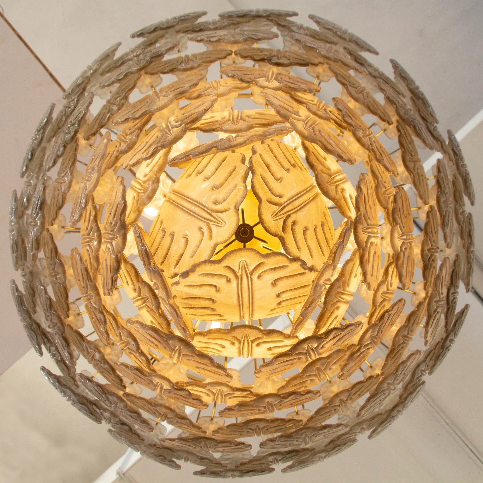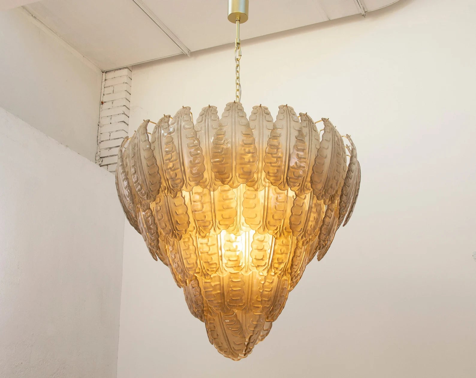 Spesifikasjoner: • Håndlaget i Murano, Italia • 94 glassblader + reservedel inkludert • Farge: Smoke (andre farger på forespørsel) • Størrelse: Ø105 × H95 cm + justerbar kjetting (opptil 50 cm) • Vekt: ca. 85 kg • Materialer: Blåst glass, messing/stål • Ramme: Messing finish • Lyskilder: 12 × E12/E14 (ikke inkludert) • Rammen leveres ferdig montert – glass henges på ved mottak • Kjetting og takrosett inkludert