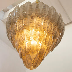 Murano Leaves Chandelier Ø105 består av 94 håndblåste glassblader i elegant røykfarget Murano-glass, arrangert i fem nivåer som gir lampen et imponerende og skulpturelt uttrykk. Den myke, transparente røyktone gir et varmt og moderne preg, mens lyset filtreres gjennom glasset med subtil glød.