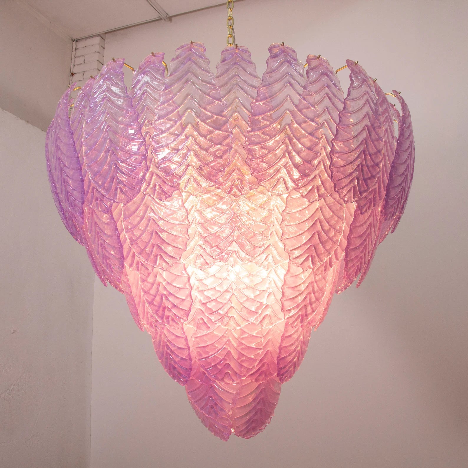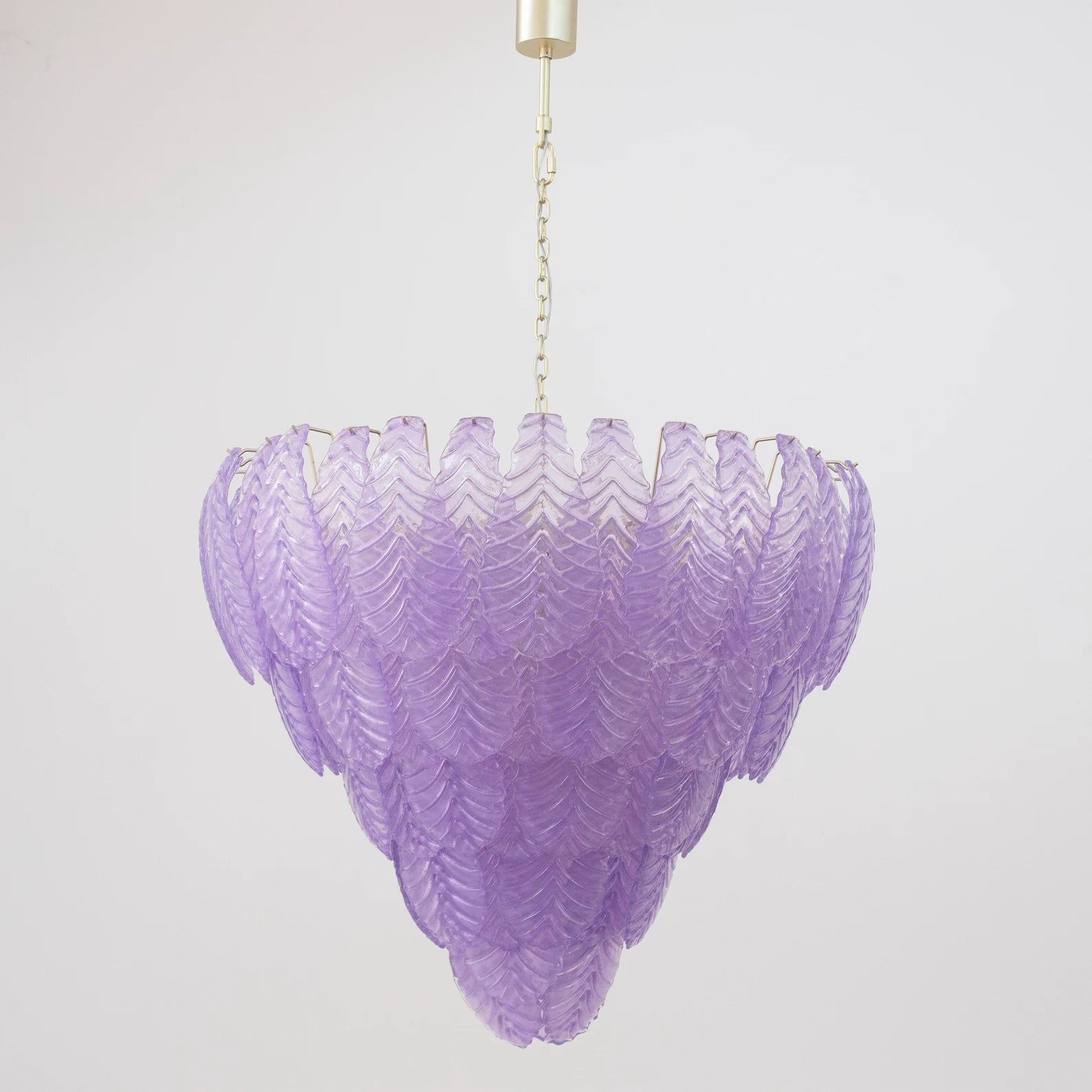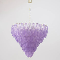 Spesifikasjoner: • Håndlaget i Murano, Italia • 94 glassblader + reservedel inkludert • Farge: Violet/Lavender (andre farger på forespørsel) • Størrelse: Ø105 × H95 cm + justerbar kjetting (opptil 50 cm) • Vekt: ca. 85 kg • Materialer: Blåst glass, messing/stål • Ramme: Messing finish • Lyskilder: 12 × E12/E14 (ikke inkludert) • Rammen leveres ferdig montert – glass henges på ved mottak • Kjetting og takrosett inkludert