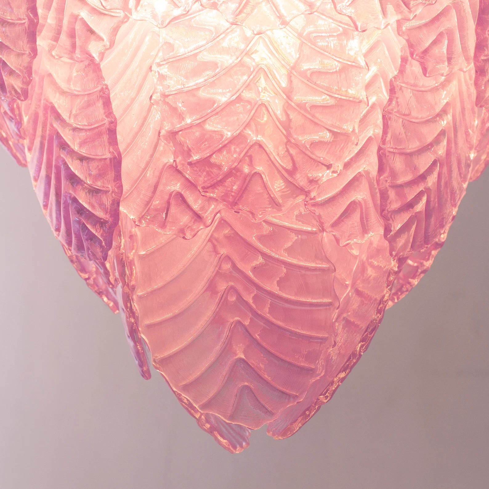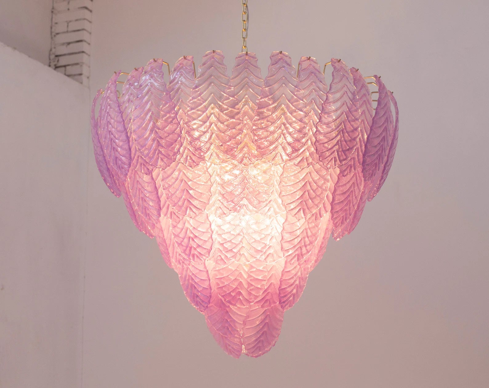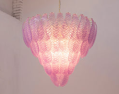 Murano Leaves Chandelier Ø105 består av 94 håndblåste glassblader i delikat Violet/Lavender Murano-glass, arrangert i fem nivåer som danner en skulpturell og harmonisk silhuett. De myke lavendelfargene filtrerer lyset med en subtil, romantisk glød som gir rommet en følelse av ro, eleganse og luksus.