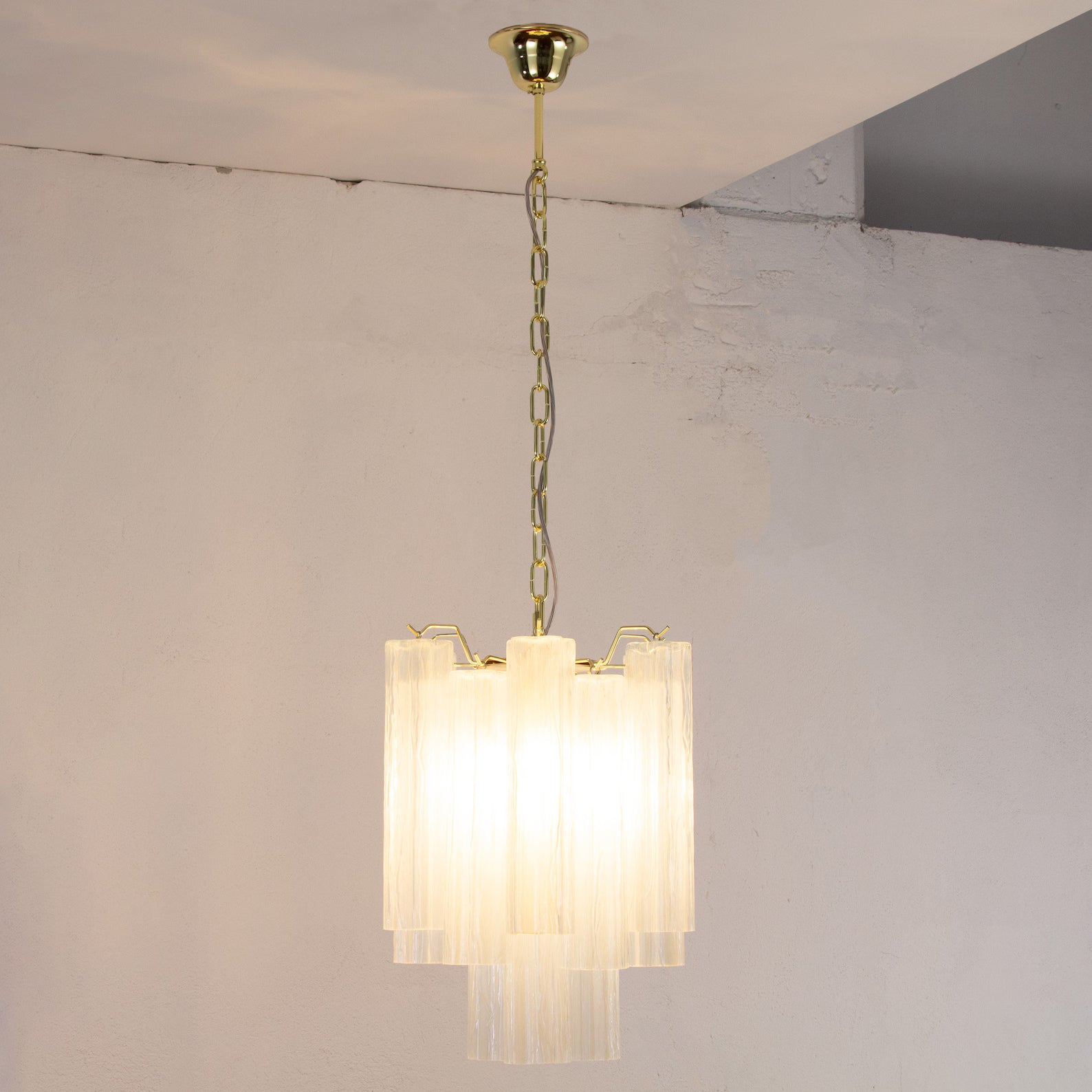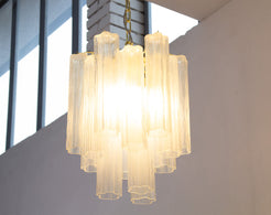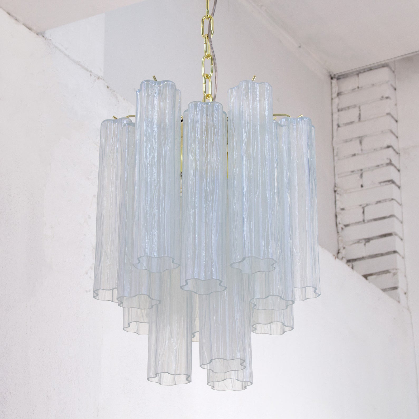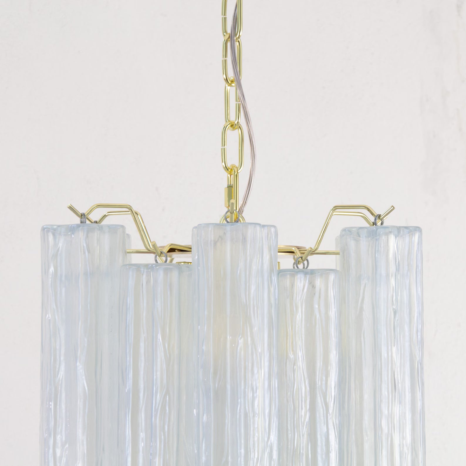 Spesifikasjoner: • Håndlaget i Murano, Italia • Farge: Opal (andre farger på forespørsel) • Dimensjoner: Ø45 × H63 cm + justerbar kjetting (opptil 50 cm) • Dekorative elementer: 15 glassrør + reservedel inkludert • Ramme: Nikkel eller messing • Lyskilder: 5 × E12/E14 (ikke inkludert)