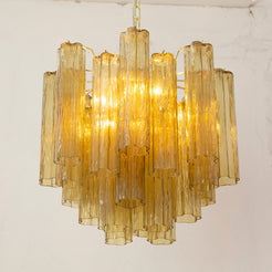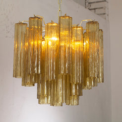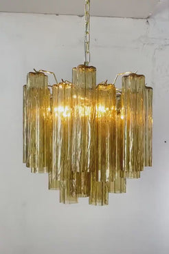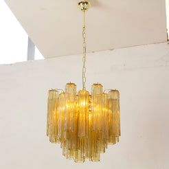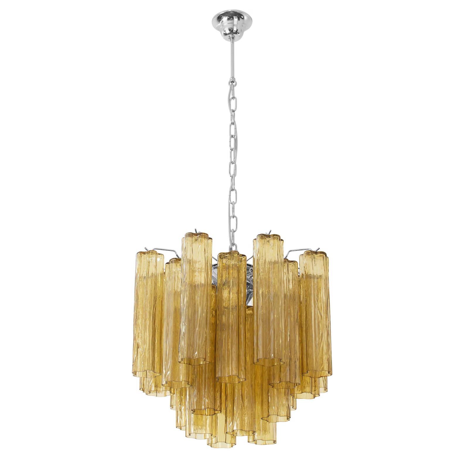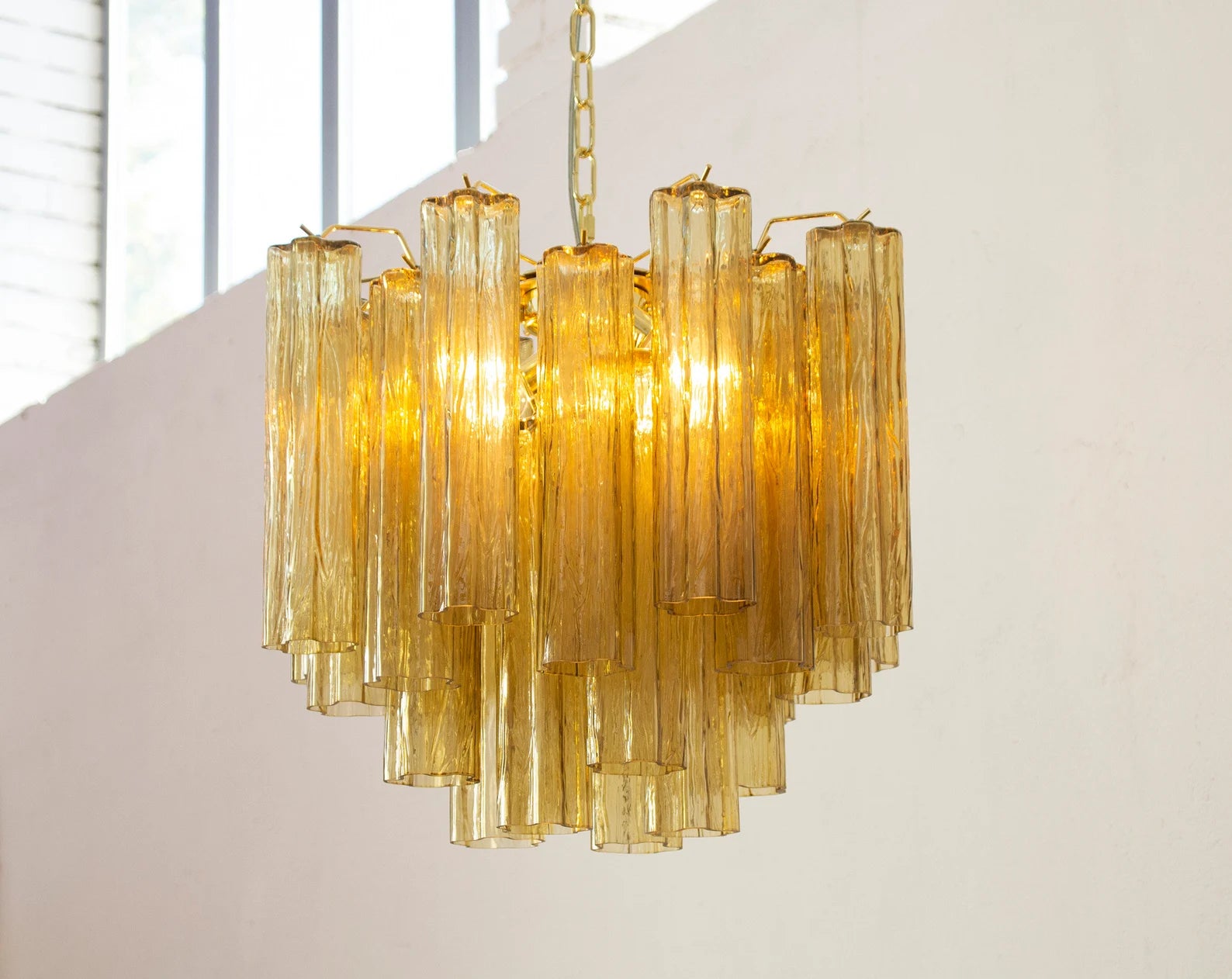 Denne modellen fra Tronchi-kolleksjonen er sammensatt av 24 rørformede glasselementer, kalt tronchi, oppkalt etter sin barklignende form. Glassene er munnblåst i Pagliesco Murano-glass – en gyllen, halmaktig tone som gir et varmt, elegant og tidløst uttrykk. Den kompakte størrelsen gjør lysekronen perfekt til stue, entre, soverom eller over et mindre spisebord, der den tilfører italiensk luksus og karakter.