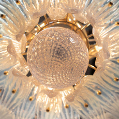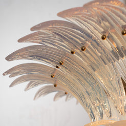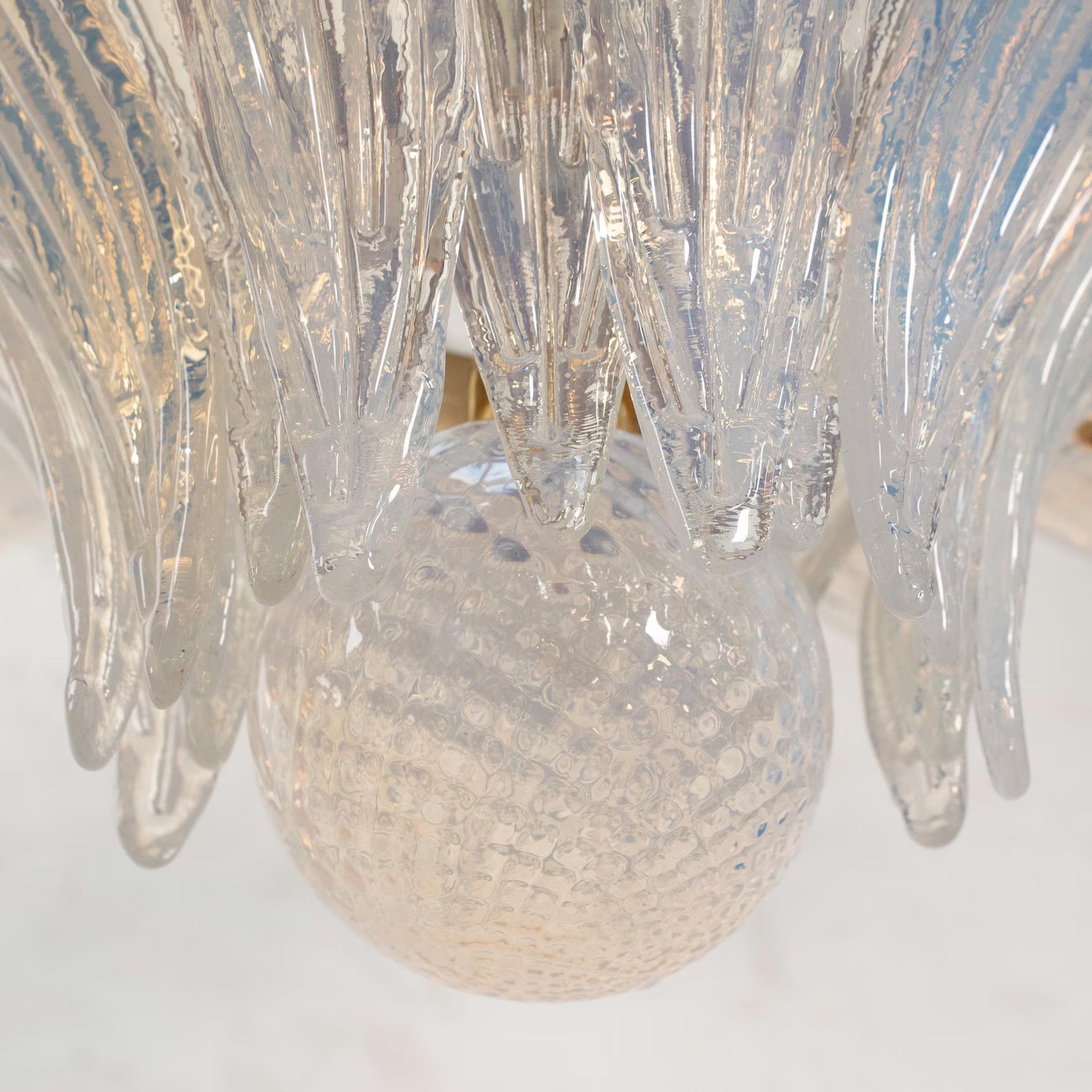 Et mesterverk av italiensk håndverk og skulpturell lysdesign. Murano Palmette Chandelier er en håndlaget lysekrone i to nivåer, med blader formet av munnblåst opalglass med en subtil iriserende glød. Hver glassblad fanger lyset og reflekterer det med en delikat perlemorseffekt som gir rommet et mykt, luksuriøst preg. Den sentrale kulen i Murano-glass balanserer designet og tilfører et klassisk uttrykk med moderne finesse.