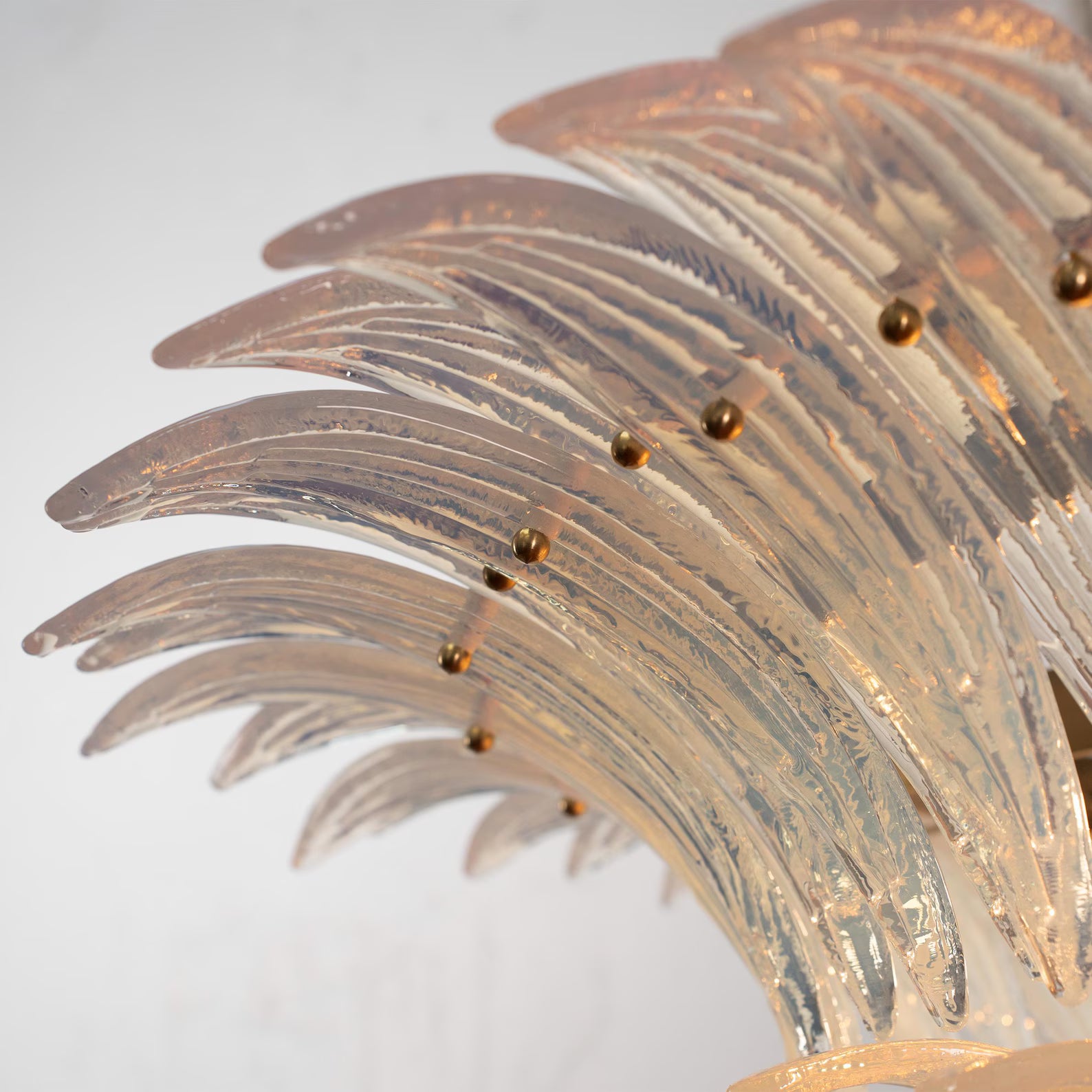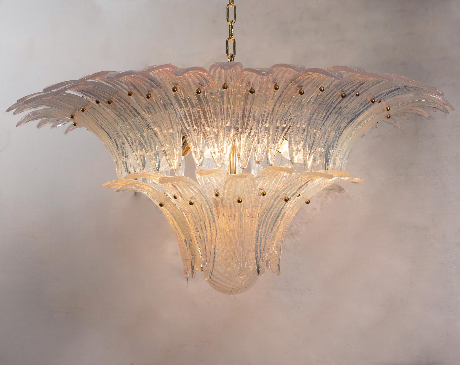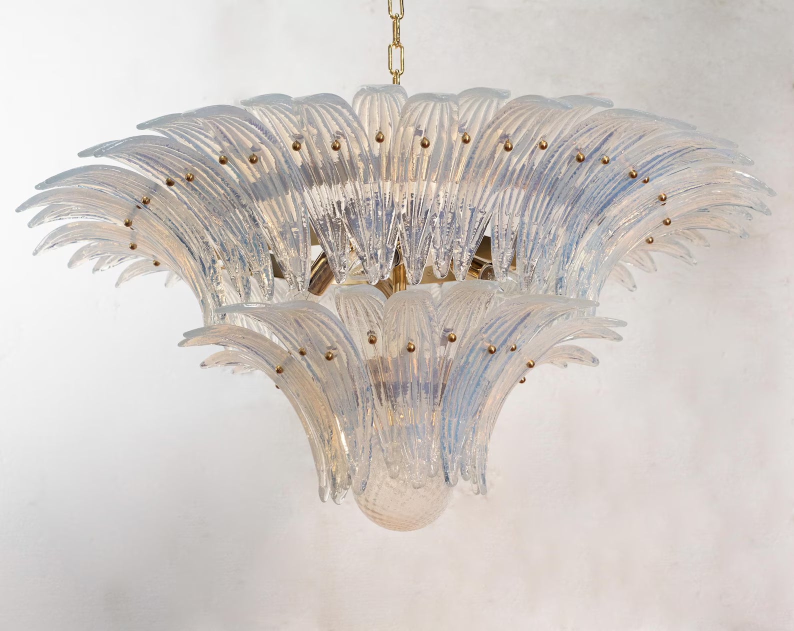 Spesifikasjoner: • Håndlaget i Murano, Italia • Modell: Palmette – 2 nivåer • Farge: Opal iridescent glass (andre farger på forespørsel) • Dimensjoner: Ø87 × H45 cm + justerbar kjetting (opptil 50 cm) • Vekt: ca. 40 kg • Lyskilder: 4 × E12/E14 (ikke inkludert) • Kjetting og takrosett inkludert • Materialer: Munnblåst glass, stål og messing • Skreddersydde bestillinger: 6–8 ukers leveringstid