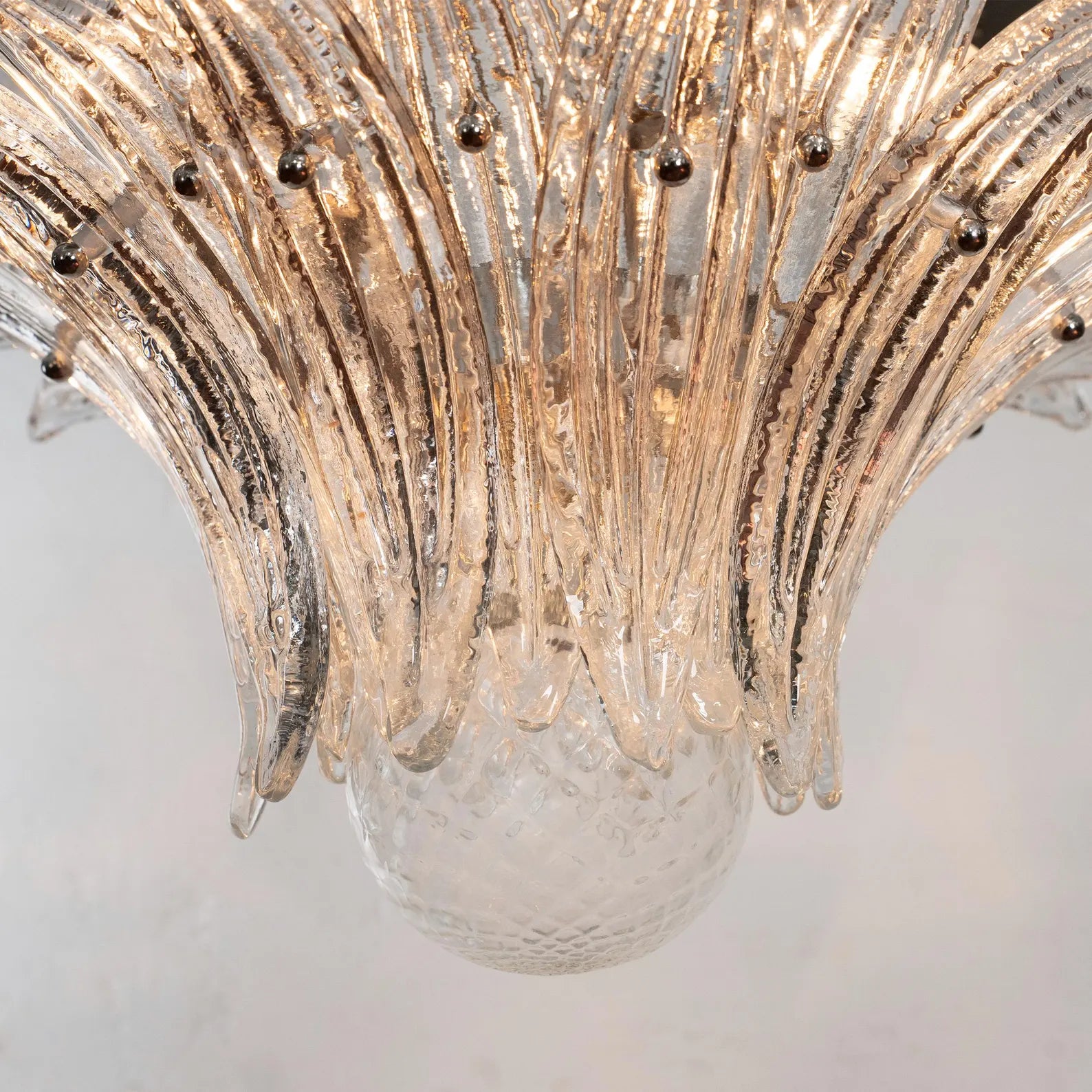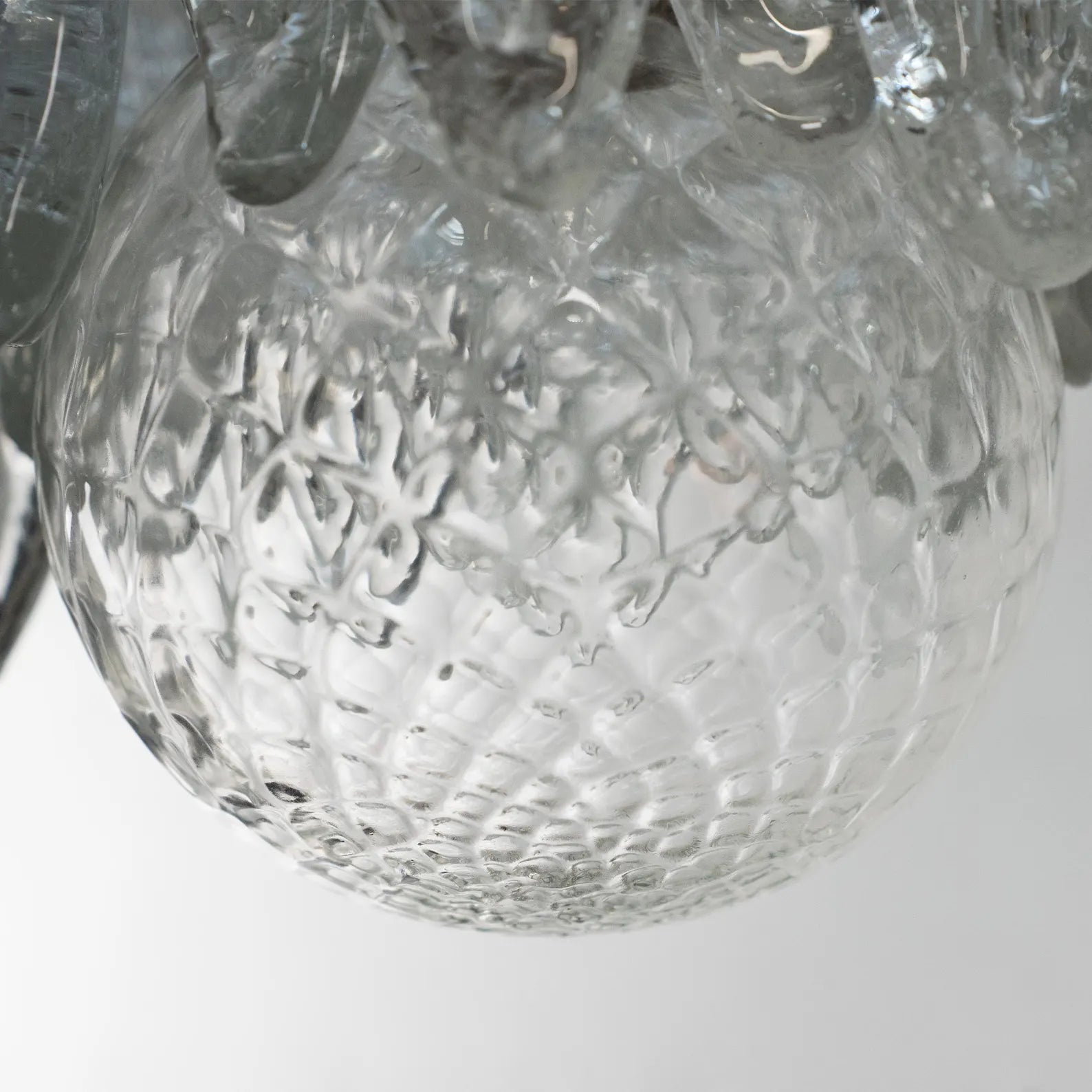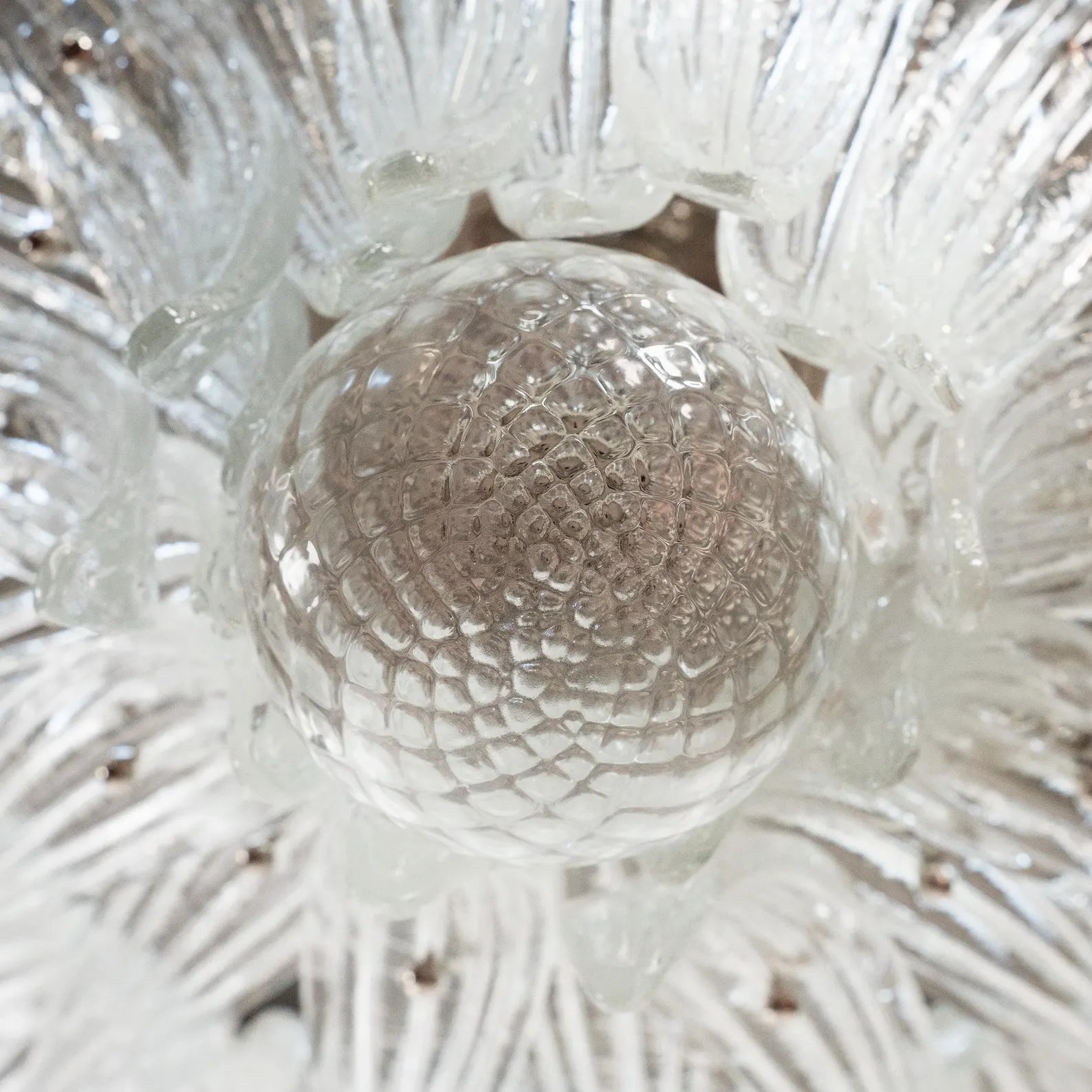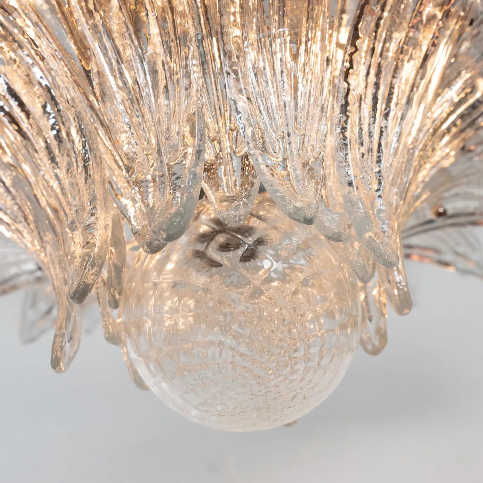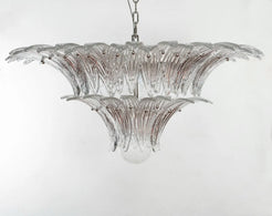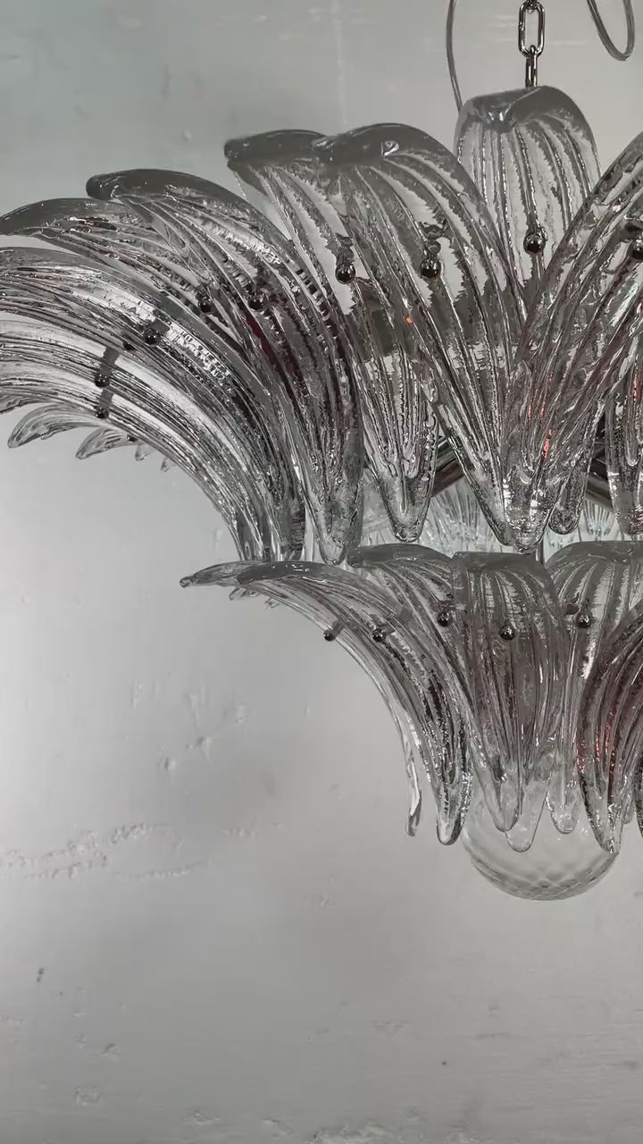 Spesifikasjoner: • Håndlaget i Murano, Italia • 2 nivåer med håndblåste glassblader + sentral glasskule • Farge: Klart Murano-glass (andre farger på forespørsel) • Størrelse: Ø85 × H45 cm + justerbar kjetting (opptil 50 cm) • Vekt: ca. 40 kg • Materialer: Blåst glass, messing/stål • Lyskilder: 4 × E12/E14 (ikke inkludert) • Kjetting og takrosett inkludert • Leveringstid ved spesialbestilling: 6–8 uker