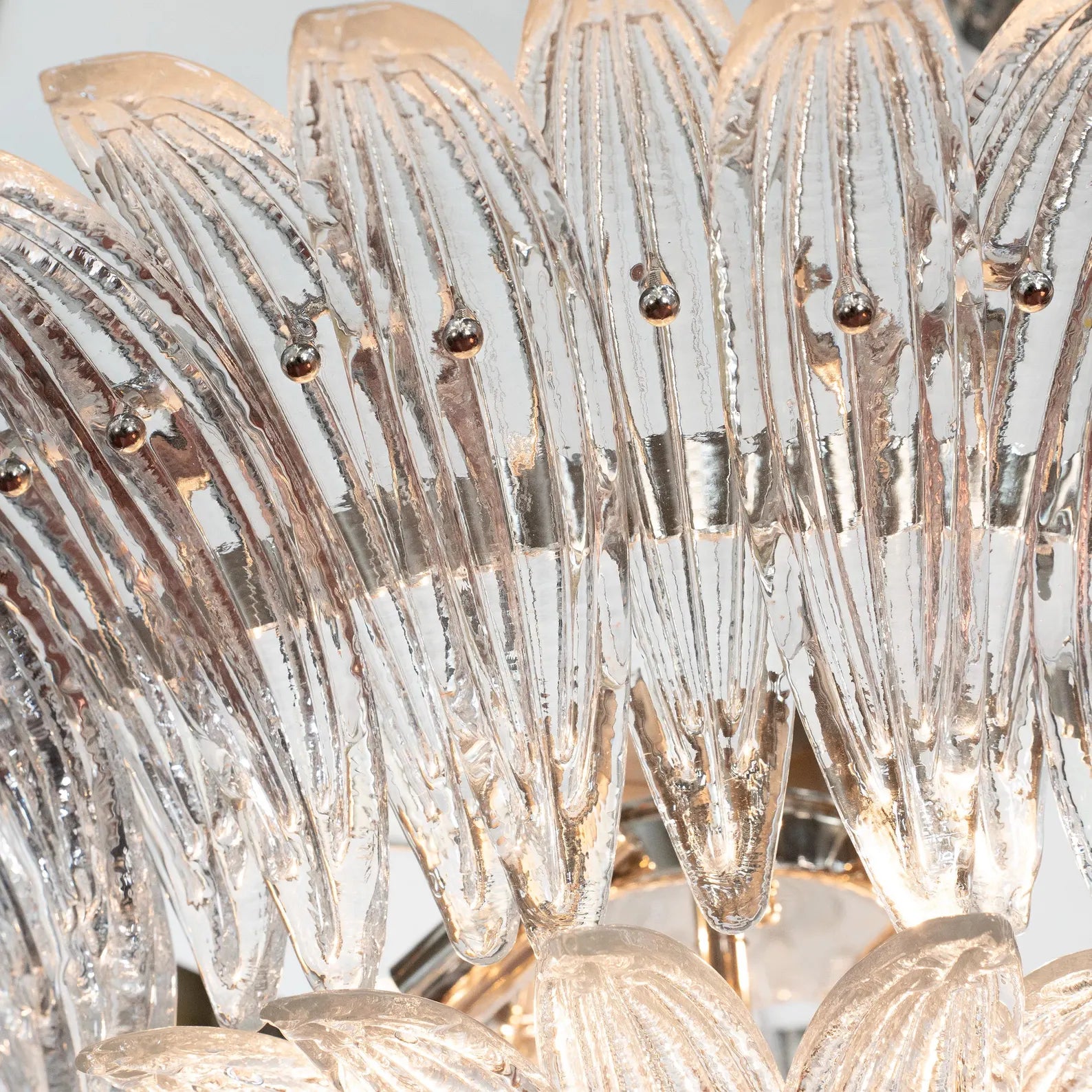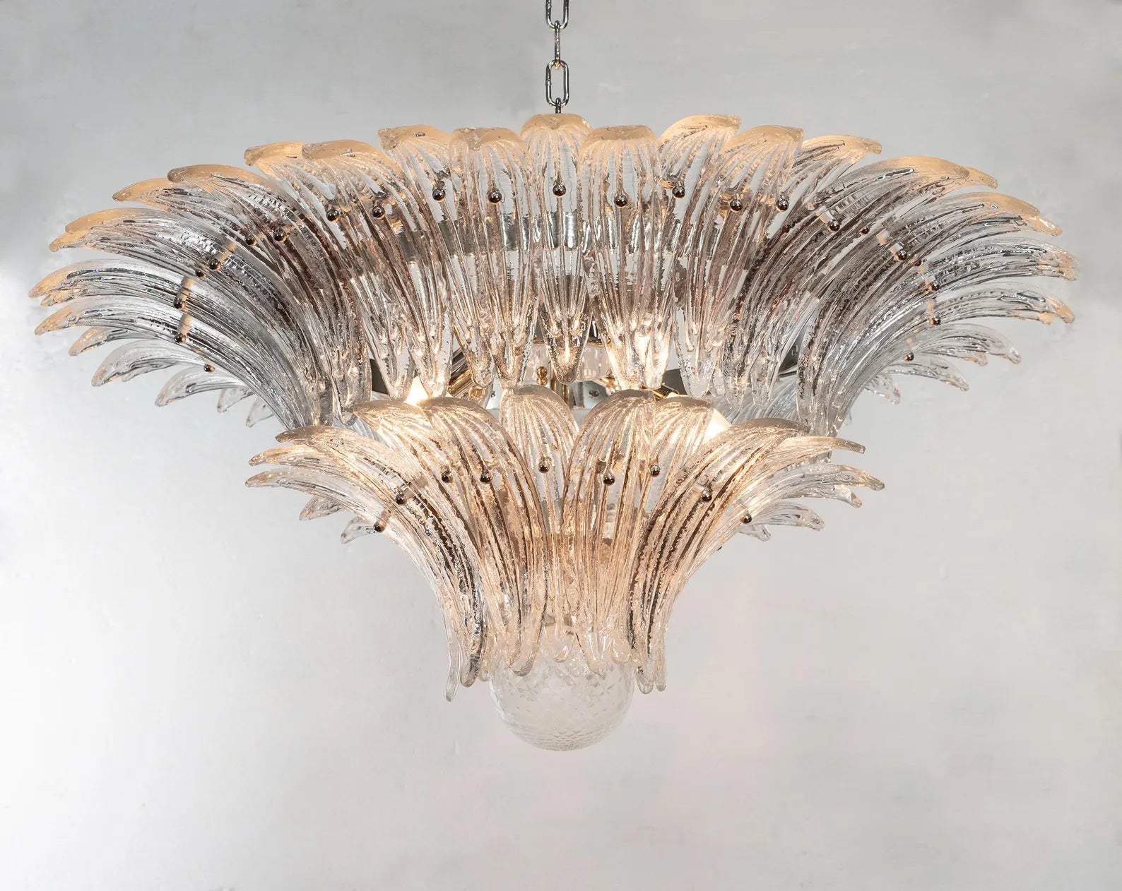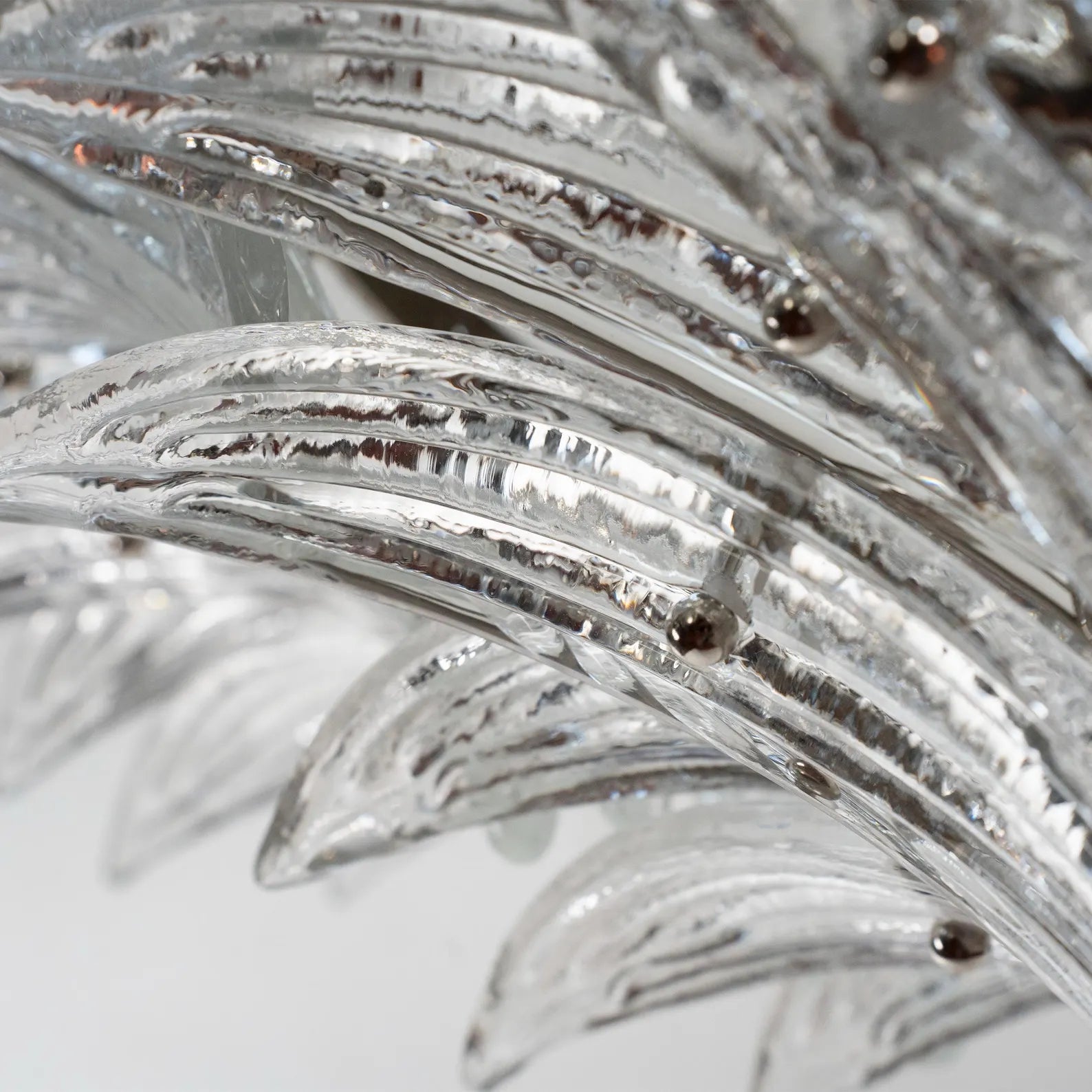 Murano Palmette Chandelier Ø85 består av to nivåer med håndblåste glassblader i krystallklart Murano-glass, arrangert rundt en sentral glasskule. Den klassiske Palmette-formen gir lampen et organisk og skulpturelt uttrykk som fanger lyset med subtil glans og raffinement.