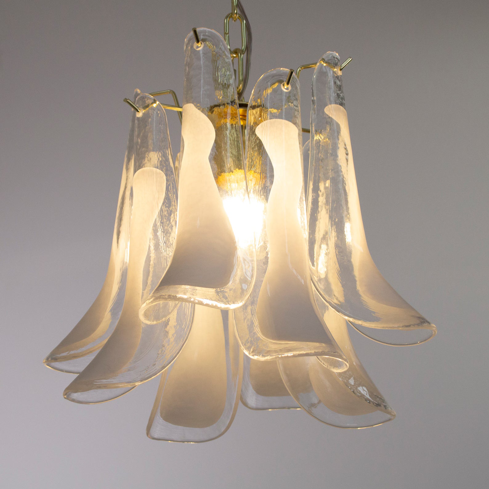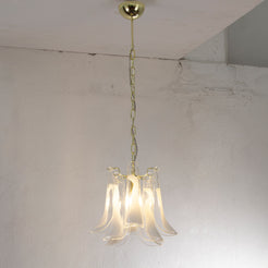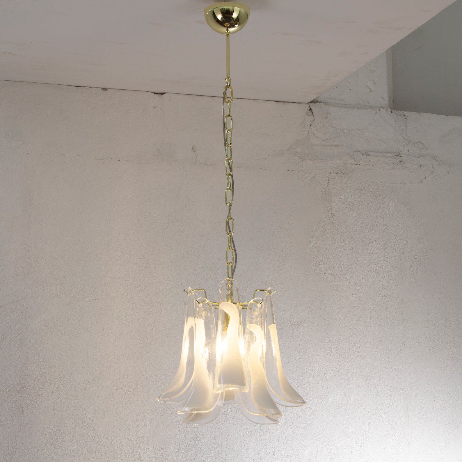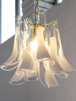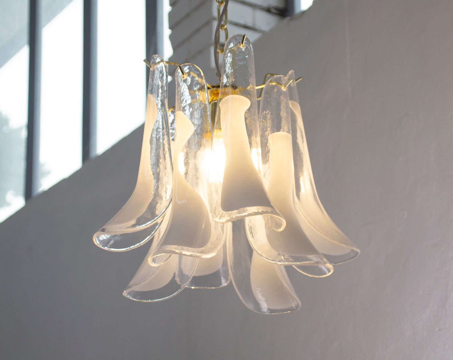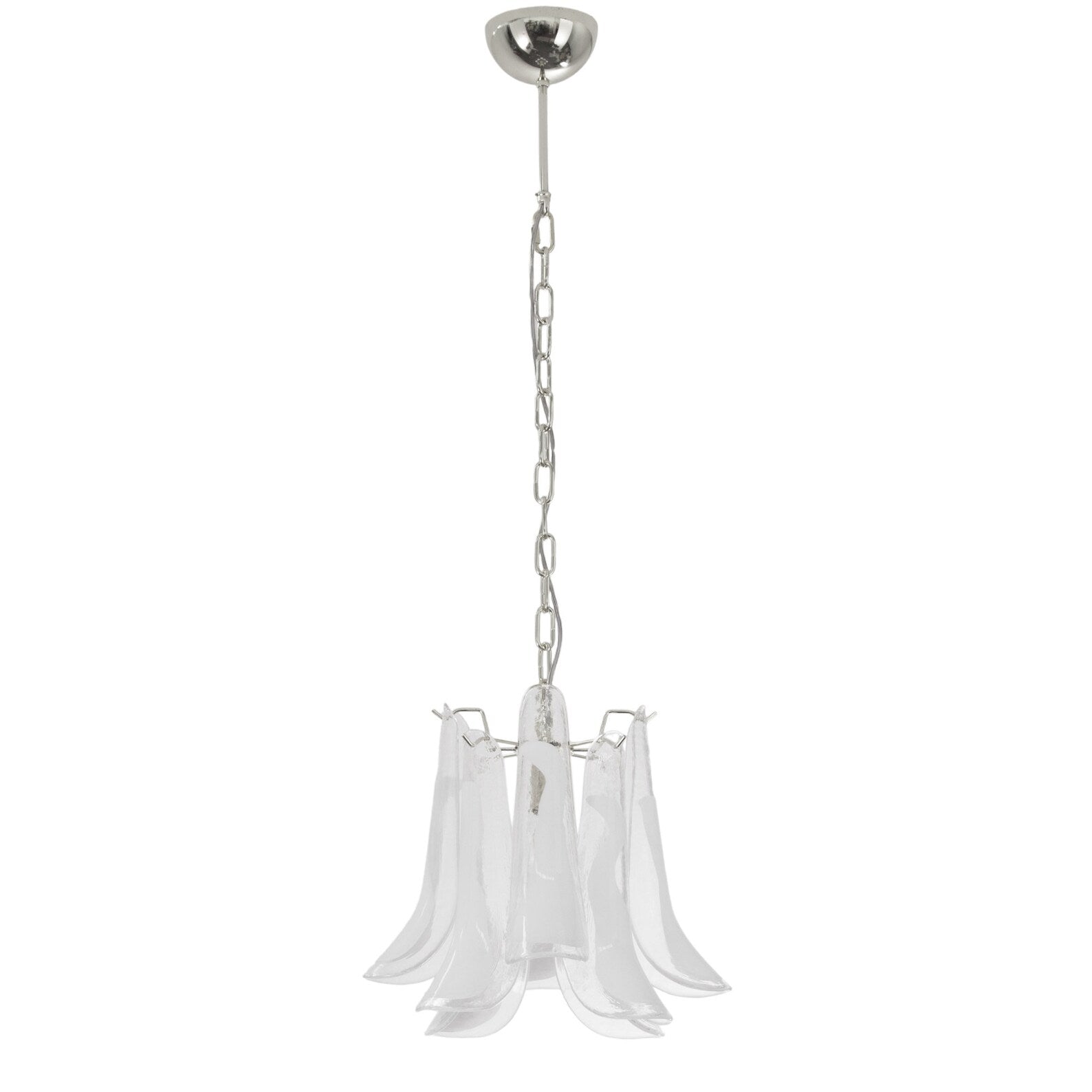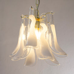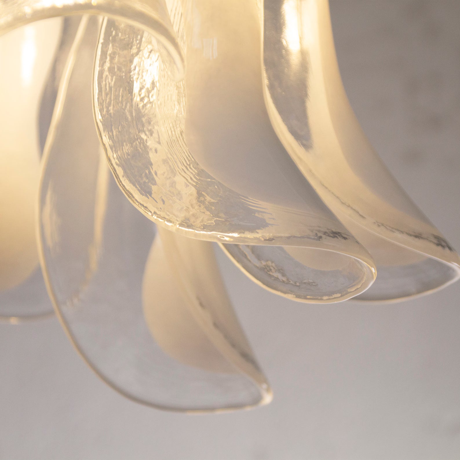 Murano Petali Chandelier Ø33 er laget for hånd i Italia og består av munnblåste glasselementer formet som blomsterblader – petali – som fanger lyset med en subtil glød. Den kombinerer klart og hvitt Murano-glass med en elegant ramme i messing eller nikkel, og gir et luksuriøst, feminint uttrykk til ethvert rom.