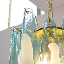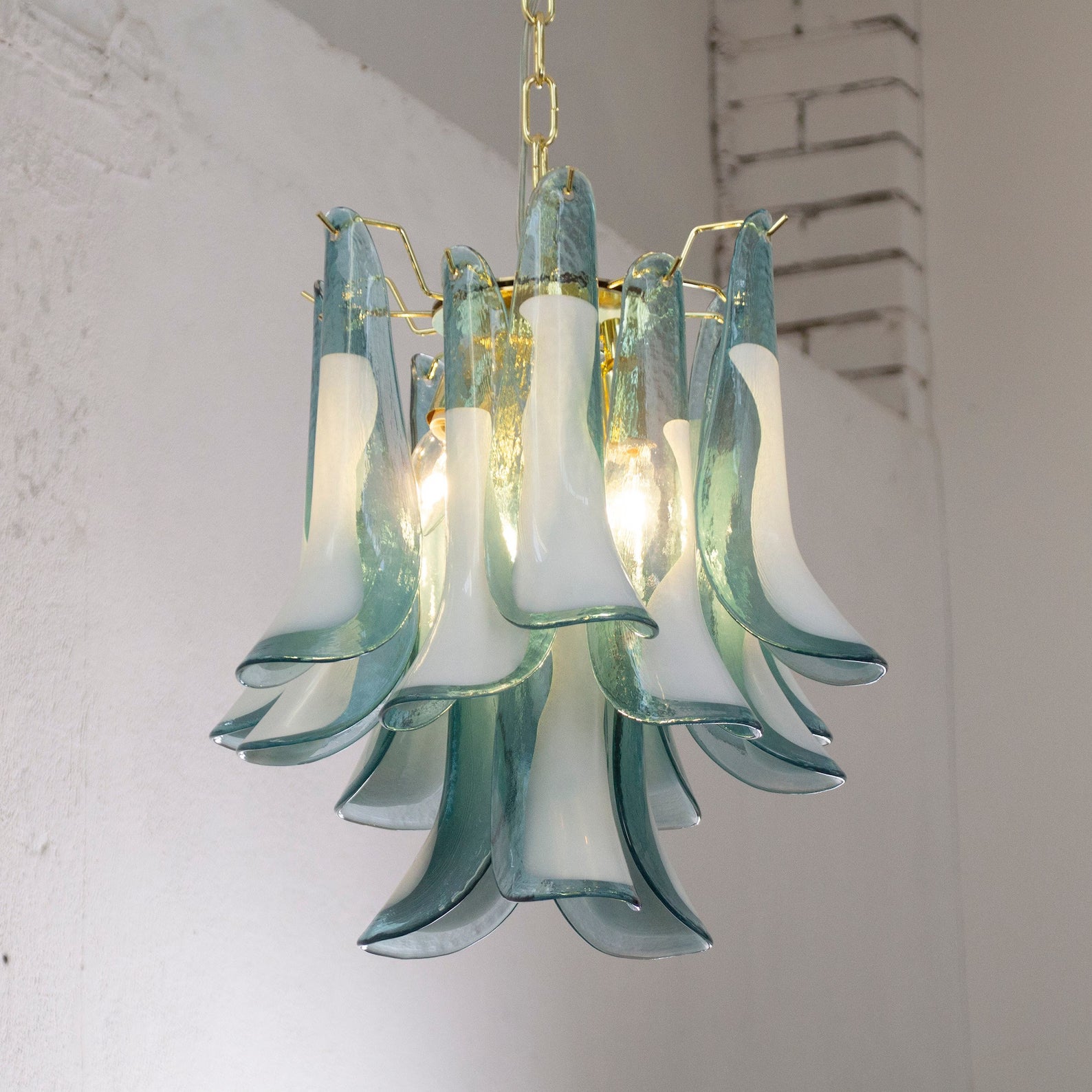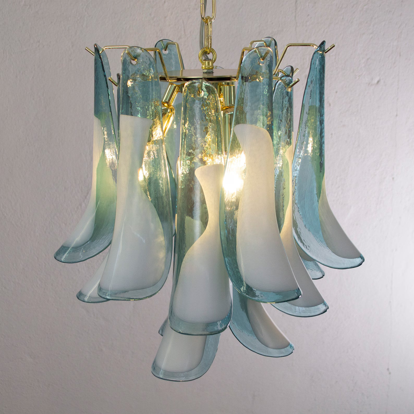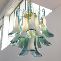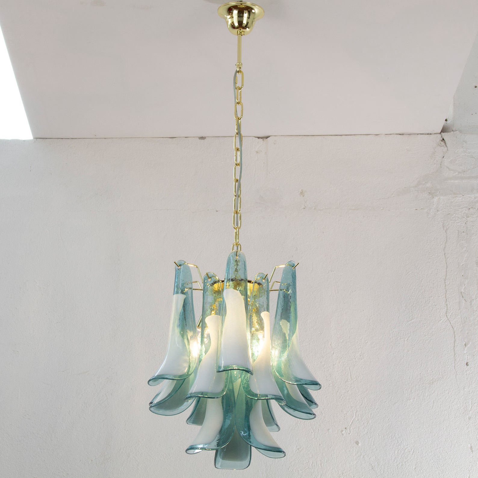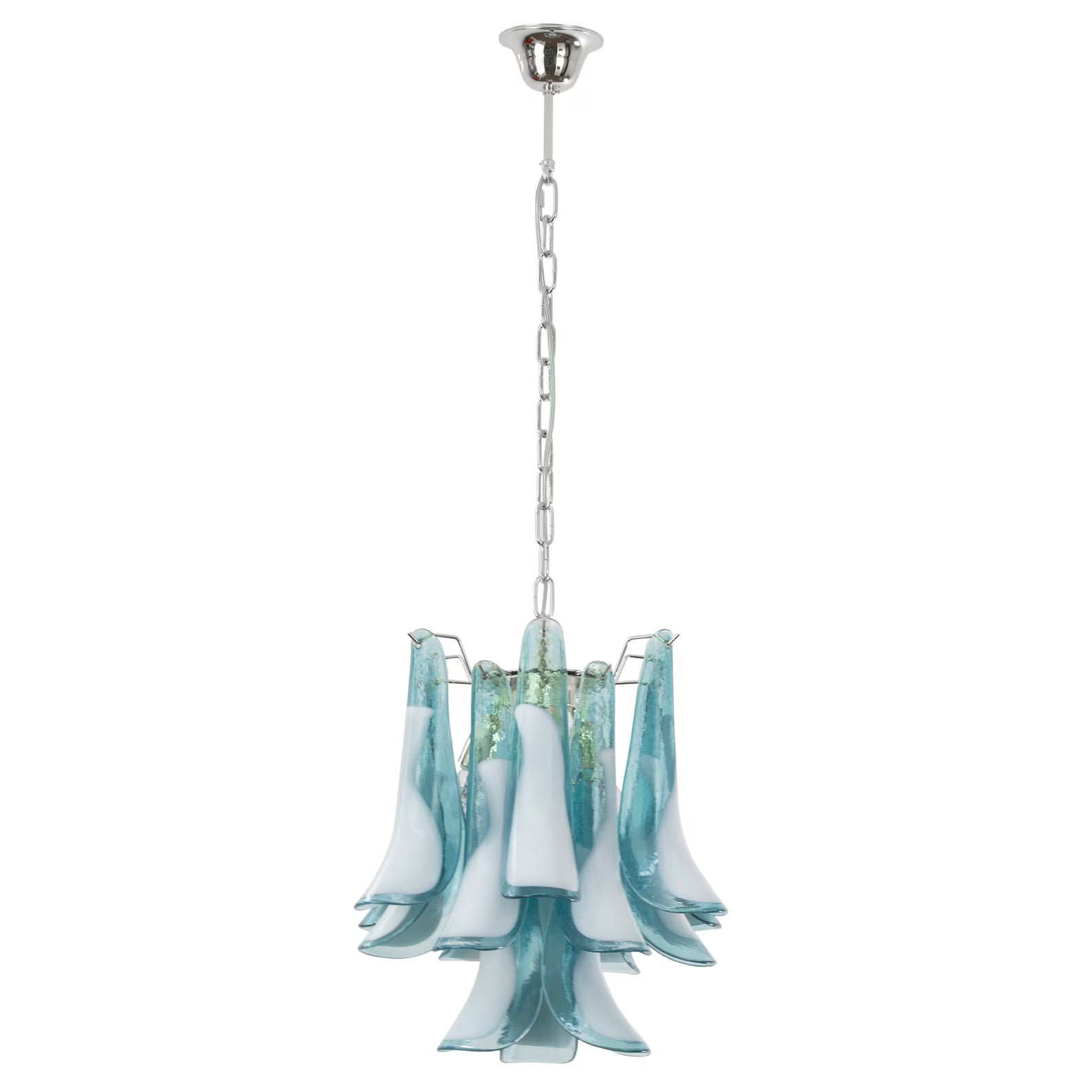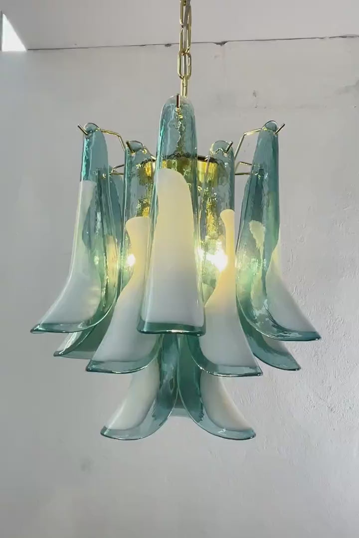 Spesifikasjoner: • Håndlaget i Murano, Italia • Farge: Teal blue med hvite detaljer • Dimensjoner: Ø45 × H42 cm + justerbar kjetting (opptil 50 cm) • Dekorative elementer: 15 glassblader + reservedel inkludert • Ramme: Messing eller nikkel • Lyskilder: 3 × E12/E14 (ikke inkludert) • Vekt: ca. 12 kg