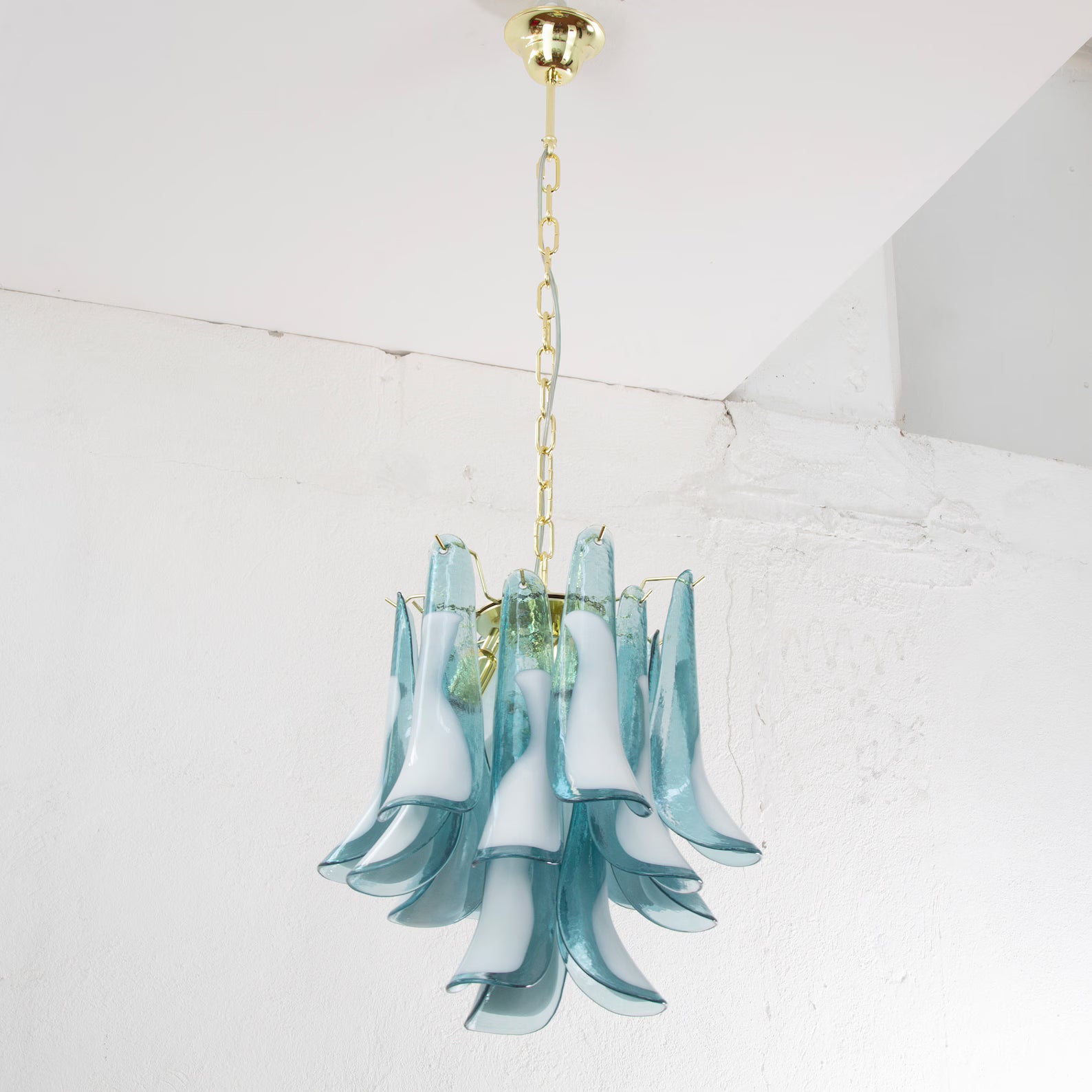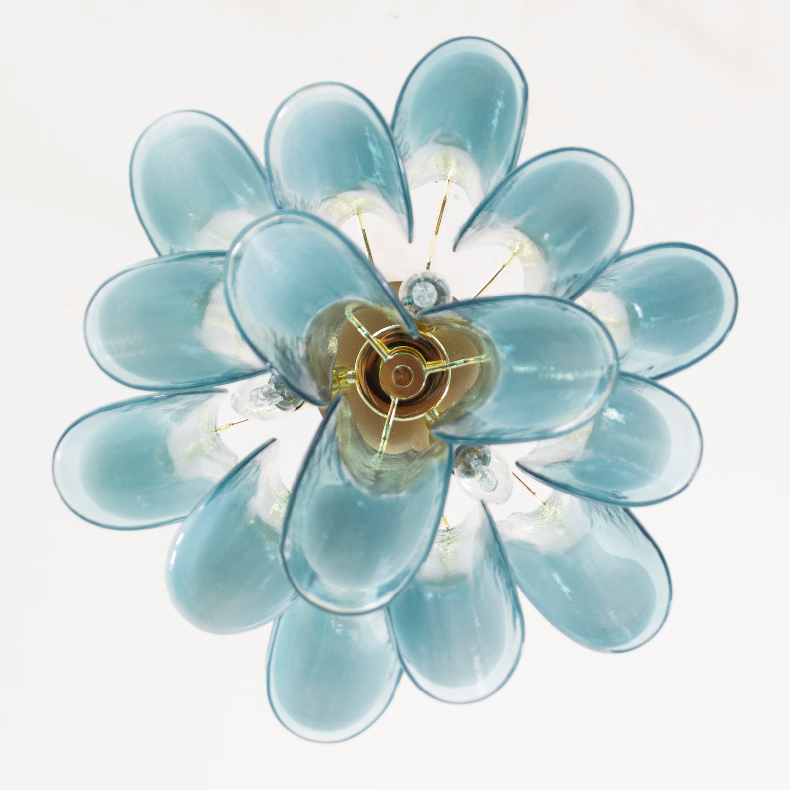 Murano Petali Chandelier Ø45 består av 15 munnblåste glassblader i dyp tealblå Murano-glass med hvite detaljer i sentrum. Den to-lags formen gir et balansert, skulpturelt uttrykk, mens fargen tilfører rommet en eksklusiv og moderne karakter.