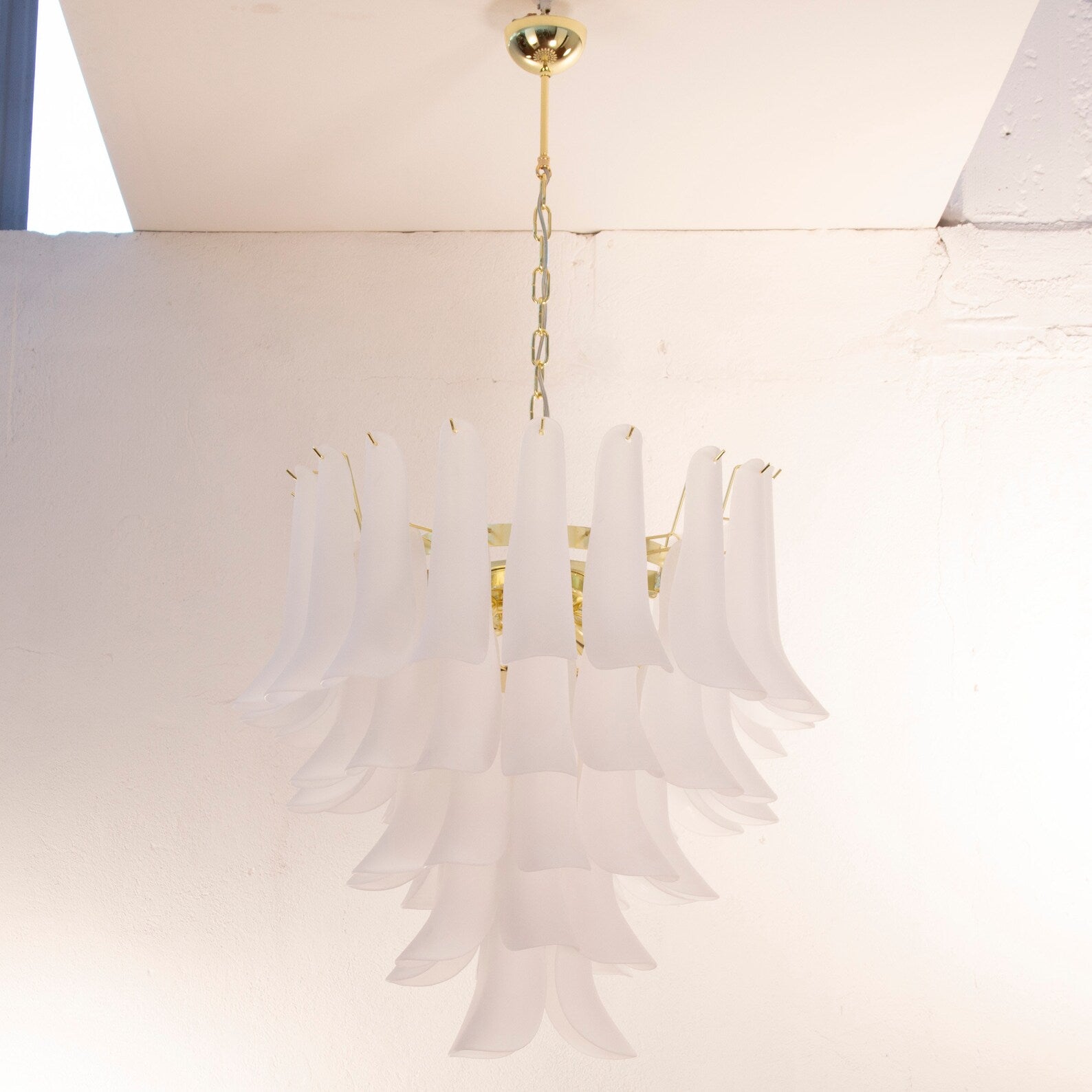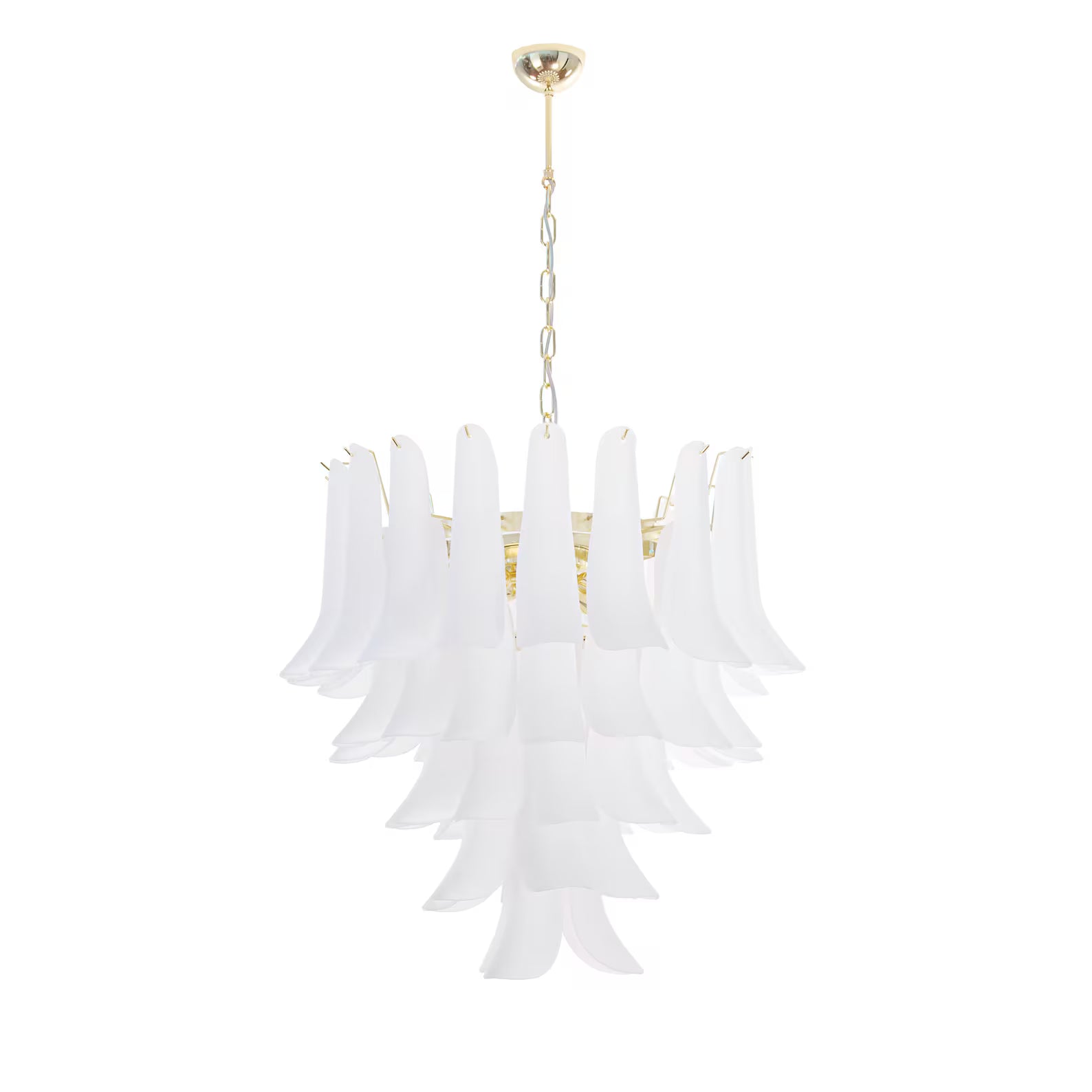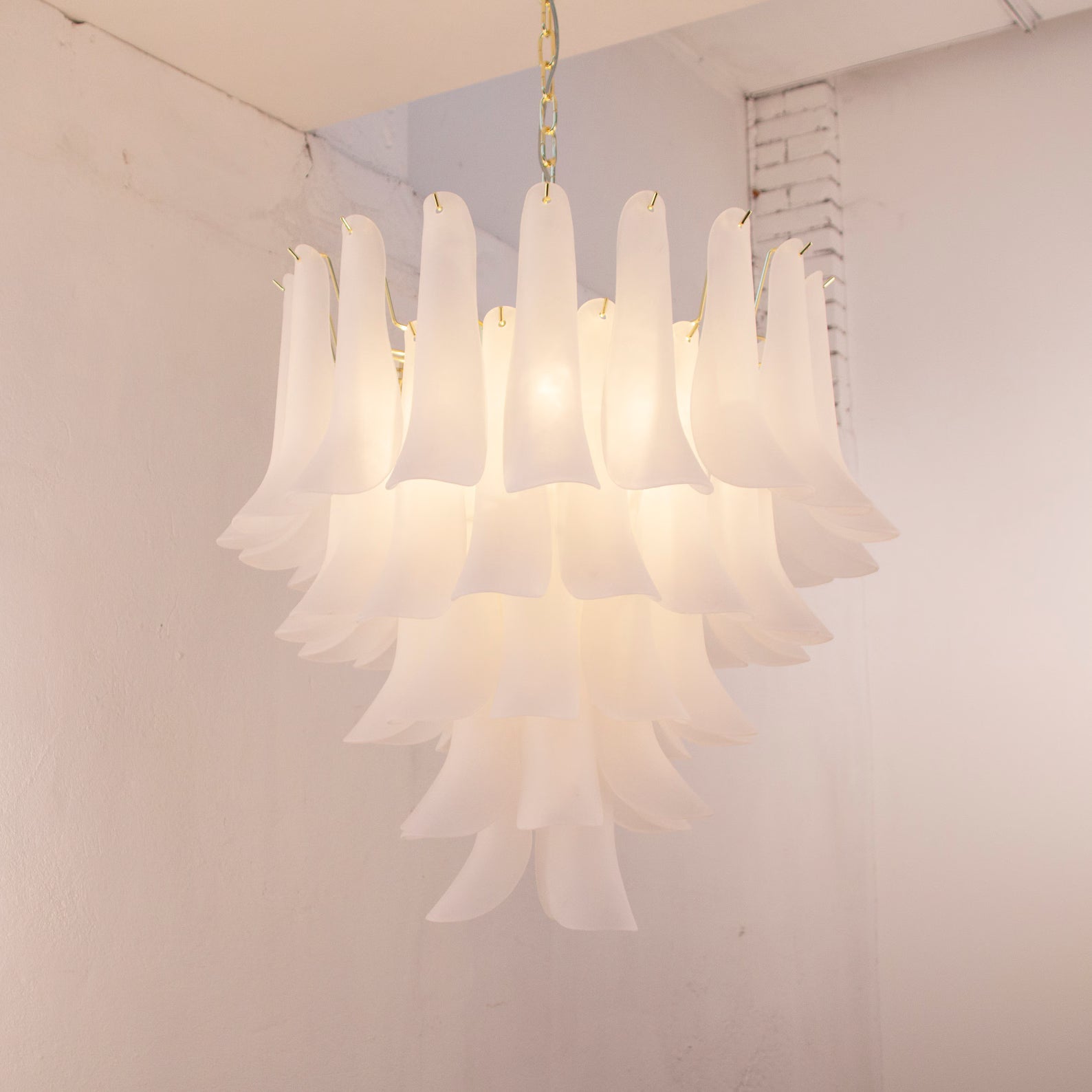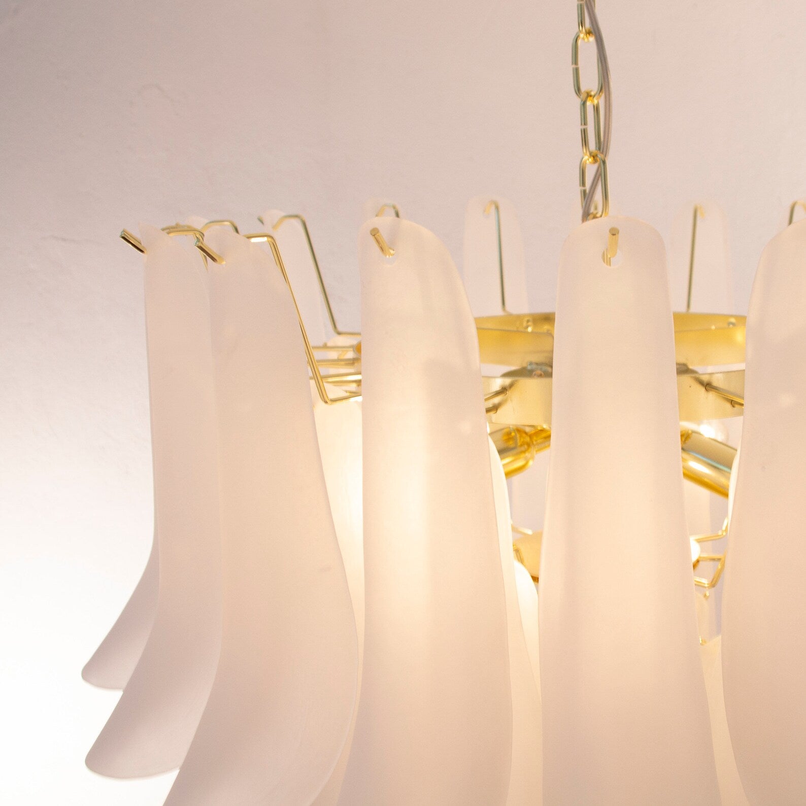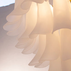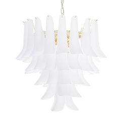 Murano Petali Chandelier Ø70 består av håndblåste glassblader i frostet hvitt Murano-glass, arrangert i fem nivåer som danner en skulpturell og myk silhuett. Hver petalo reflekterer lyset med en diskret glød, og skaper en følelse av luksus og ro i rommet.