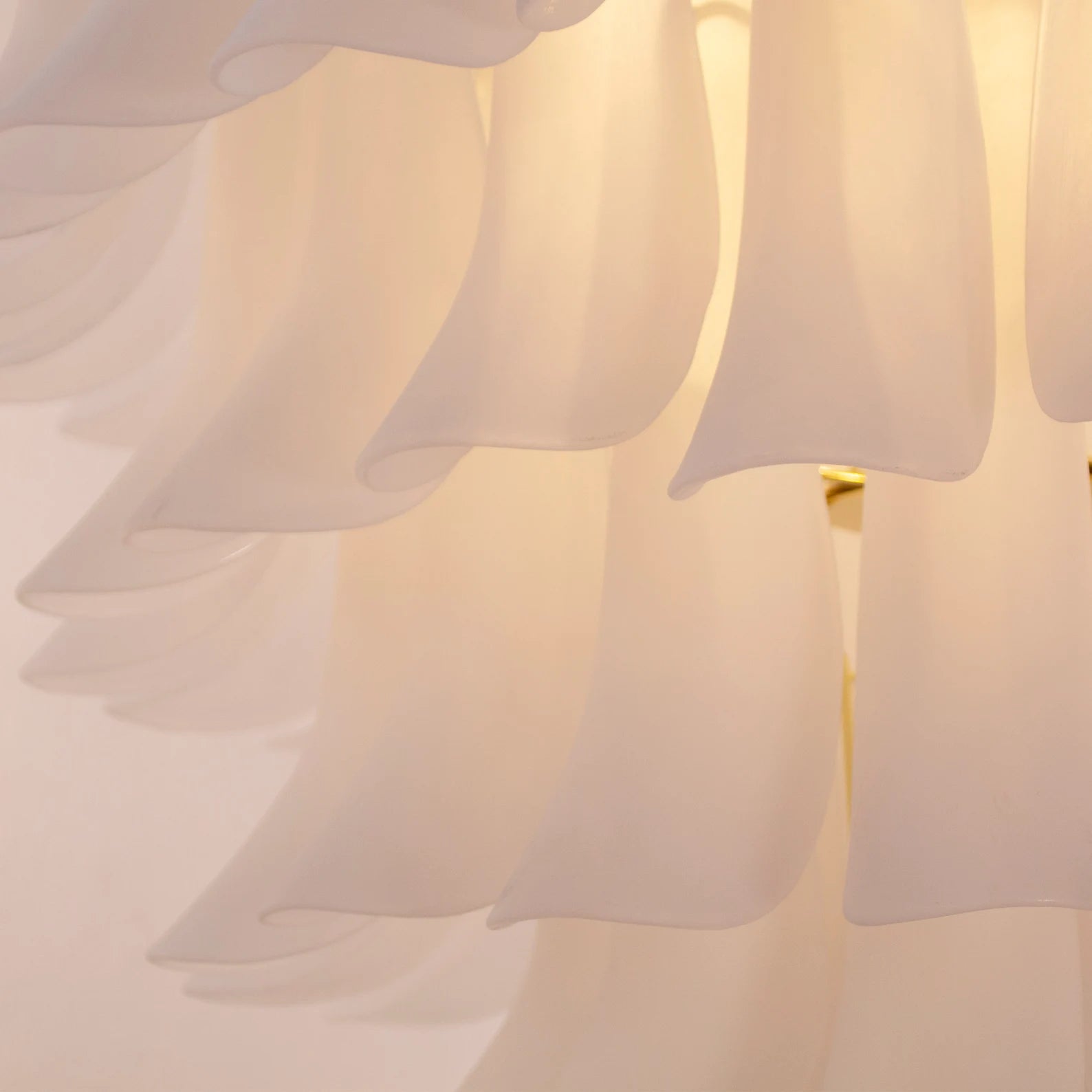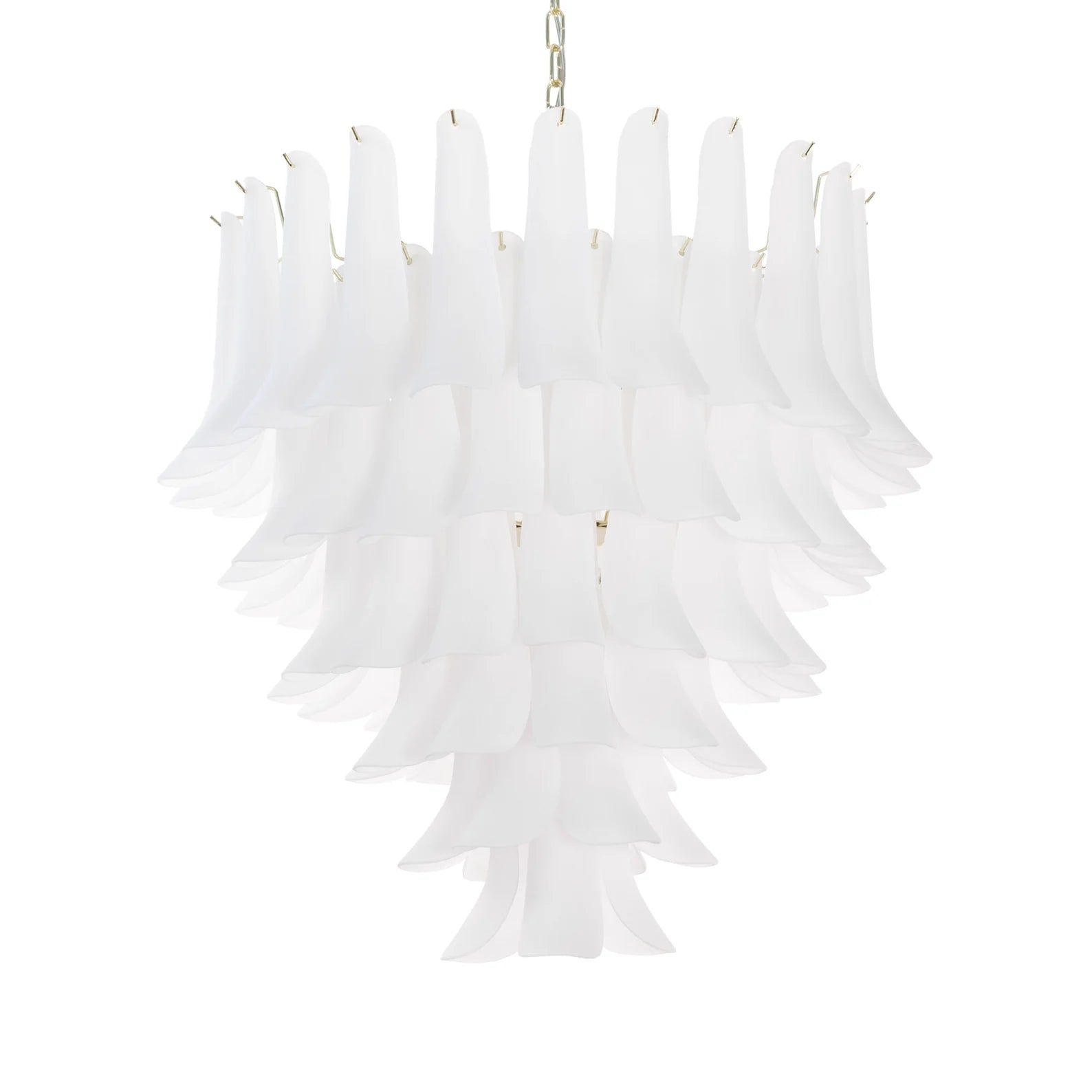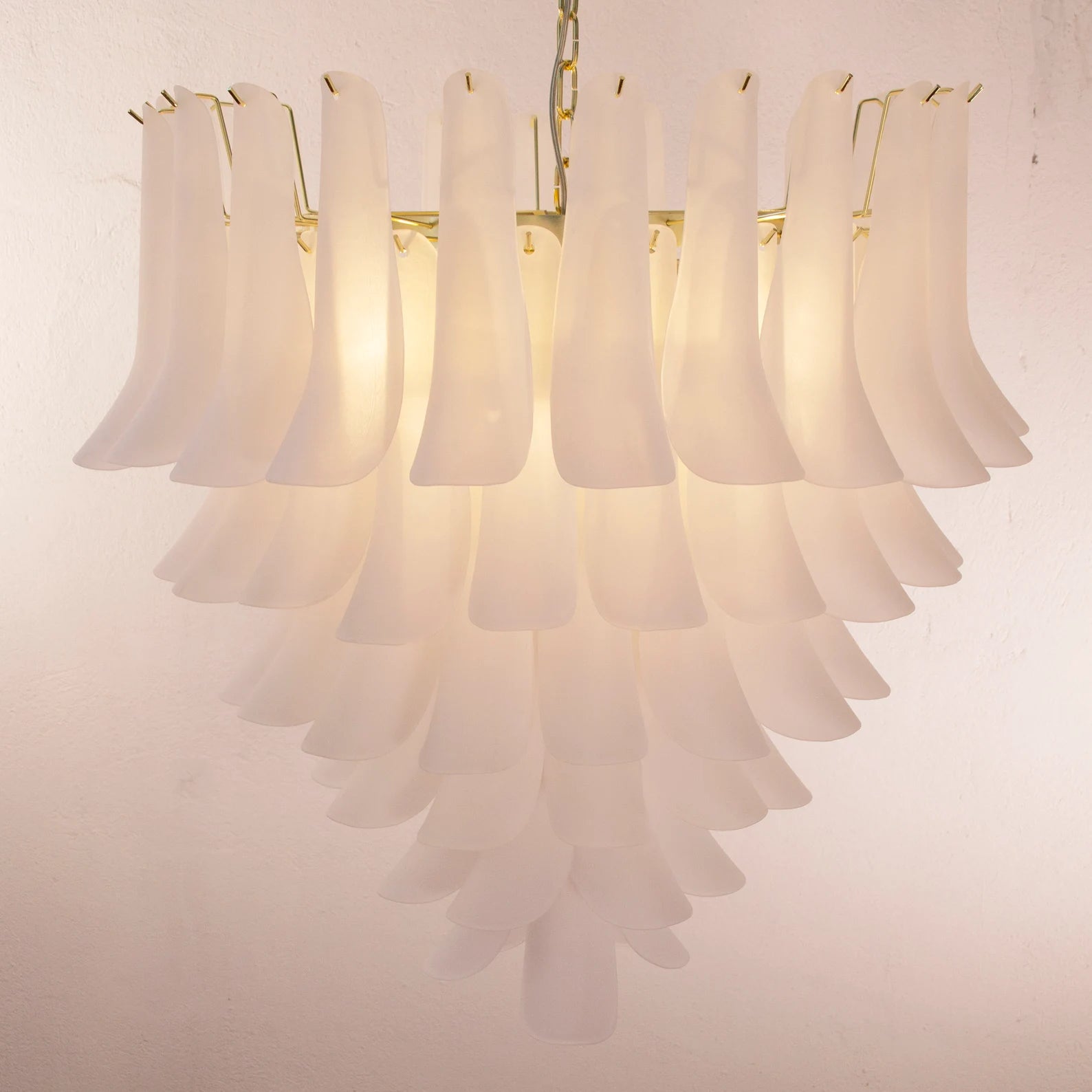 Murano Petali Chandelier Ø80 er håndlaget i Murano, Italia, og består av 75 munnblåste glassblader i frostet hvitt glass med delikate hvite detaljer i sentrum. Arrangert i seks nivåer, danner de en harmonisk og skulpturell form som sprer et mykt, luksuriøst lys.