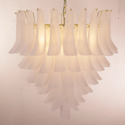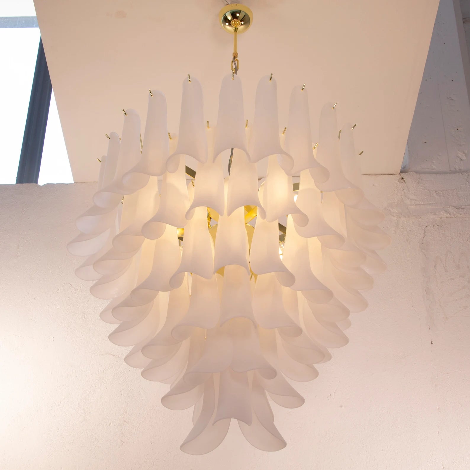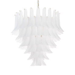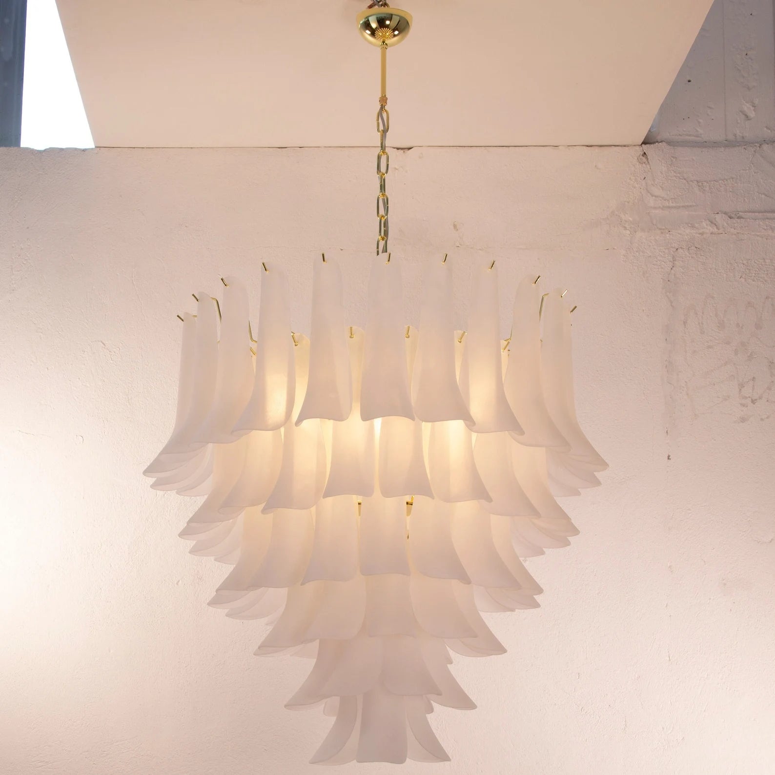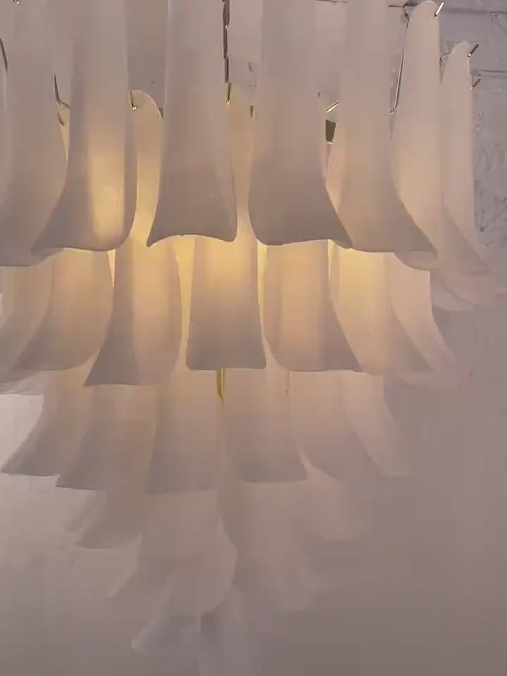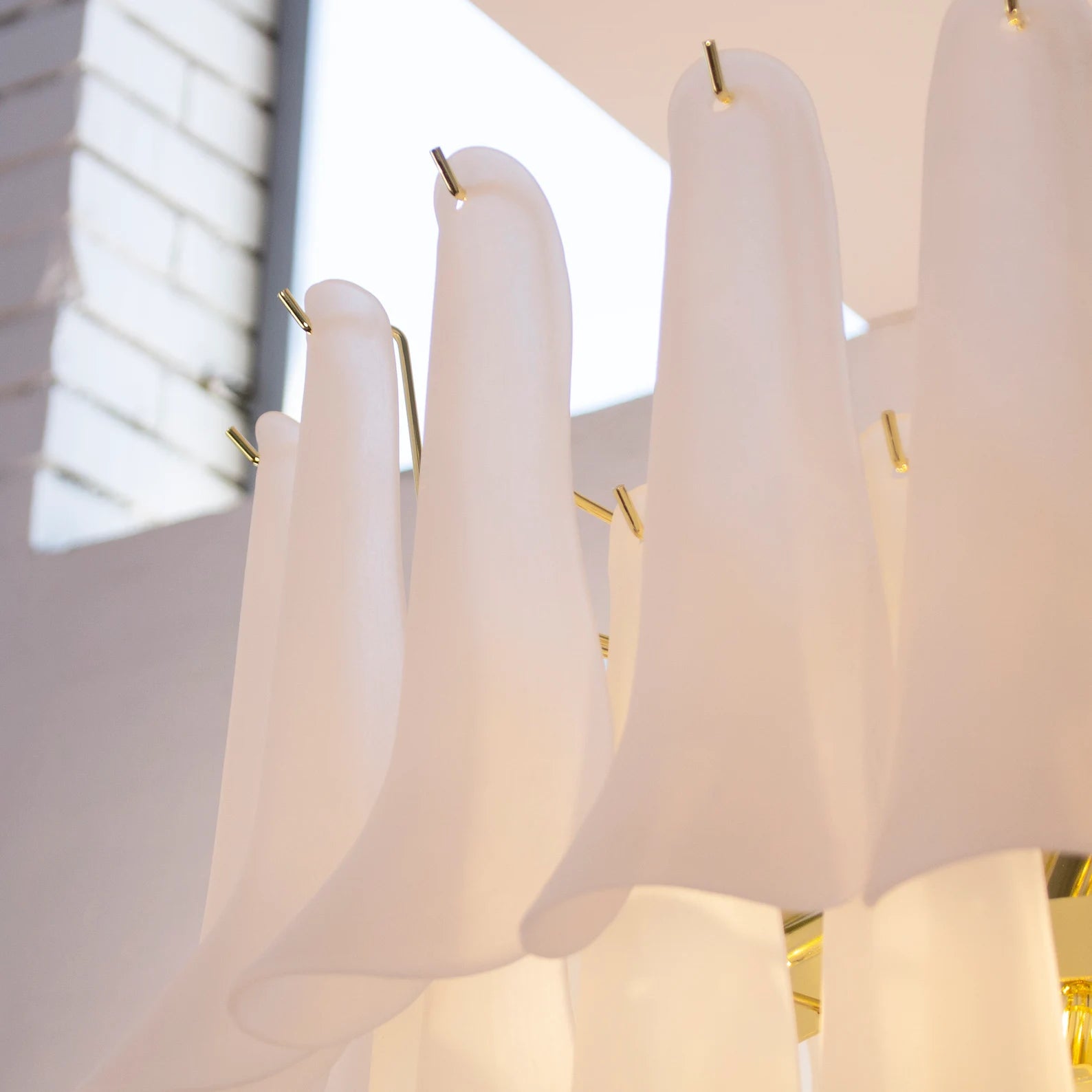 Murano Petali Chandelier Ø80 er håndlaget i Murano, Italia, og består av 75 munnblåste glassblader i frostet hvitt glass med delikate hvite detaljer i sentrum. Arrangert i seks nivåer, danner de en harmonisk og skulpturell form som sprer et mykt, luksuriøst lys.