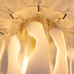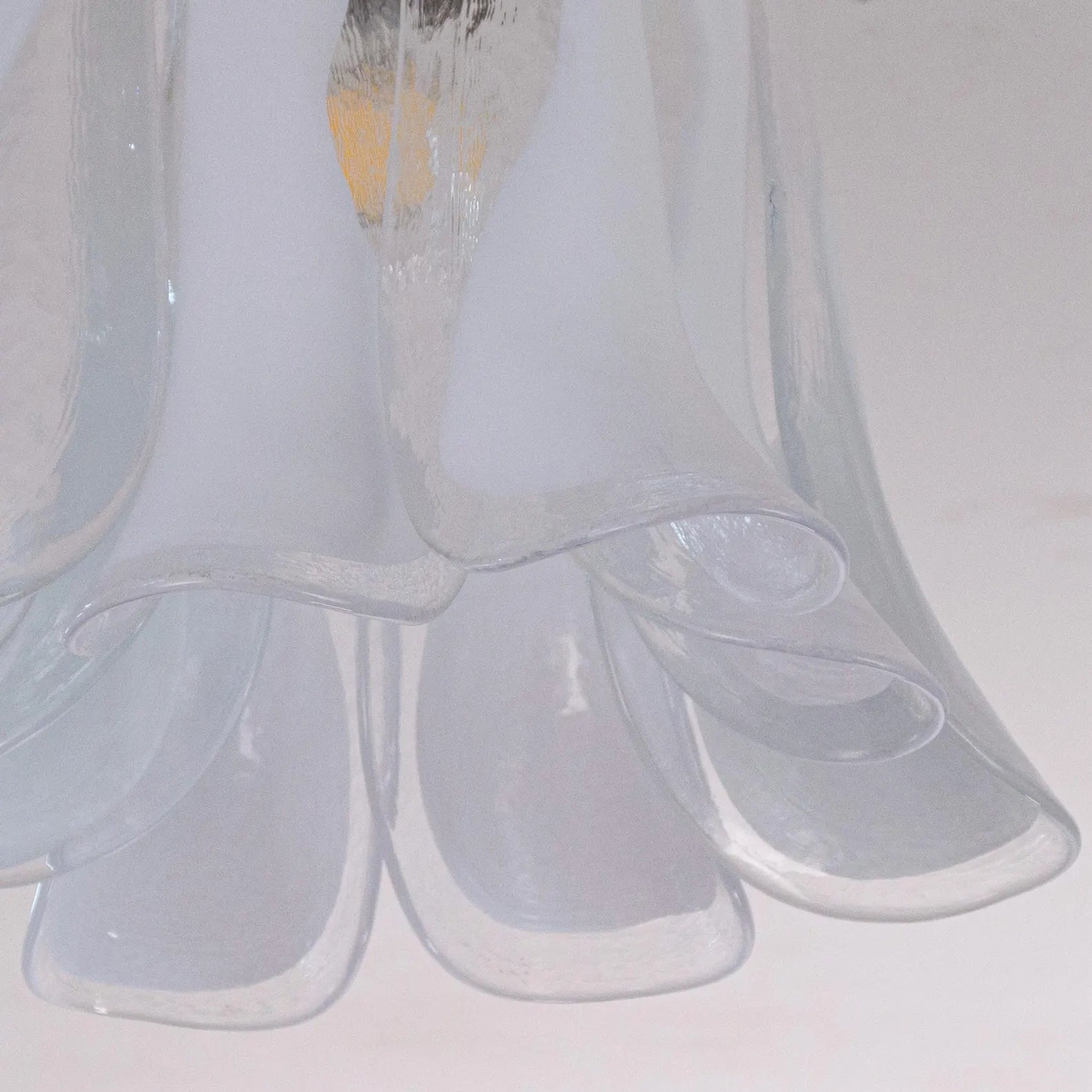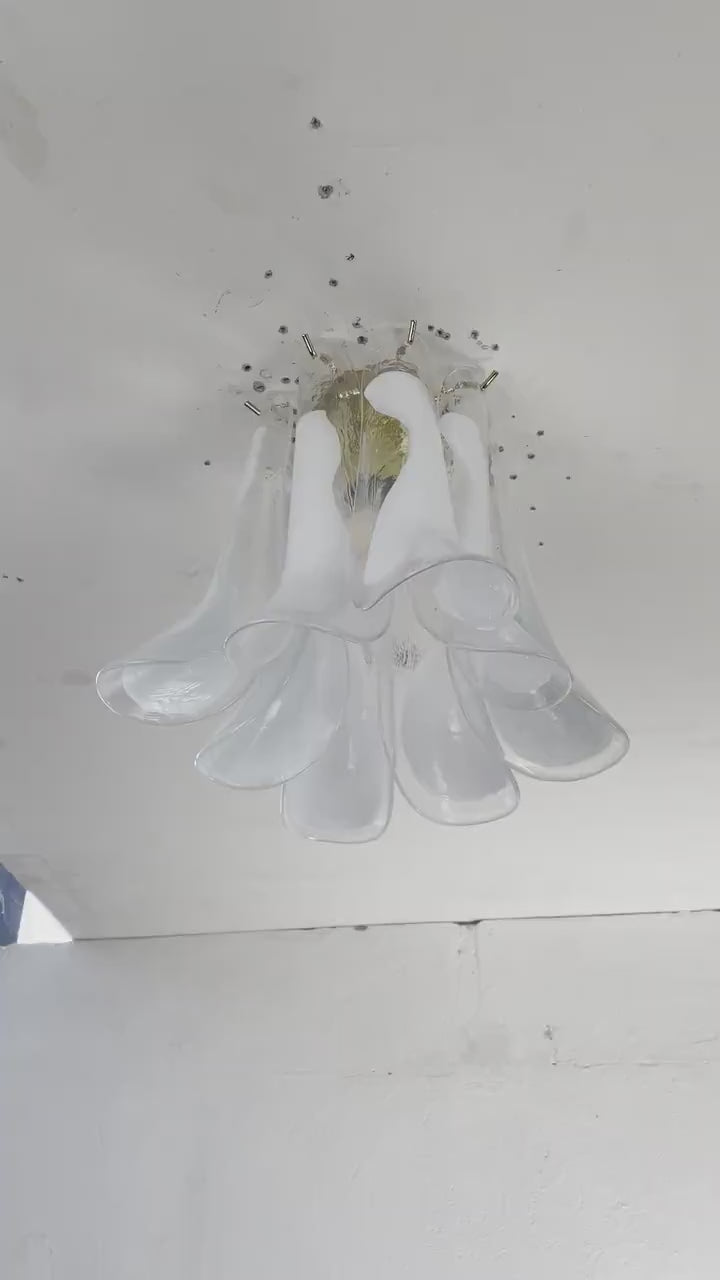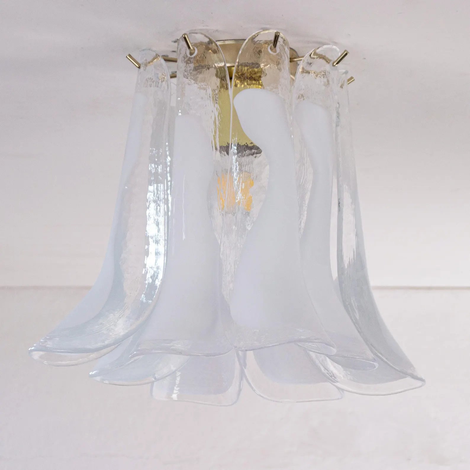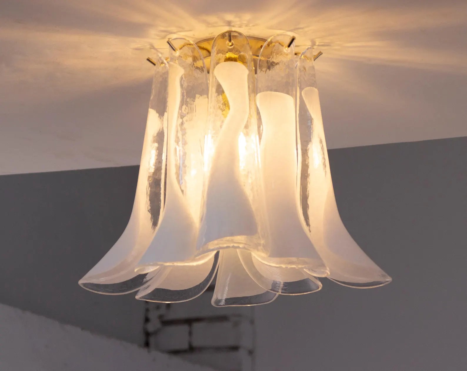 Murano Petali Flush Chandelier Ø35 består av åtte munnblåste glasselementer formet som blomsterblader. Kombinasjonen av klart og hvitt Murano-glass gir et mykt og luksuriøst lys som passer perfekt i stuer, soverom eller entreer.