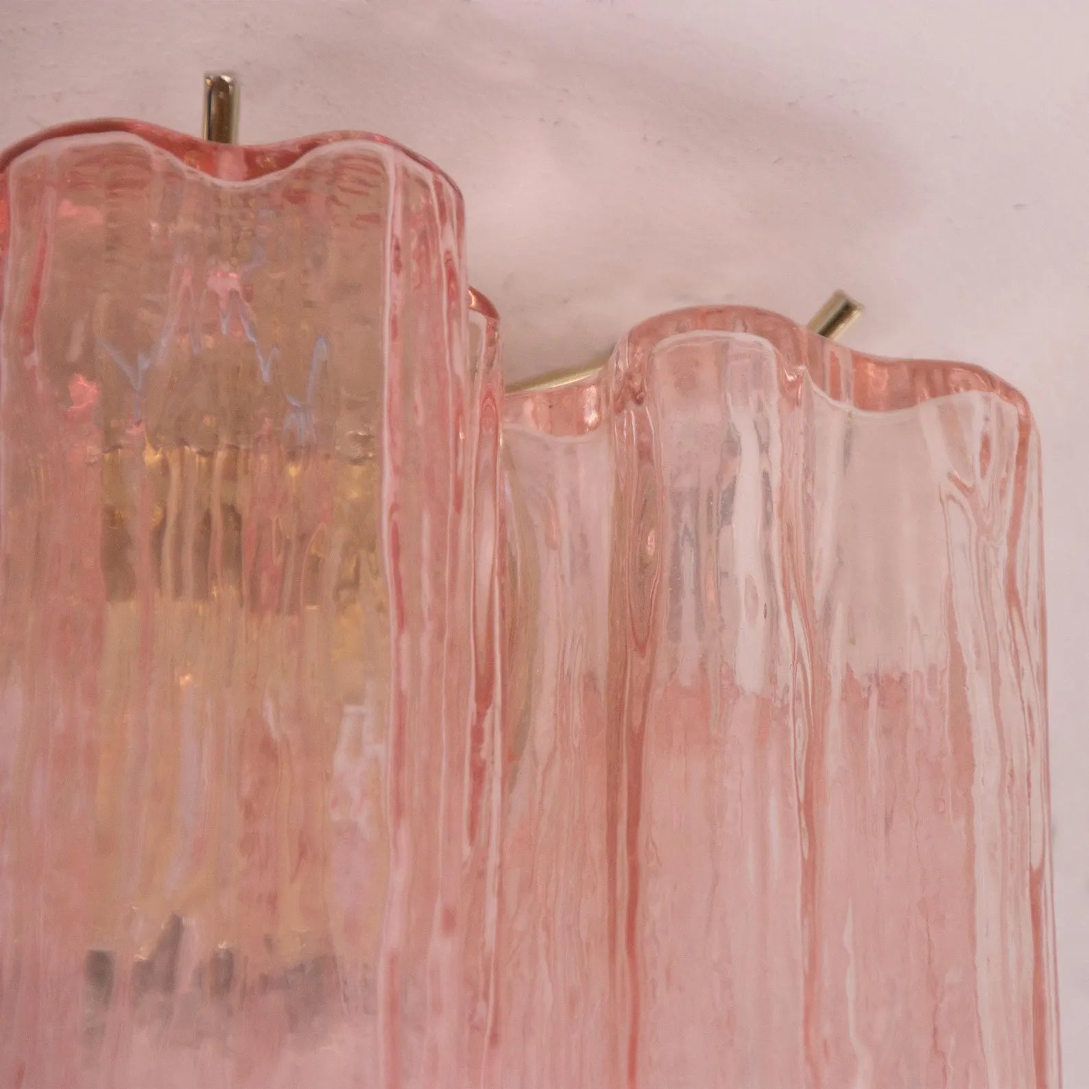Murano Pink Tronchi Ceiling Lamp Ø20 består av seks munnblåste glassrør i rosafarget Murano-glass. Den ikoniske Tronchi-formen, inspirert av barkstrukturer, gir et varmt og skulpturelt uttrykk med et moderne preg.