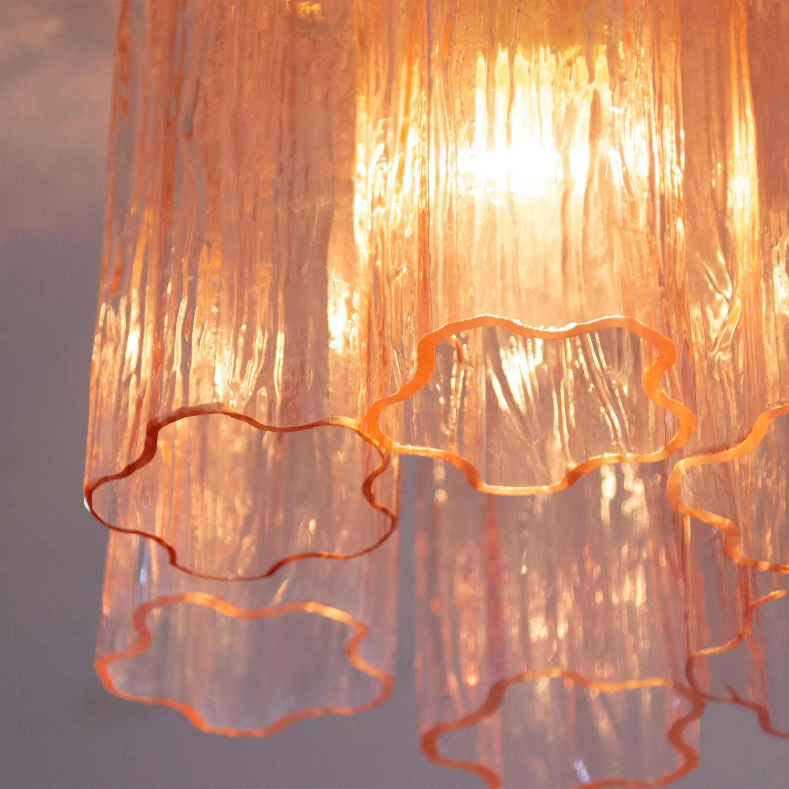 Spesifikasjoner: • Håndlaget i Murano, Italia • Farge: Pink (andre farger på forespørsel) • Dimensjoner: Ø20 × H23 cm • Dekorative elementer: 6 glassrør • Ramme: Messing eller nikkel • Lyskilde: 1 × E12/E14 (ikke inkludert)
