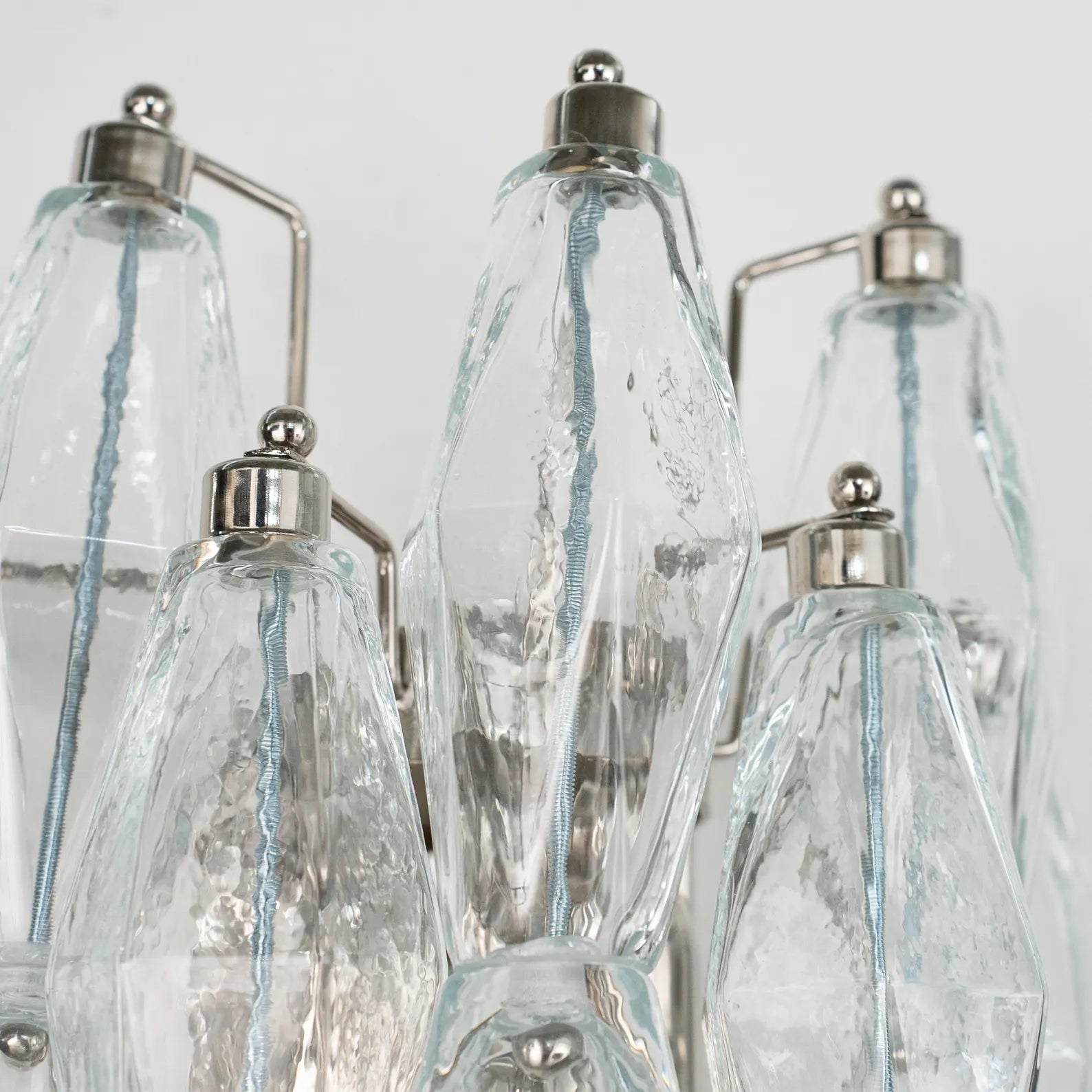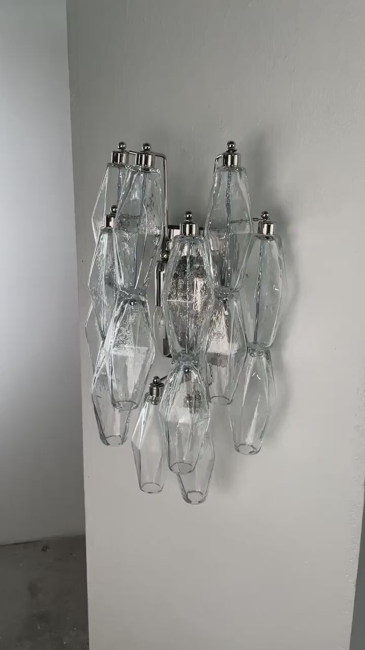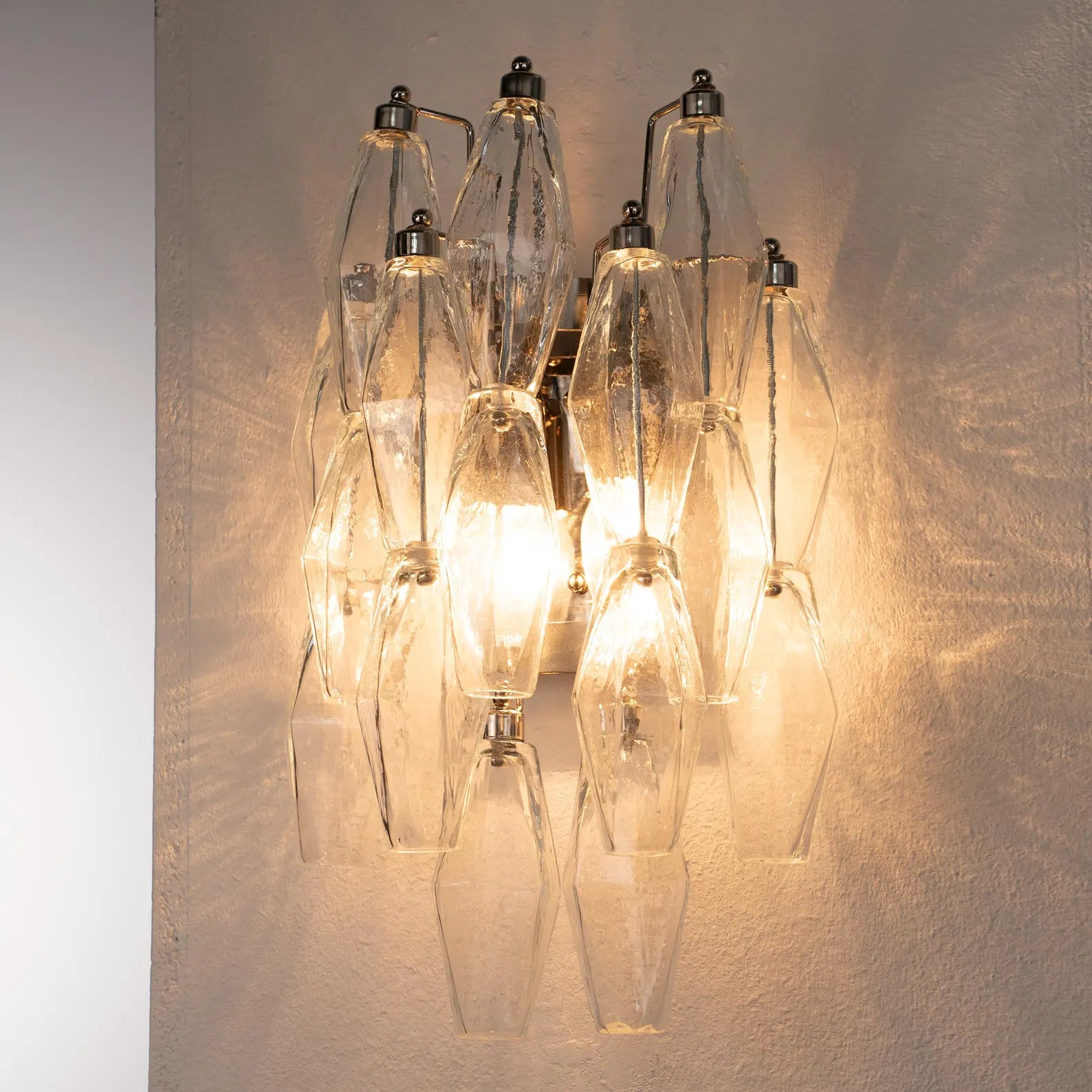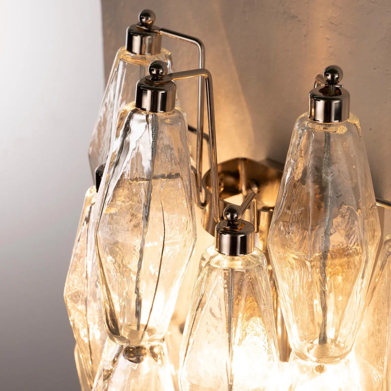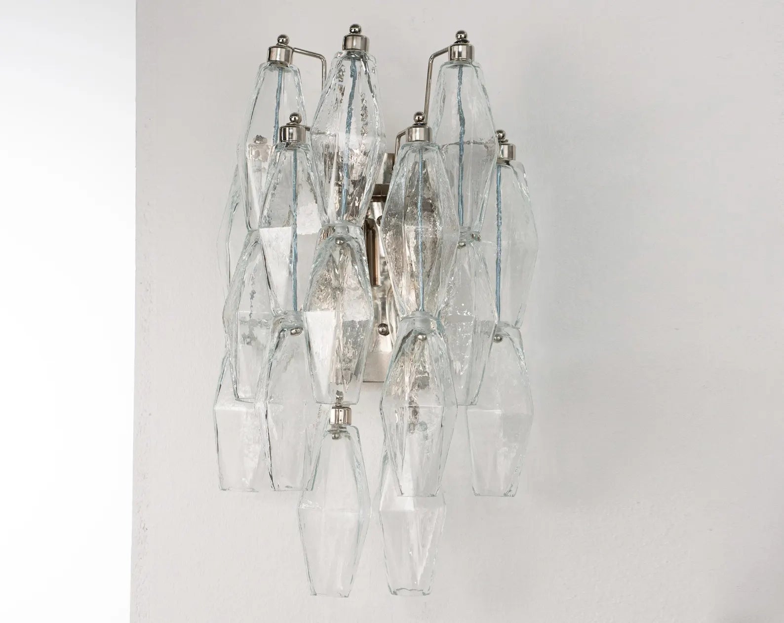 Murano Poliedri Wall Sconce i Clear (Sett á 2) kombinerer klassisk italiensk glasskunst med et moderne og eksklusivt uttrykk. Hver lampe består av 16 munnblåste poliedri-glass i klar tone som gir et varmt og atmosfærisk lys. Rammen i messing eller nikkel gir lampen et sofistikert og tidløst preg som passer i både moderne og klassiske hjem.
