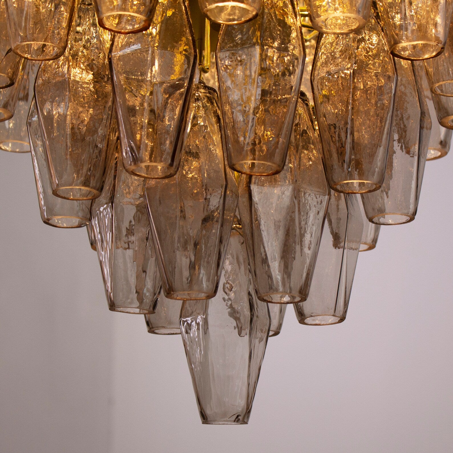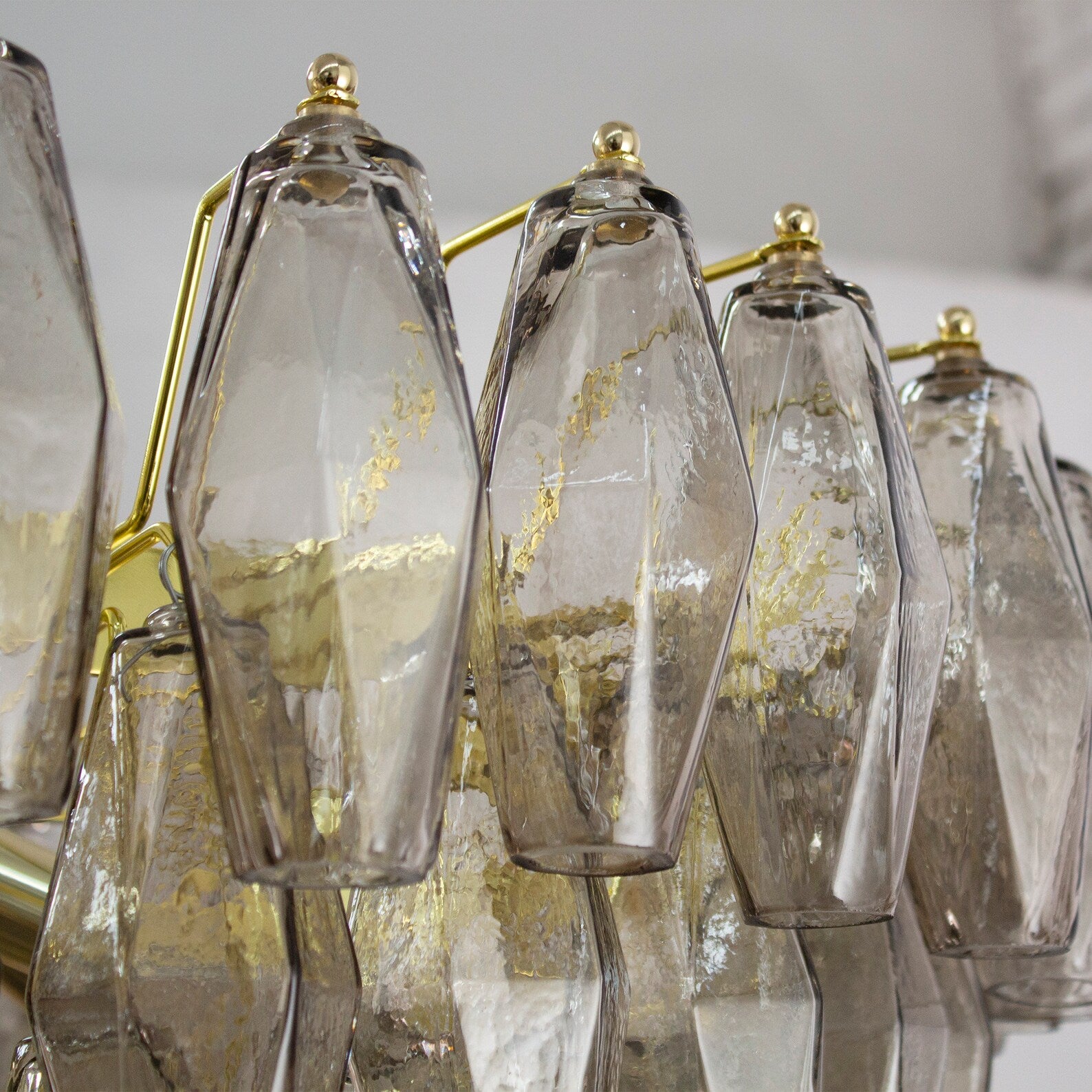 Murano Poliedri Chandelier Ø75 består av 143 munnblåste glasspolyedre i røykfarget Smoke Murano-glass. Hver polyeder reflekterer lyset med en dyp og sofistikert glød, mens den geometriske formen gir et moderne, men klassisk uttrykk. Den varme gråtonen skaper en perfekt balanse mellom luksus og minimalisme – ideell for både moderne og klassiske interiører.