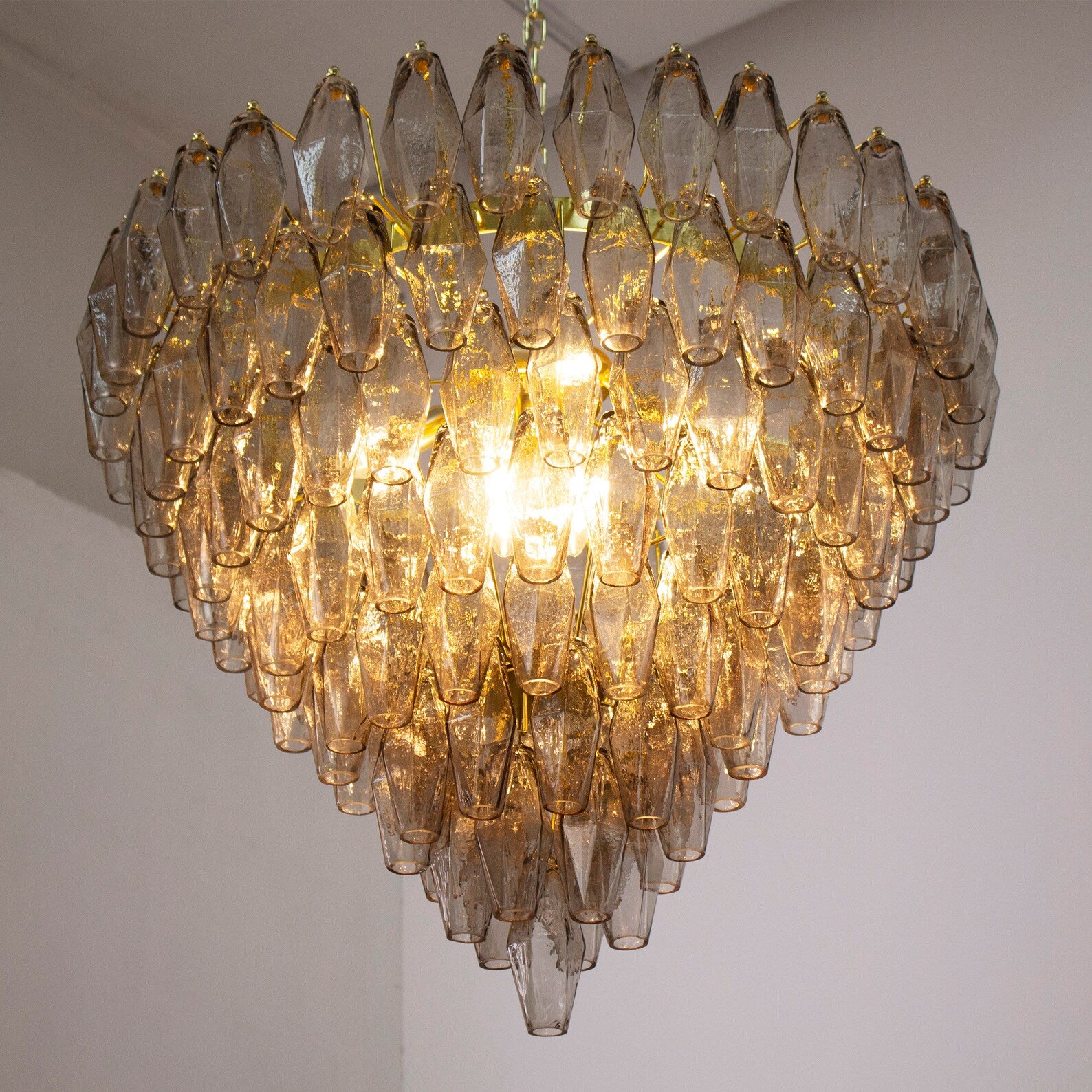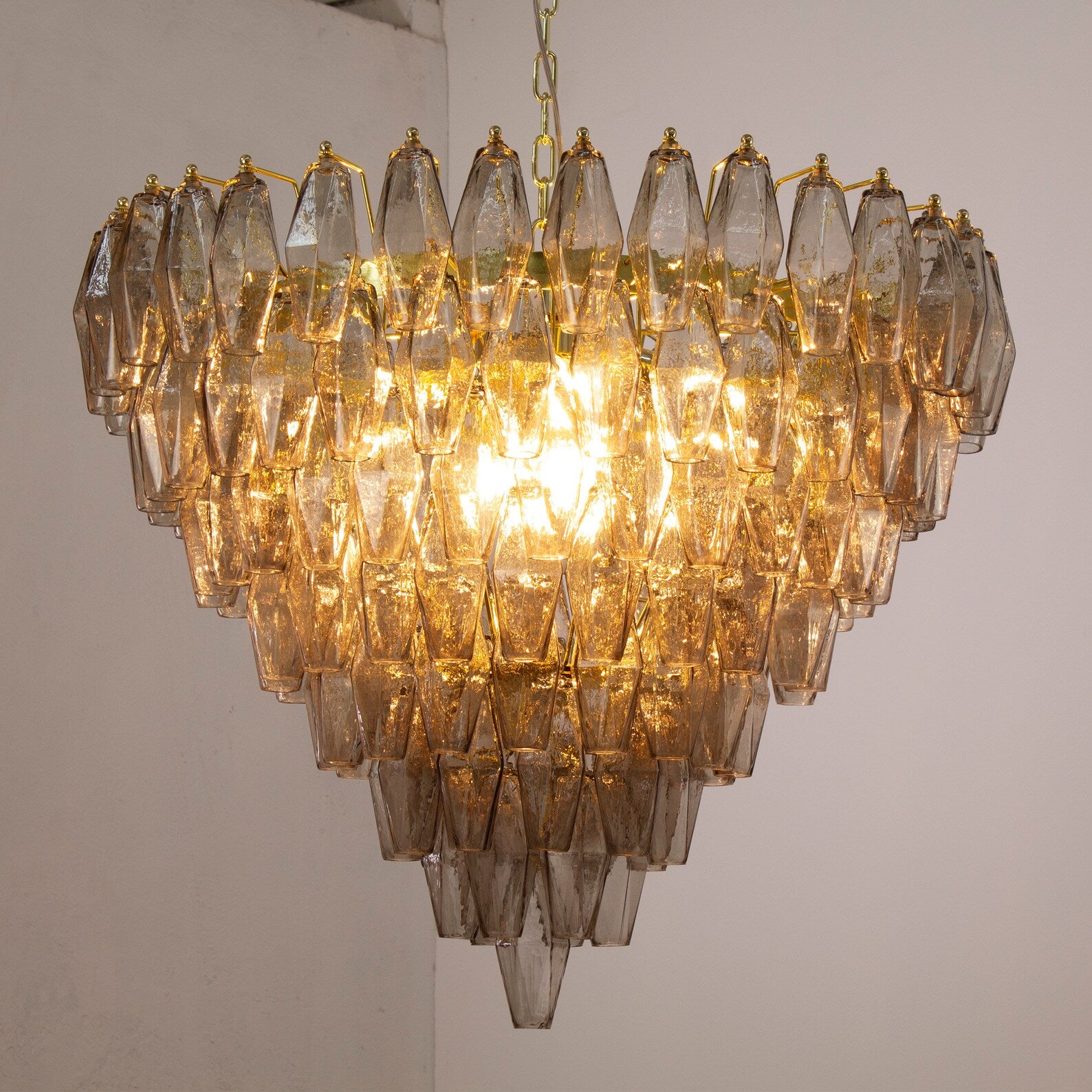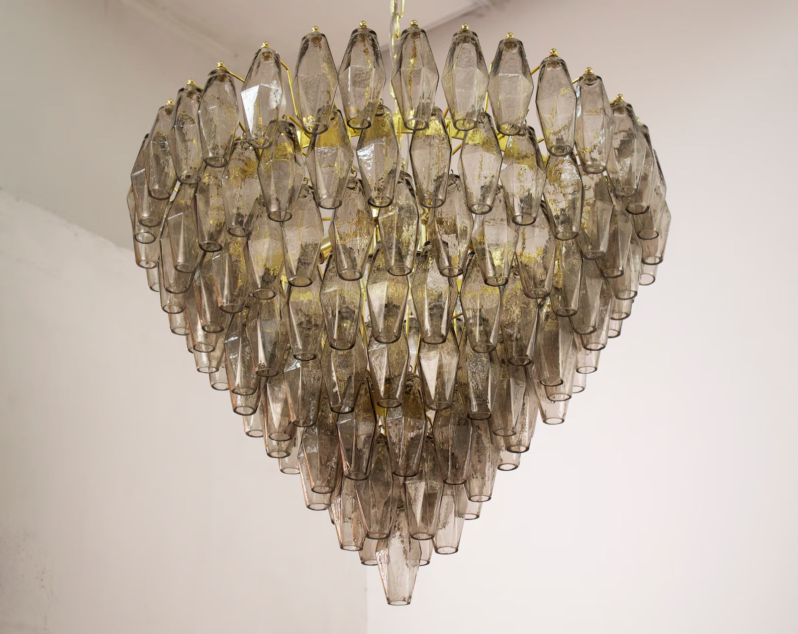 Spesifikasjoner: • Håndlaget i Murano, Italia • 143 glasspolyedre + reservedel inkludert • Farge: Smoke (andre farger på forespørsel) • Størrelse: Ø75 × H75 cm • Vekt: ca. 35 kg • Materialer: Blåst glass, messing/stål • Ramme: Nikkel eller messing (valgbar finish) • Lyskilder: 8 × E12/E14 (ikke inkludert) • Rammen leveres ferdig montert – glass henges på ved mottak • Kjetting og takrosett inkludert