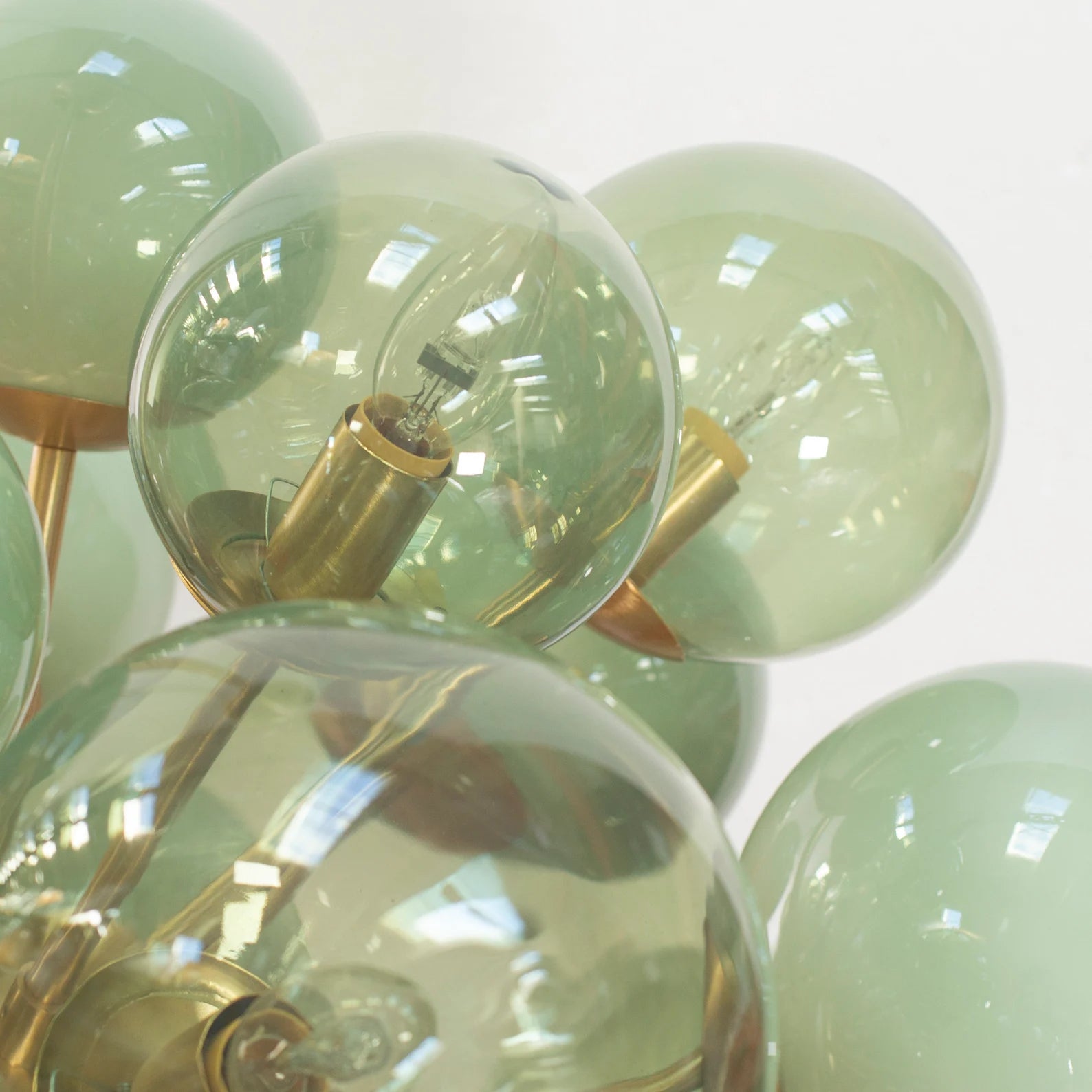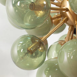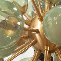 Spesifikasjoner: • Håndlaget i Murano, Italia • 32 munnblåste glasskuler i ulike grønntoner • Størrelse: Ø90 × H100 cm • Vekt: ca. 25 kg • Materialer: Blåst glass, stål og messing • Ramme: Børstet messing • Lyskilder: 32 × E12/E14 (ikke inkludert) • Leveringstid: ca. 5–6 uker