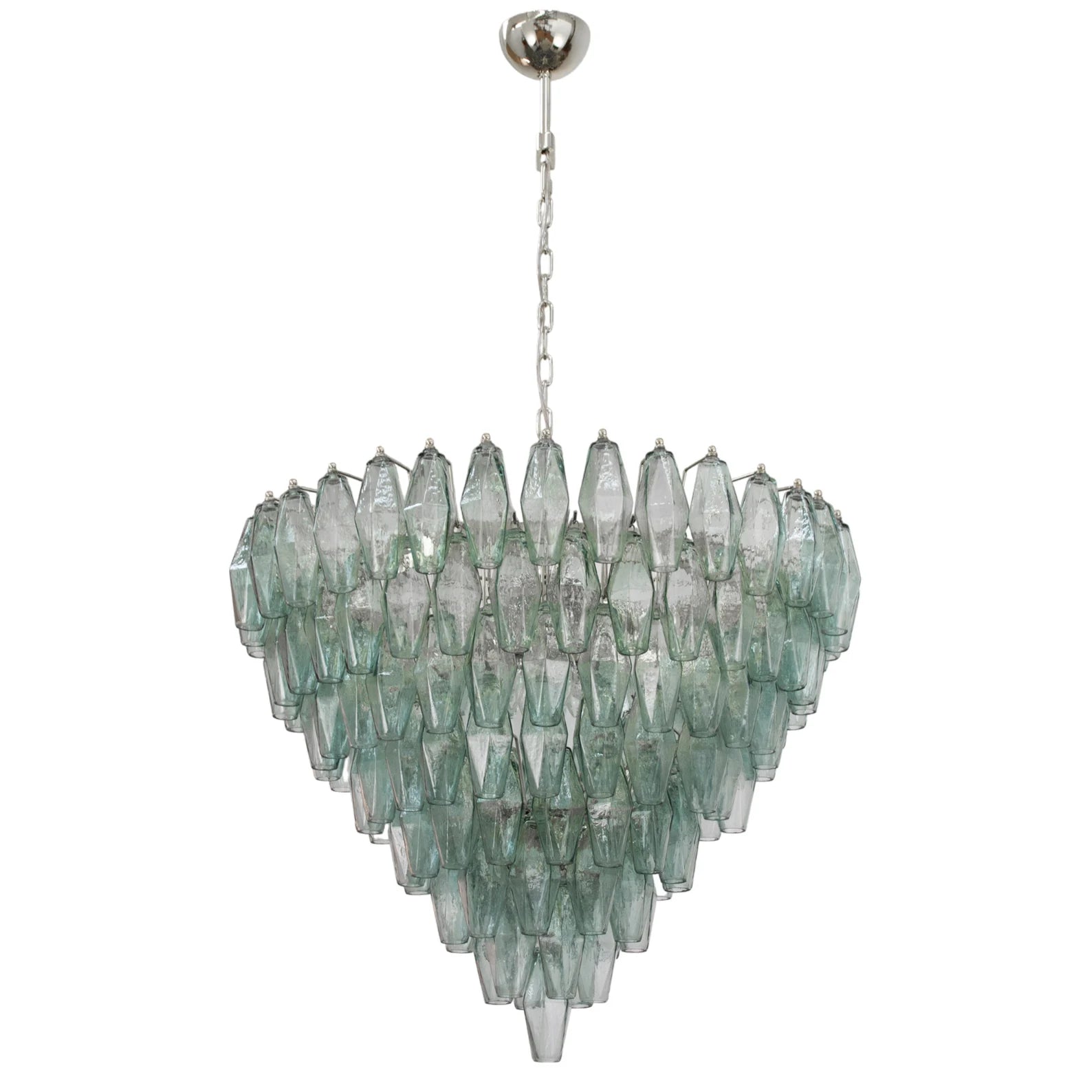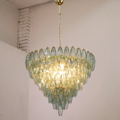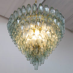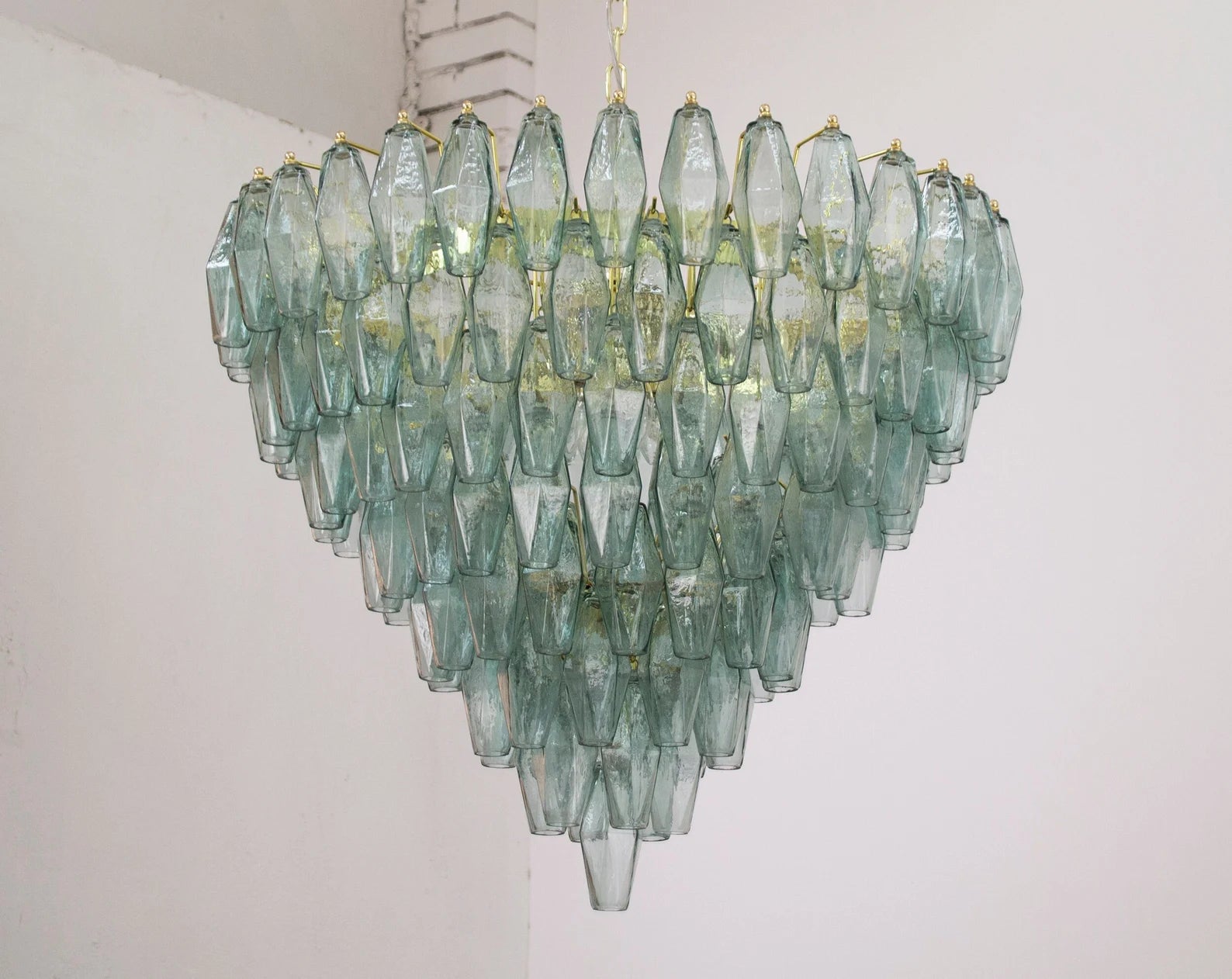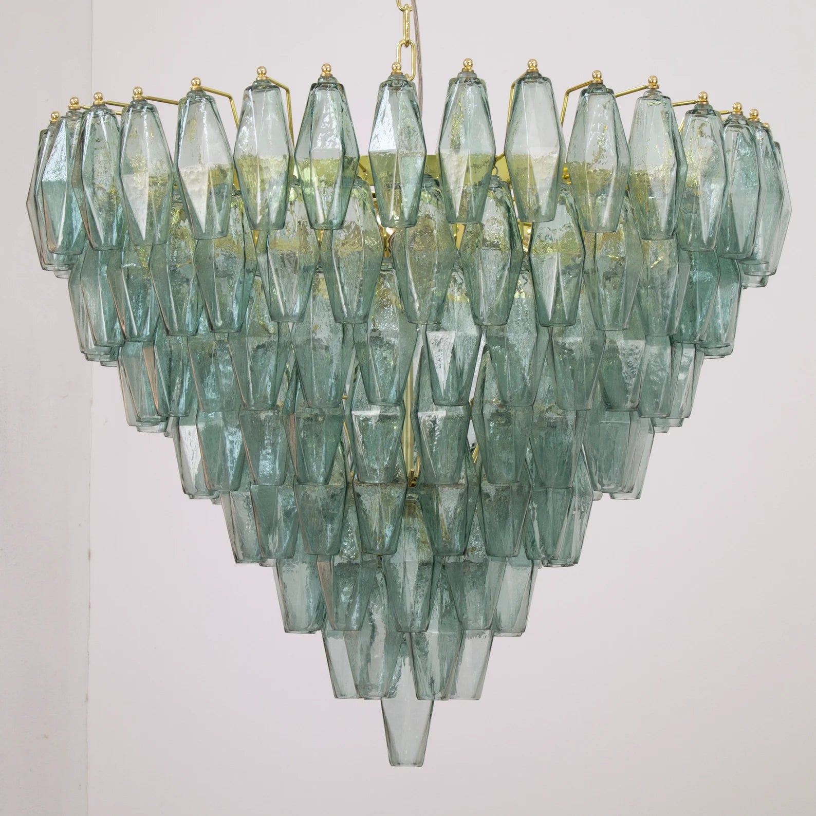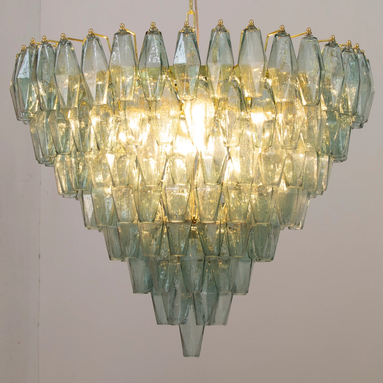 Spesifikasjoner: • Håndlaget i Murano, Italia • 143 glasspolyedre + reservedel inkludert • Farge: Verde Rialto (andre farger på forespørsel) • Størrelse: Ø75 × H75 cm • Vekt: ca. 35 kg • Materialer: Blåst glass, messing/stål • Ramme: Nikkel eller messing (valgbar finish) • Lyskilder: 8 × E12/E14 (ikke inkludert) • Rammen leveres ferdig montert – glass henges på ved mottak • Kjetting og takrosett inkludert